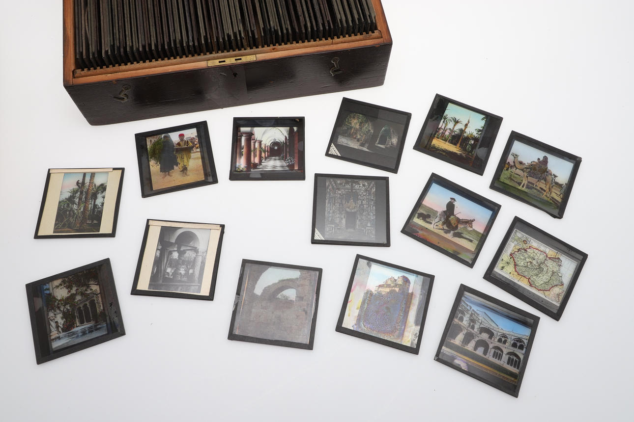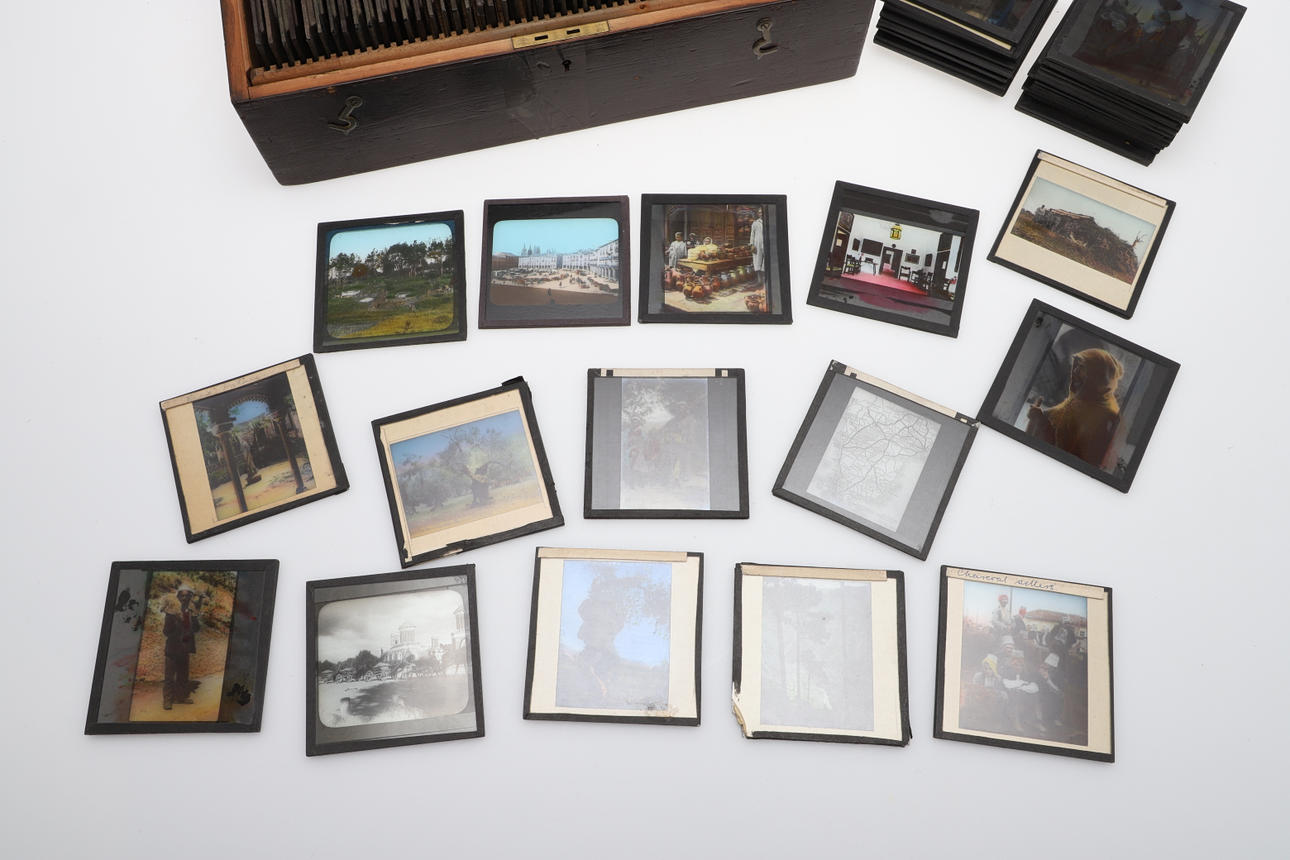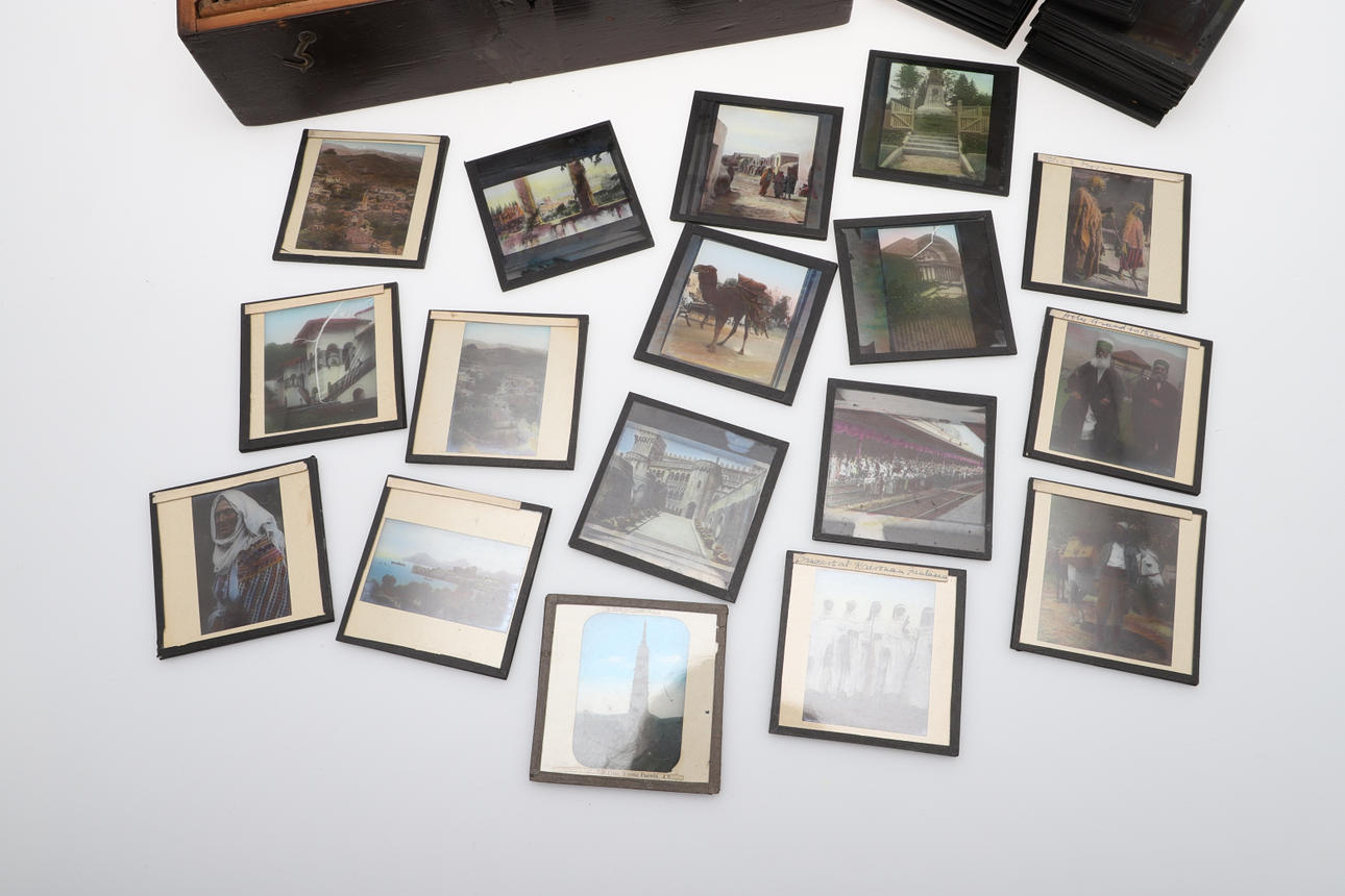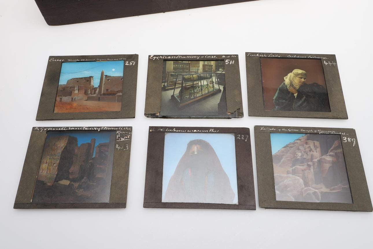 Including a wooden box with approx 50 glass slides relating to Egypt and others, all annotated and numbered including Three Mummies in Case - British Museum, The Square in Alexandria, Palace of Choubra, Nile, Abou Simbel, Section of the Great Pyramid etc. With another box with further glass lantern slides, varied subjects including Middle Eastern figures, China, buildings and other subjects.