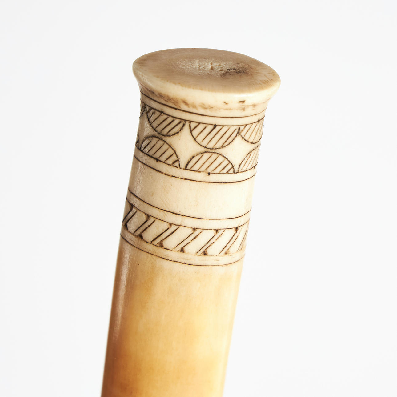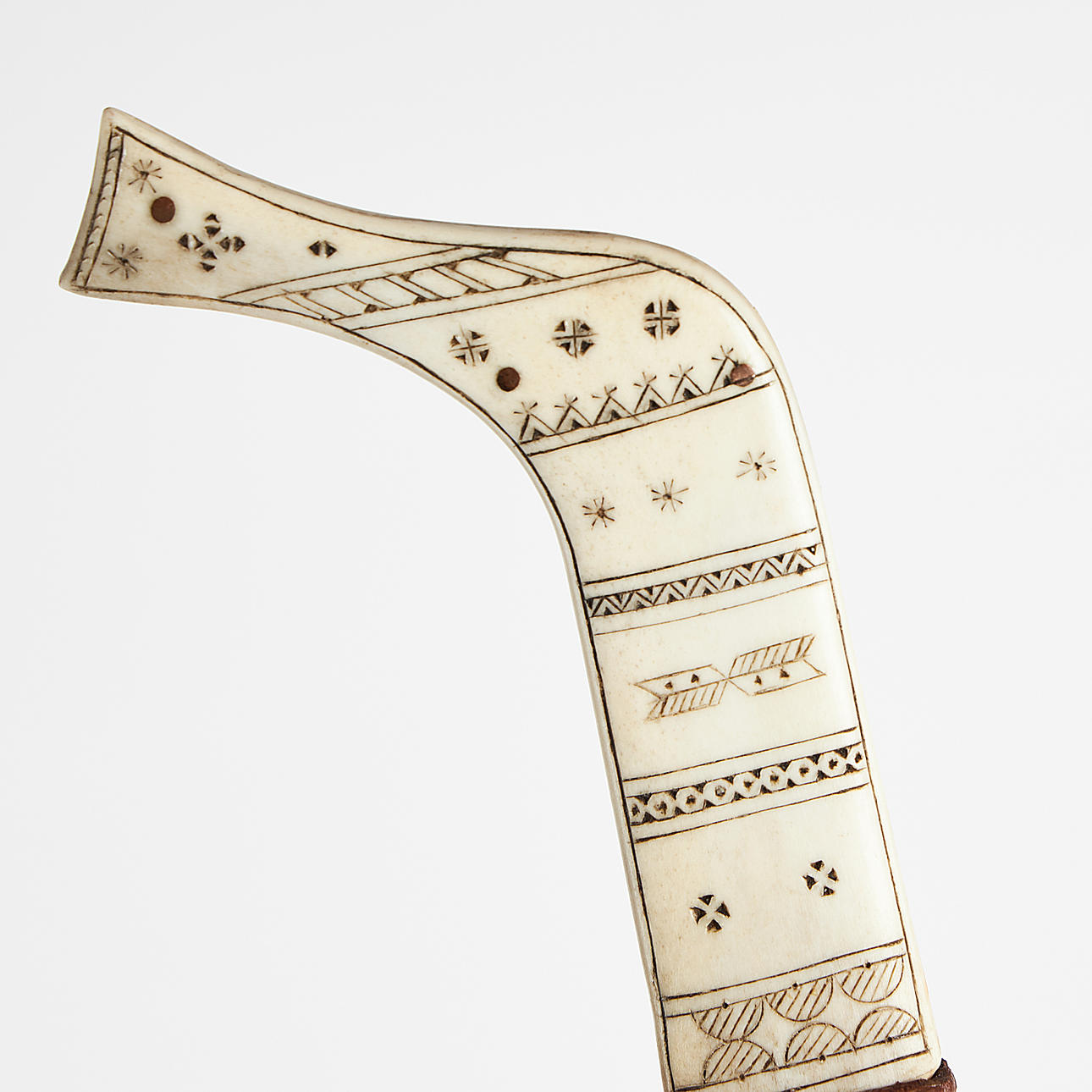 Engraved horn, inlaid blade. Knife length 17cm, total 20cm.