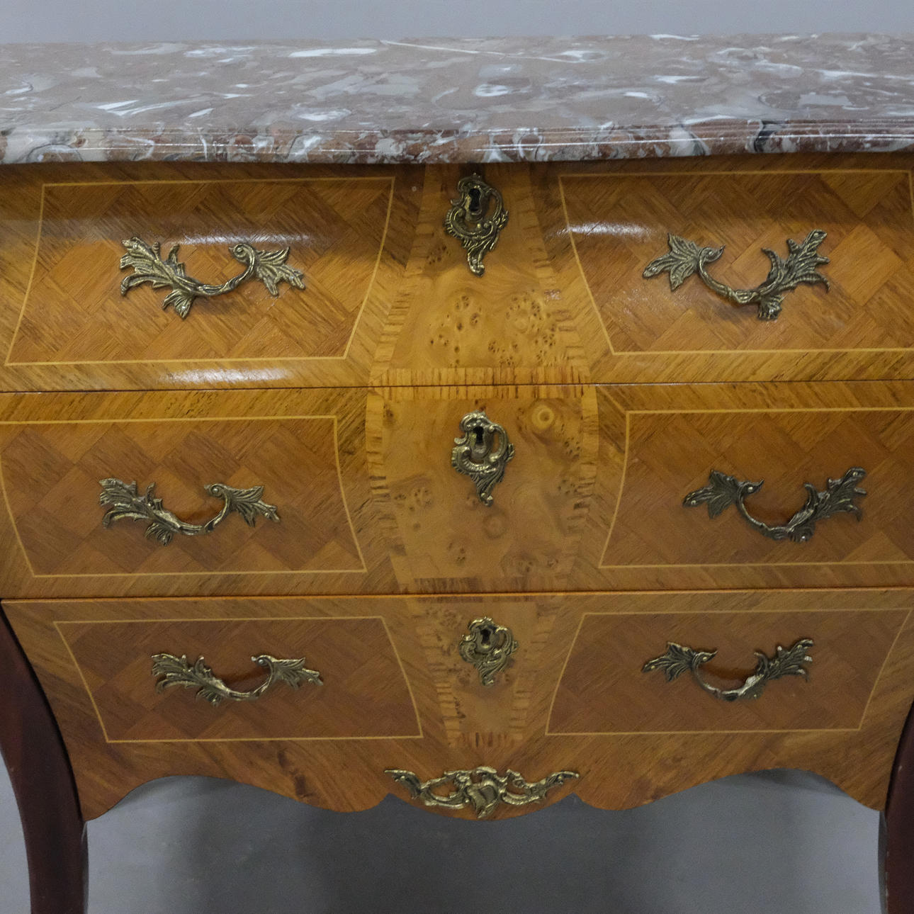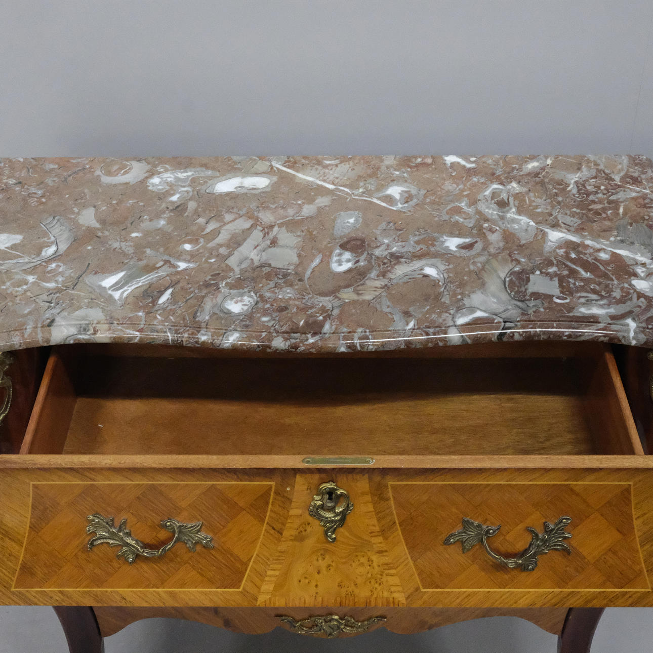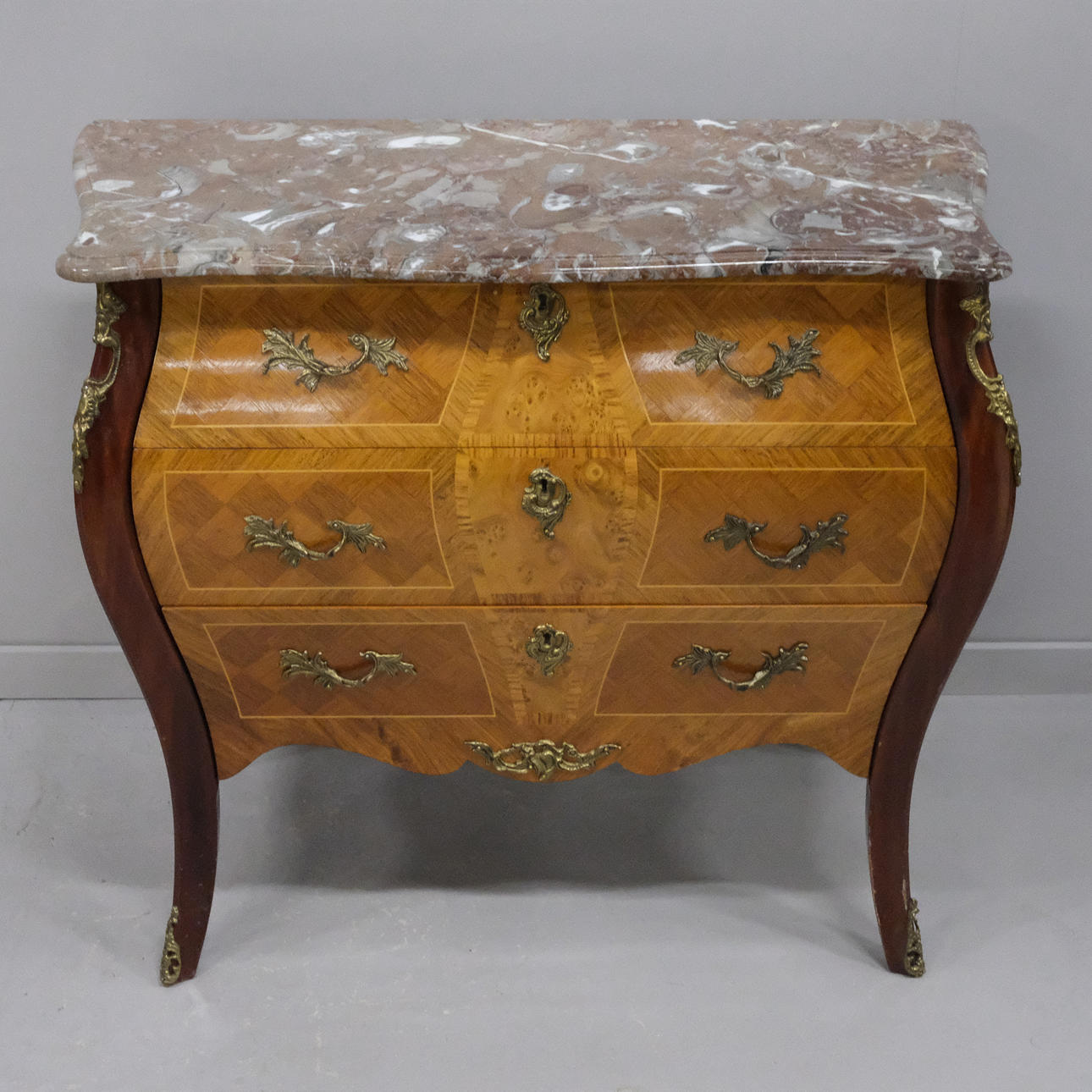Chest of drawers with loose stone slab. Three boxes. Gilded fittings and intarsia decor. Height: approx. 78 cm. Dimensions of the disc: approx. 88 x 41 cm.
