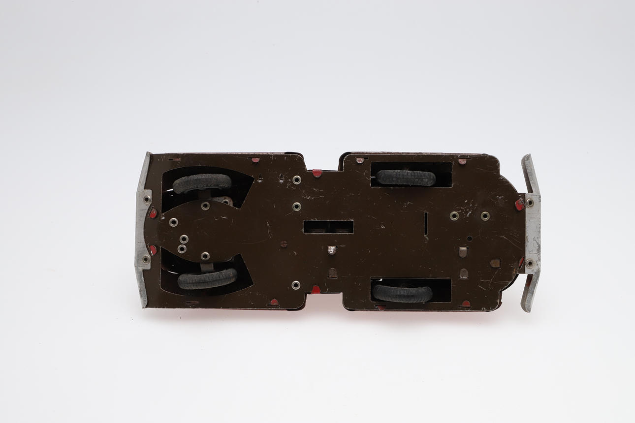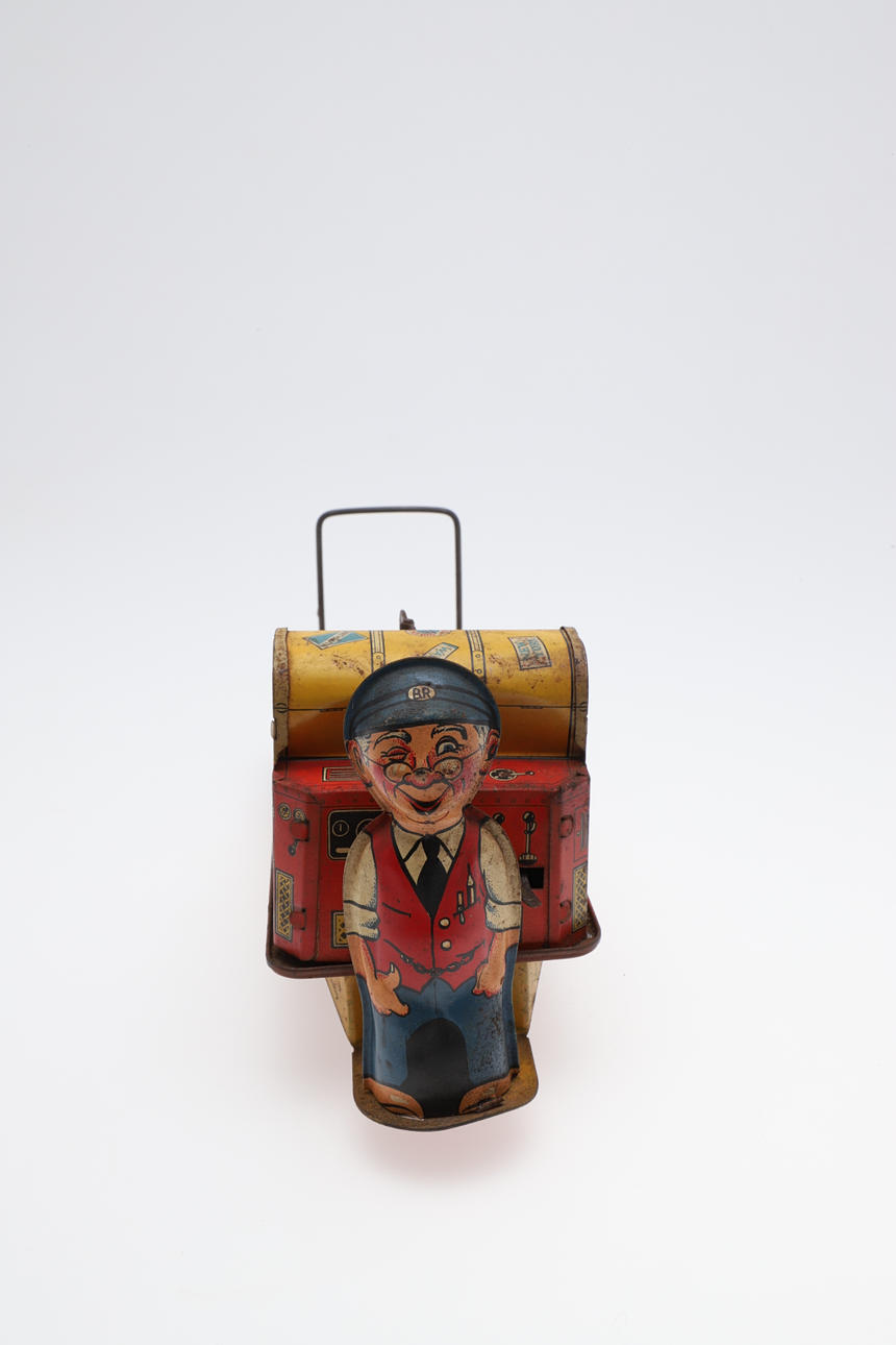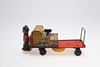 A clockwork Sports Car with number plate 'SGC 1010' (no key), 25cms long. Also with an English clockwork luggage trolley, (with a key and working, 30cms long), and a Schuco 1040 Micro Racer (tyre missing). (3).