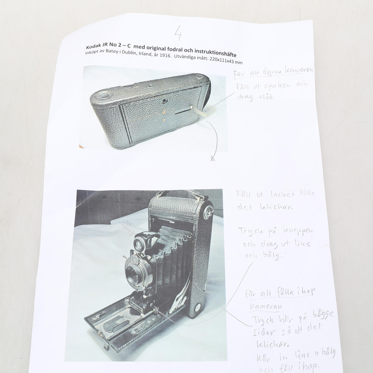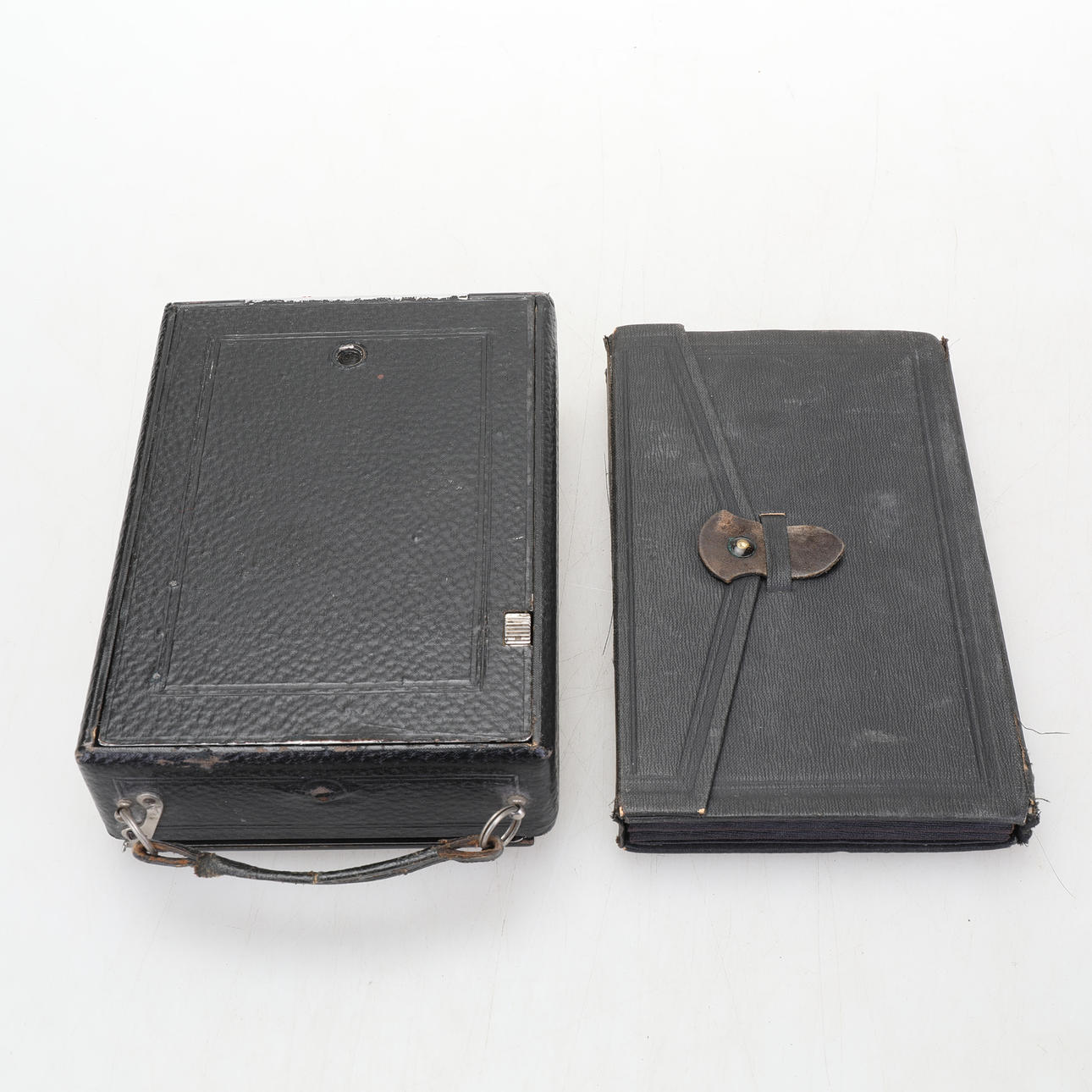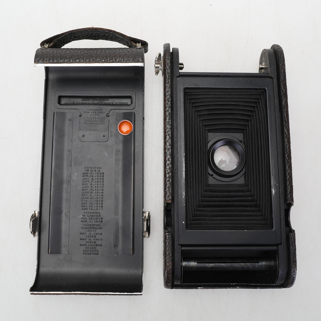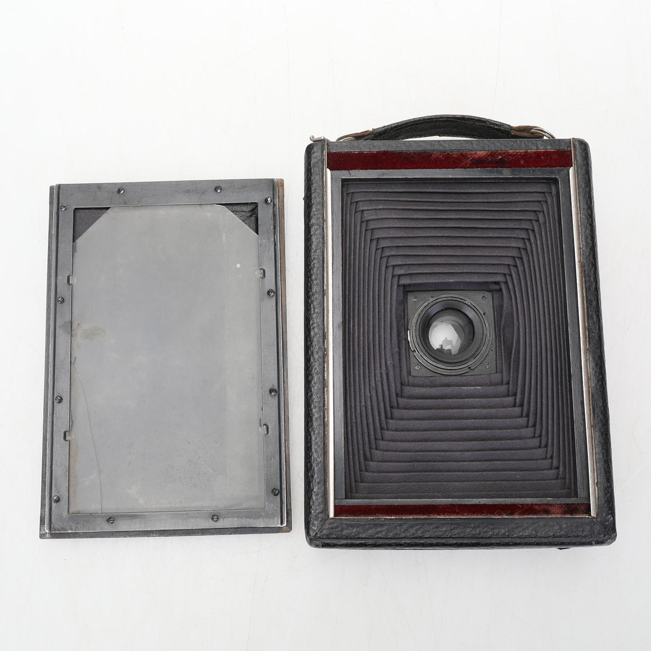 Vario camera large screen camera and three film holders in sheet metal in a bag Kodak JR No 2-C with original case and instruction booklet. purchased in Dublin in 1916 Rolleicord probably model V manufactured between 1953-1957.