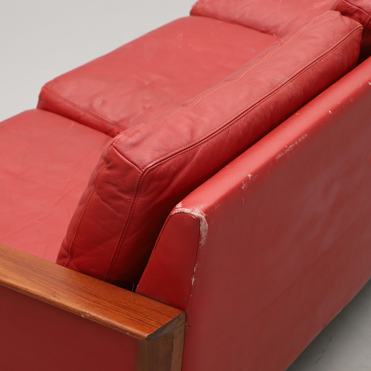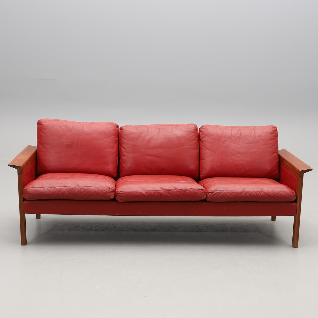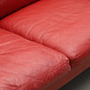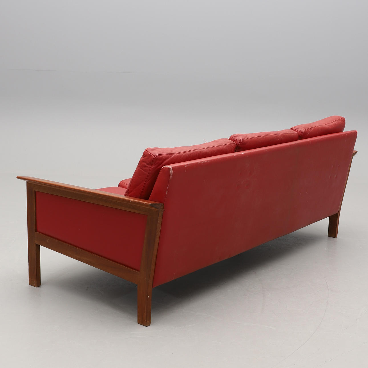 Teak. Three seater. Loose padded cushions covered in red leather. Length approx. 193 cm, seat height approx. 39 cm.