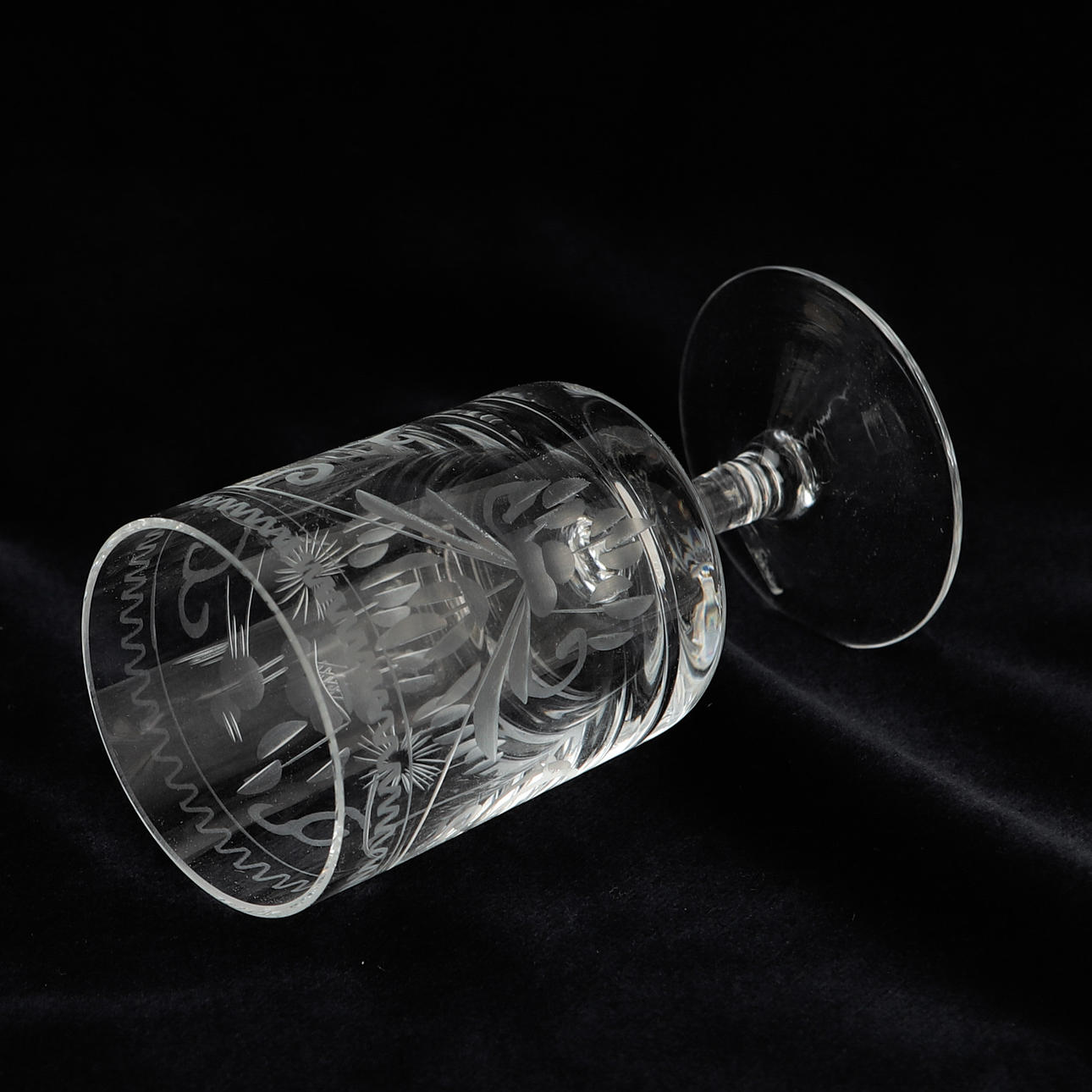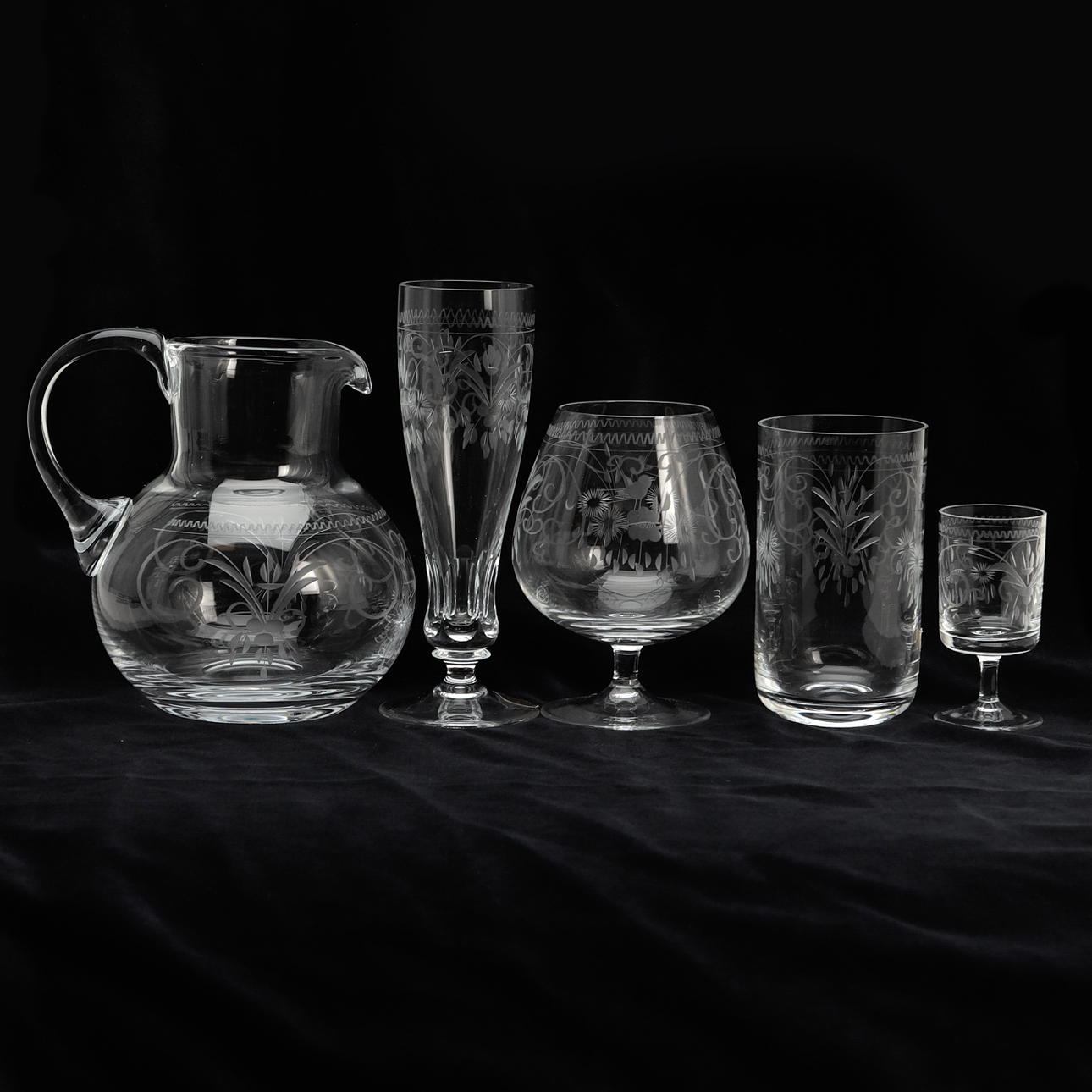 6 brandy cups, approx. 12 cm 8 champagne cones, approx. 17 cm 6 tumblers, approx. 12 cm 6 strong wine glasses, approx. 8.5 cm 1 pitcher, approx. 15 cm.