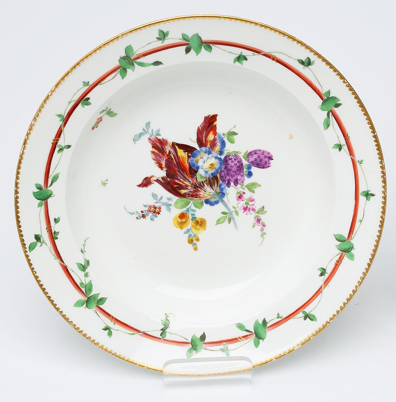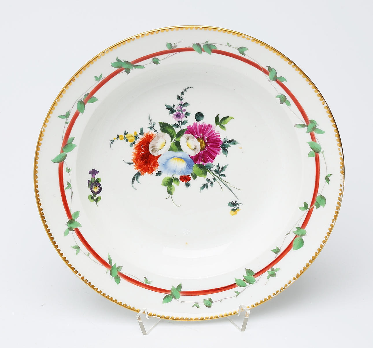 Polychrome painted floral decor. Marked with crossed swords.