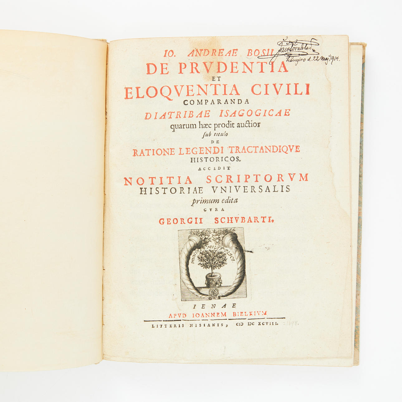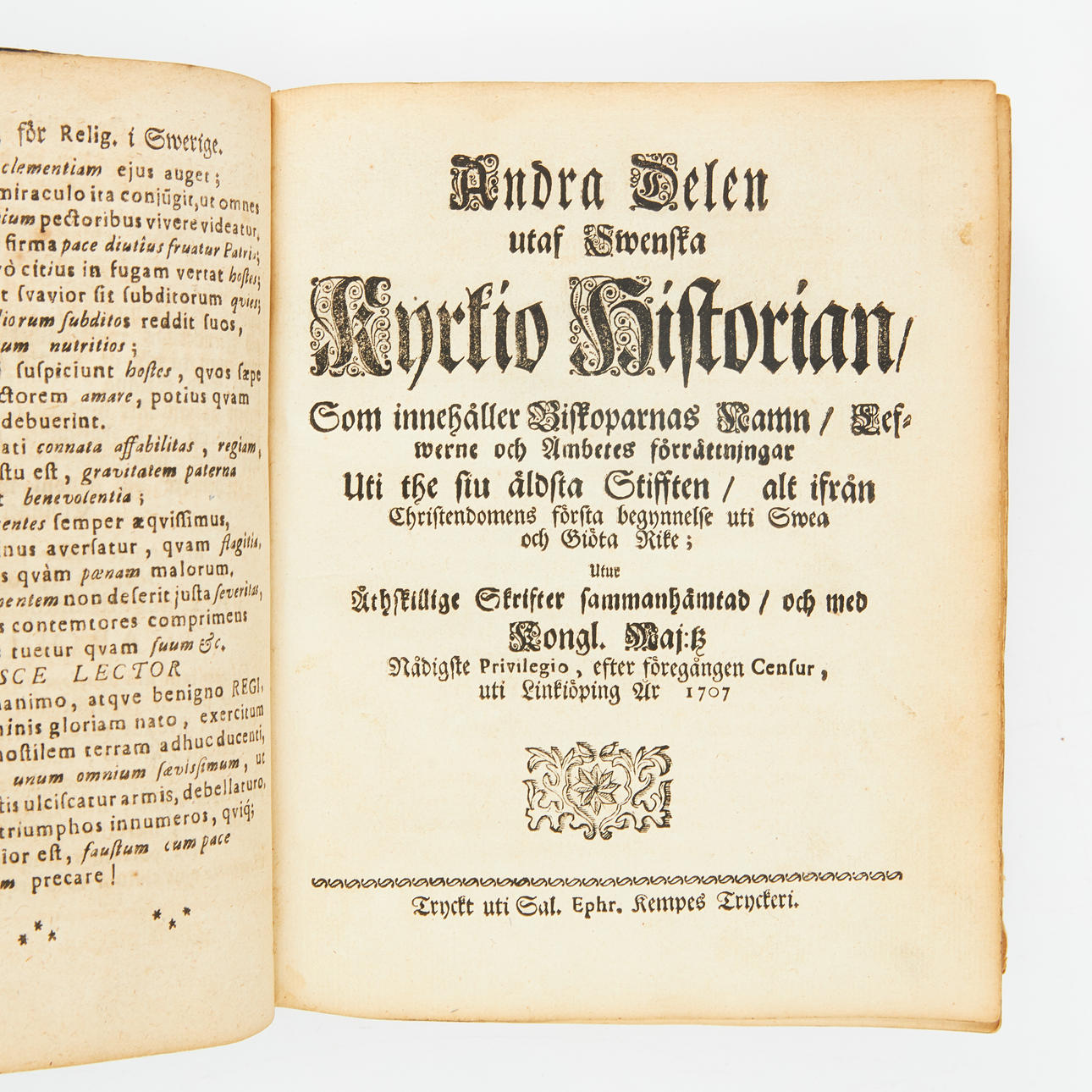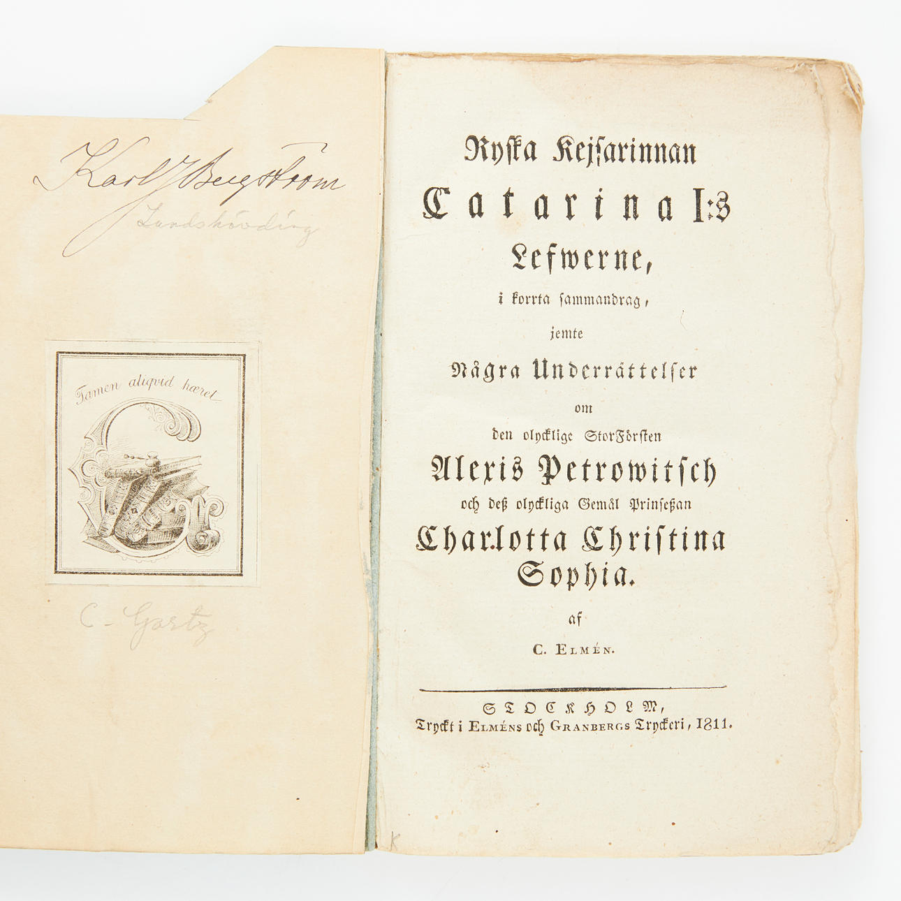 BLACK, PEDER. Sermon of the day, effwer then stormechtigaste/ unöfferwinnelige/ and most laudable prince and lord H. Gustafs/ Sweriges/ Göthes/ Wändes &c. Konungz och fathers/ christelige lijk... Stockholm, 1620 (later half-parchment binding, corrections in the text, partly with printing losses, incl. a. lower part of the title page); Concordia pia et unanim[i] consensu [r]ep[e[tita confes[sio] fidei & doctrinæ... Strängnäs, 1669 (spotted contemporary parchment binding, title page lined and with text losses, older signatures, among others a. Olavus Backström); Royal may:tz gracious instruction for the district governors... Stockholm, (1688) (stapled, stained, Vilhelm Smitt's ex-libris); Royal may:tz instruction, härads-skrifwarne wid deras tiensters's proceedings for intelligence. Stockholm, (1689) (taken from binding, Vilhelm Smitt's bookplate); PUSHABLE. 10. Andreae Bosii De prudentia et eloquentia civili... Jena, 1698 (later hemispherical binding, Hammer's bookplate); (MIRROR). Then the Swedish church history... I-II. Linköping, 1707-08 (worn leather binding, stained insert, not complete); (LE ROUX). Histoire du pere La Chaize, jesuit & confesseur du roi Louis XIV... I-II. Cologne, 1719 (worn contemporary leather binding, minor tears and stains, the engraved frontispiece torn at the edges); THE ELME. Russian empress Catarina I:s lefwerne... Stockholm, 1811 (contemporary cardboard binding, cut in the upper edge of the front cover, Gartz bookplate); Bihang yill Paris in the Nineteenth Century. Free translation. Gothenburg, 1814 (stitched, in gray paper cover, stains, signature); DUMB. Pantheon for women's time... Stockholm, 1844 (stapled, damp stained, worn cover); POUSSIN. De la puissance américaine. Tome premiere. Paris, 1846 (somewhat worn contemporary half-French binding, more published); LÜKEN. Die Traditionen des Menschengeschlecht oder die Urofenbarung Gottes unter den Heiden. Münster, 1856 (contemporary half-French band); VAUPELL. The War of 1849. Köbenhavn, 1866 (worn half-French binding, Georg Dahl's bookplate); DRAWER. From Esaias Tegnér's paper. Selection of contemporary letters to Esaias Tegnér. Stockholm, 1882 (worn contemporary half-French binding, the capital torn, Wendela Hildebrandsson's signature); RIVER LAND. Stenborg theaters. Contribution to Stockholm's theater history. Stockholm, 1893 (worn contemporary half-French binding, printed in 350 copies); BOKKENHEUSER. Saa village as a citizen. Copenhagen life at the end of the 18th century. Köbenhavn, 1905 (slightly worn contemporary half morocco binding).