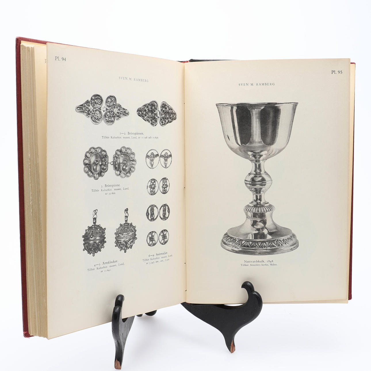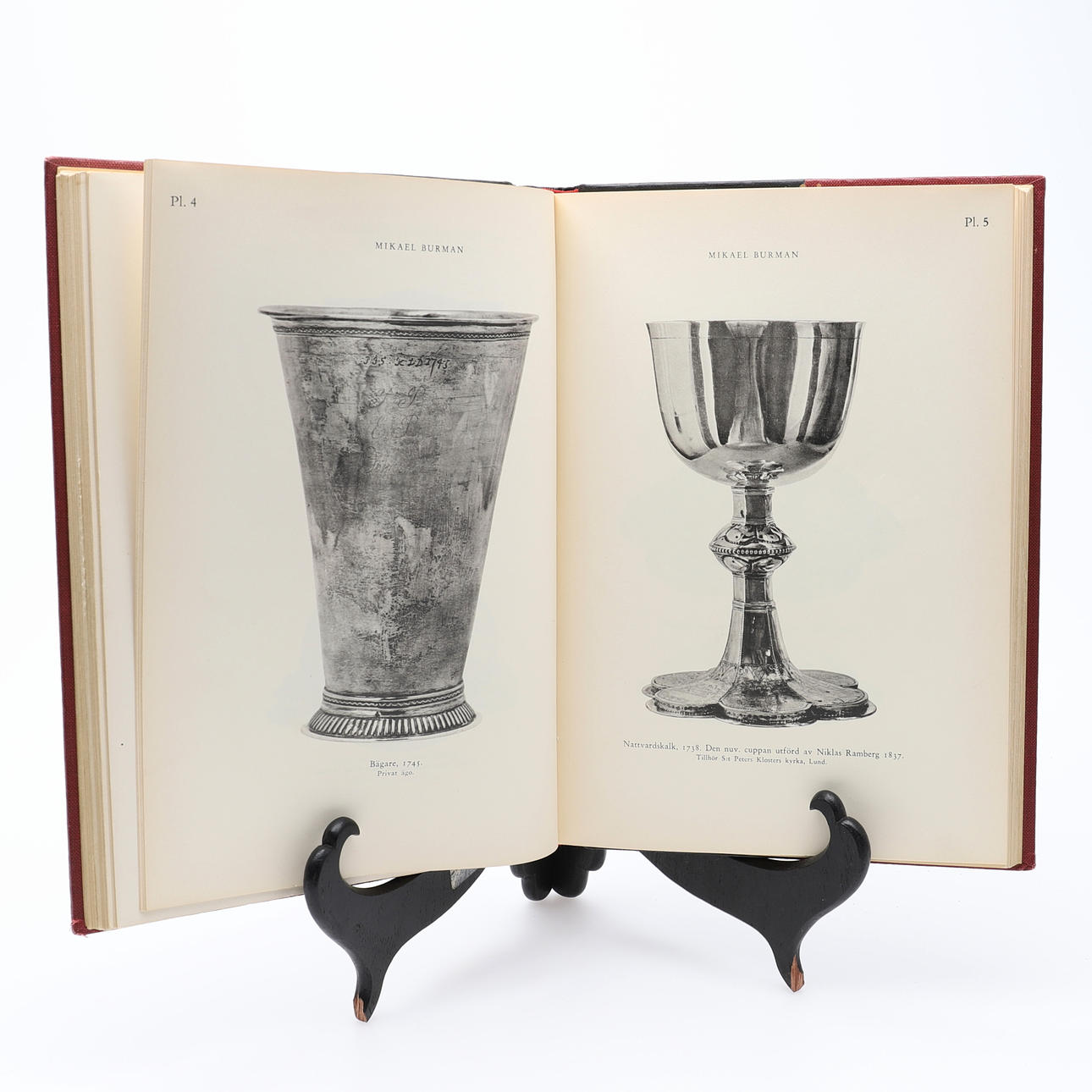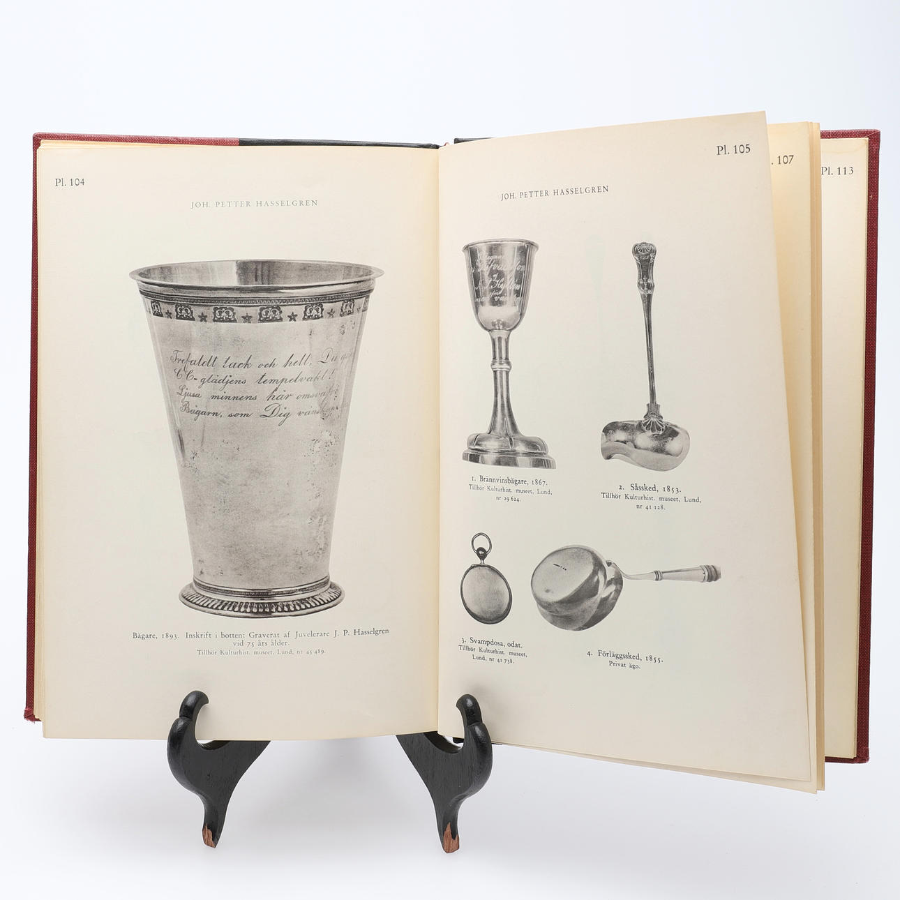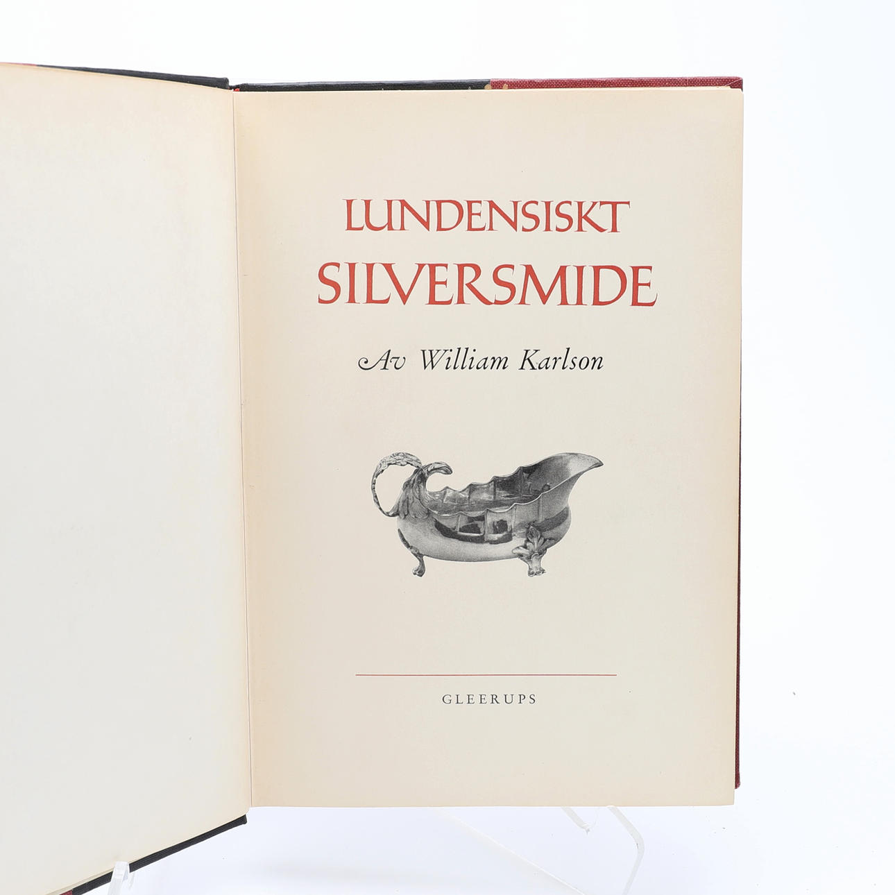 Carlson, William. Lund silversmith. Gleerups publishing house, Lund, 1952. 4:oi a black and red hemispherical band with gilt spine text. Front cover bound. 166 p. + 120 plates with several silver4 objects depicted on each plate + stamp part.