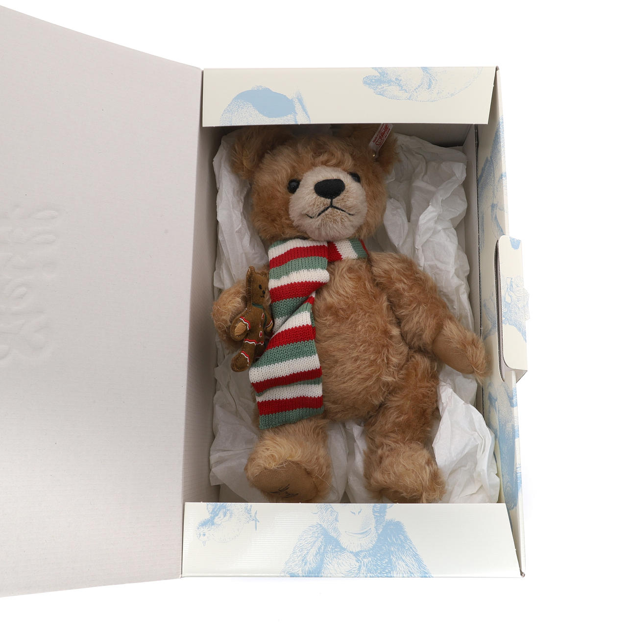 dark blond colour, mohair covered body, with growler, with scarf, holding gingerbread man, limited edition 183/1500, the right paw pad embroidered with "Harrods 2010", numbered ear tag with a gold plated button in ear, boxed with certificate, 39cm x 24cm x 16cm.