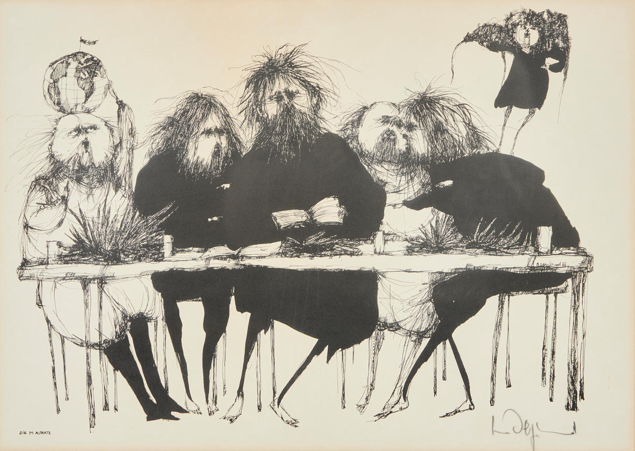 Gertrude Degenhardt (b. 1940), lithograph, 'The Leprous', 1967. Caricature depiction of a group of men at a table, signed and titled in lead on the underside and dated in the image, 51x70.5cm (50x69cm).