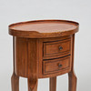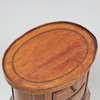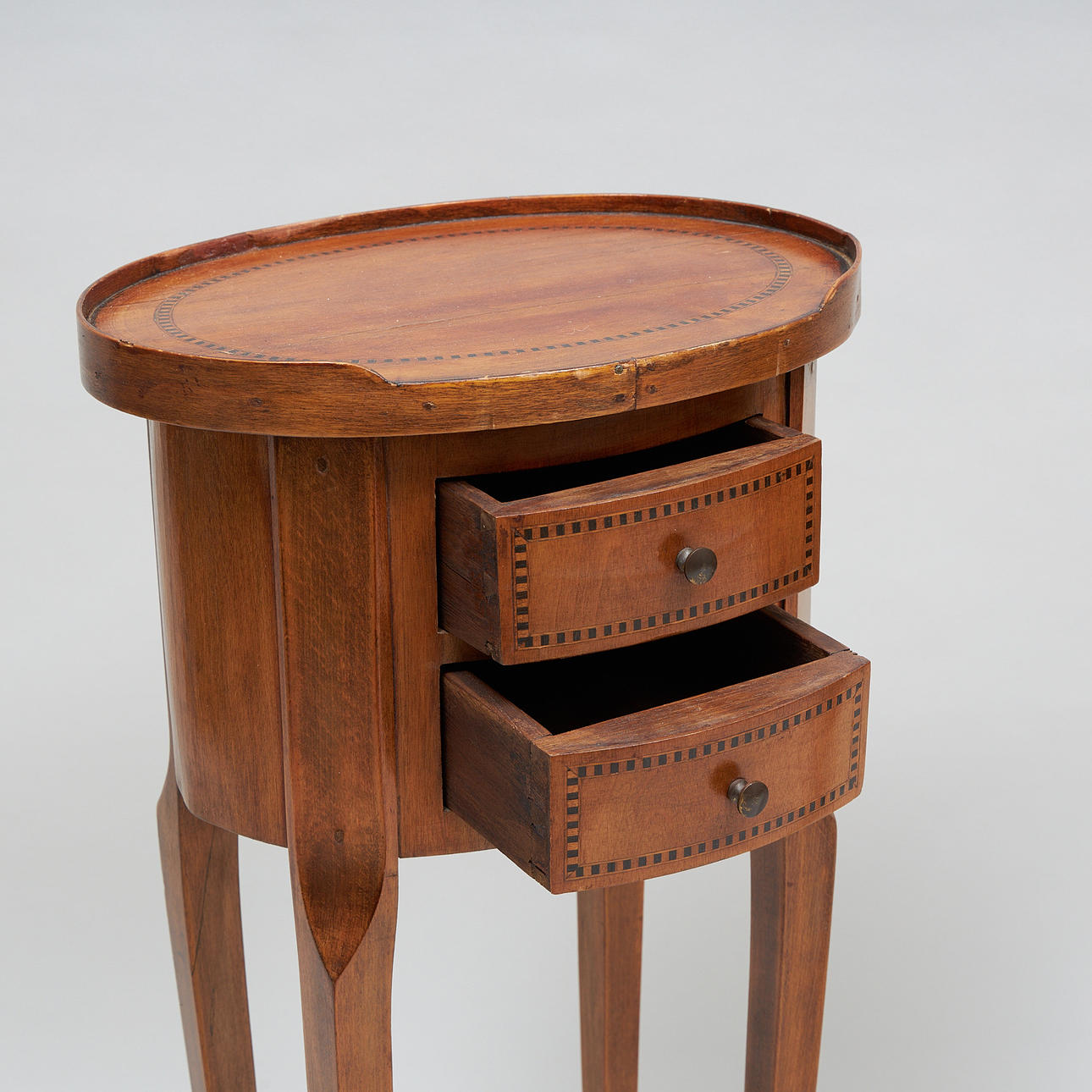 Mahogany with precious wood inlays and with two drawers. Height 66 cm, width 33 cm.