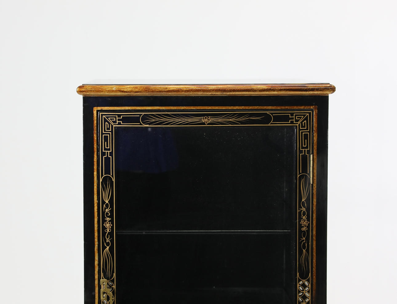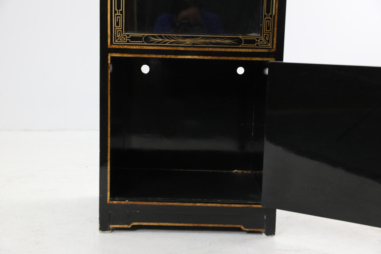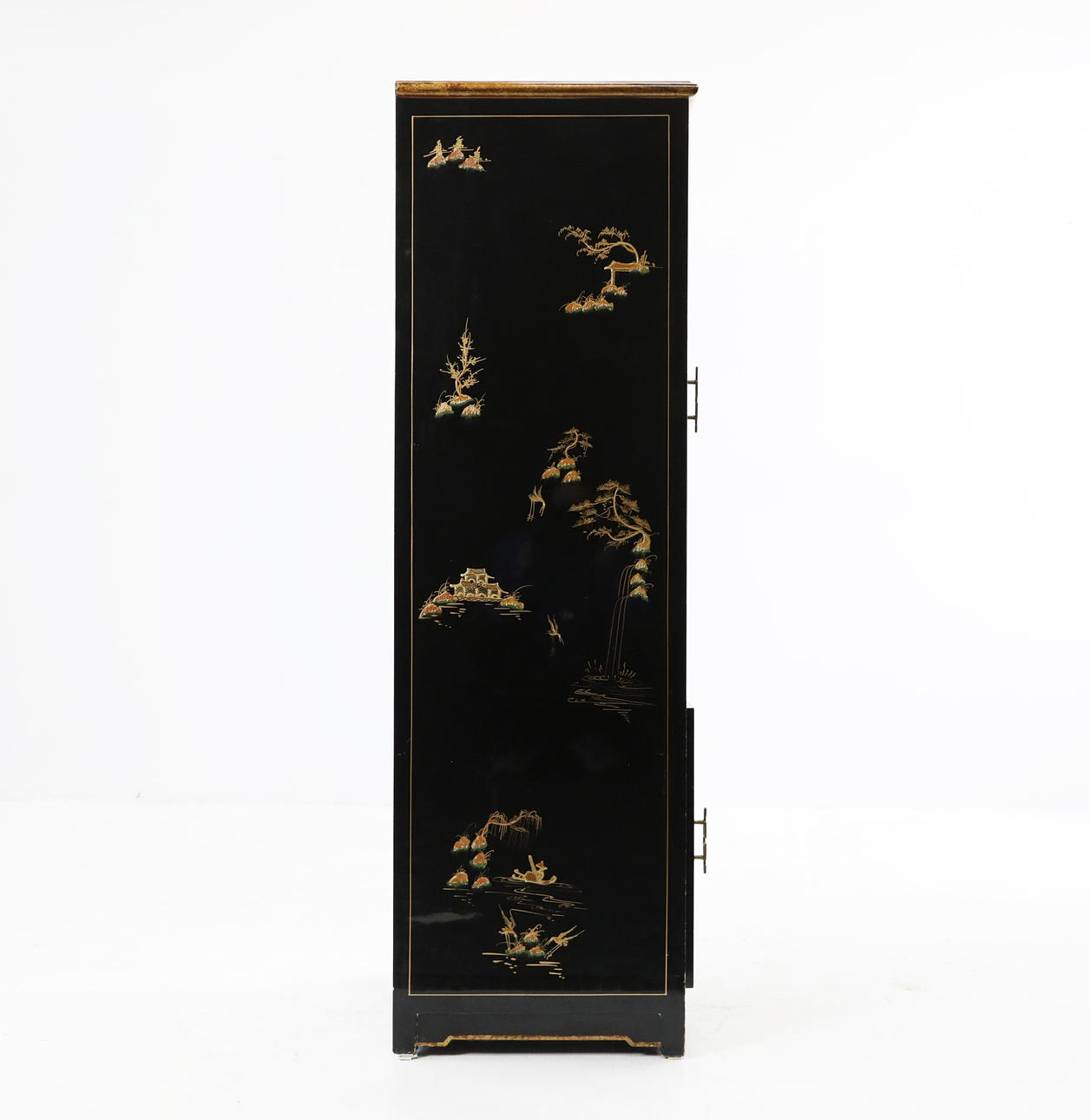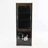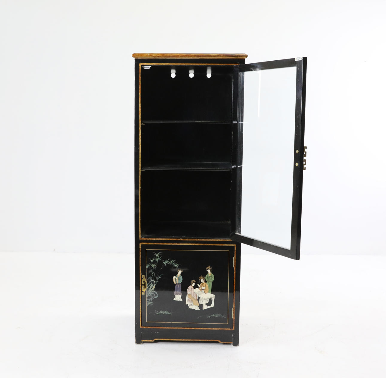 Glass. Wood. Lacquer. Decoration of landscapes and figure scenes. Fittings in brass. 2 shelves, adjustable. Height 148 cm Width 56 cm Depth 46 cm.