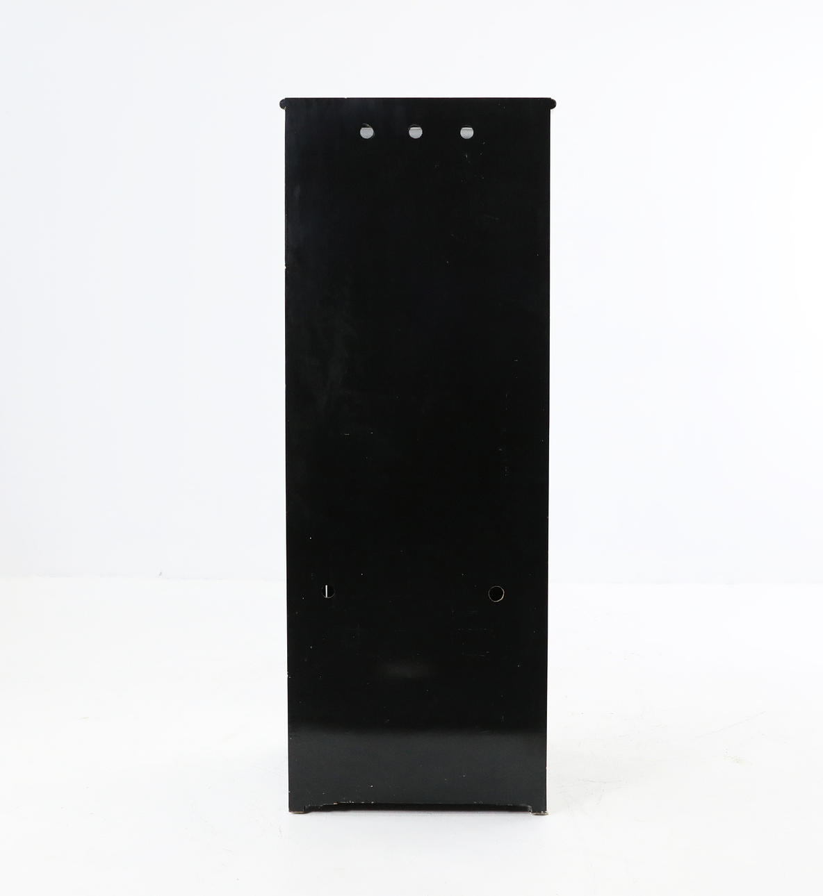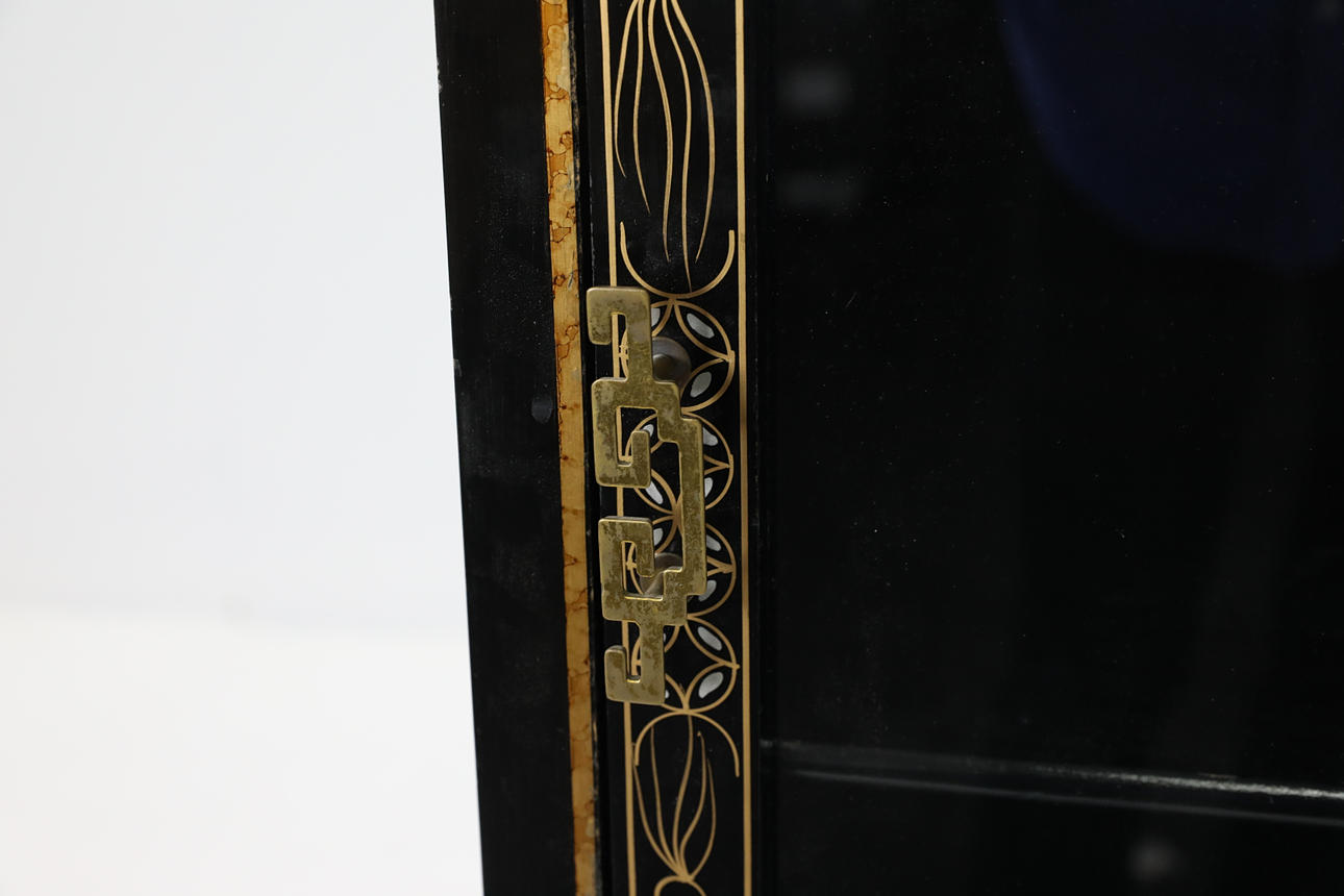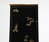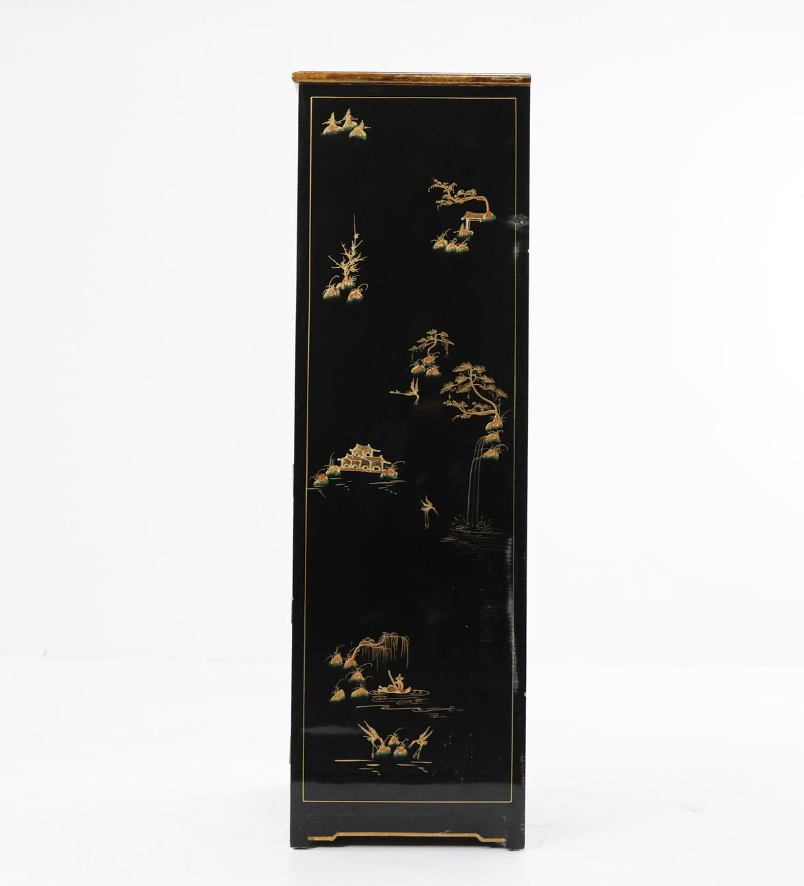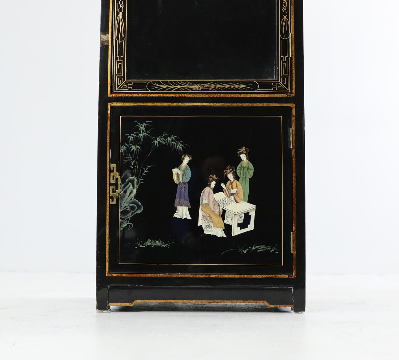 Glass. Wood. Lacquer. Decoration of landscapes and figure scenes. Fittings in brass. 2 shelves, adjustable. Height 148 cm Width 56 cm Depth 46 cm.