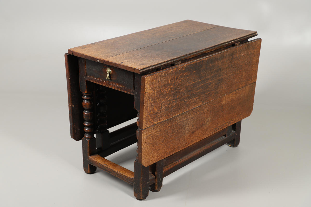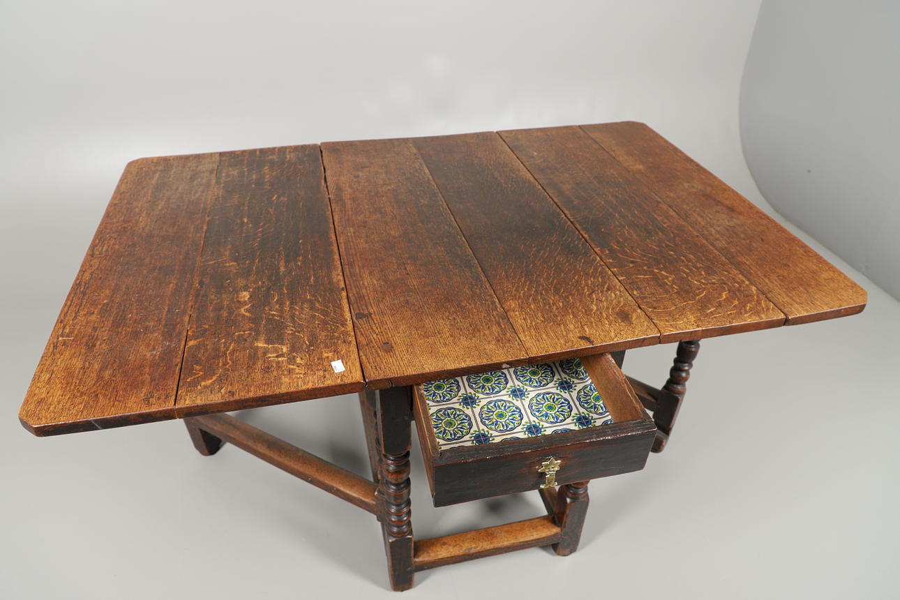 the hinged rectangular top over drawers to each end, on turned and block supports, 71cm high x 57cm wide (151cm extended) x 97cm deep.