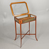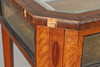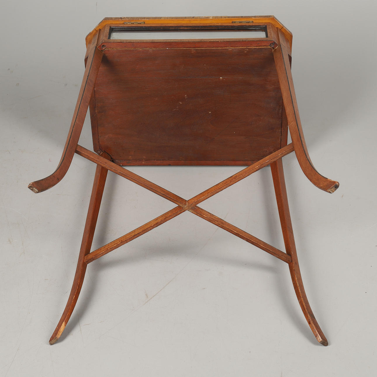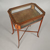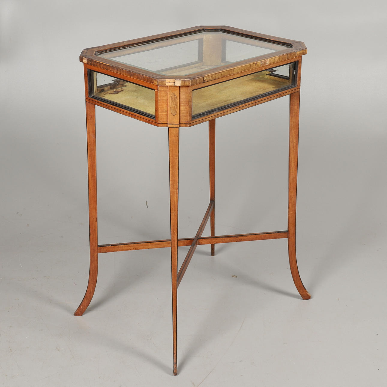 crossbanded with bevelled glass on splayed legs, height 77cm, width 53cm, depth 39cm.