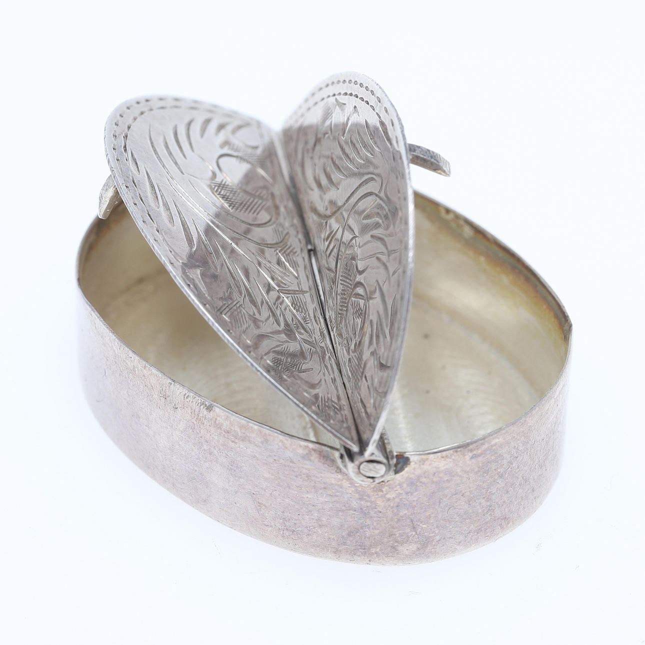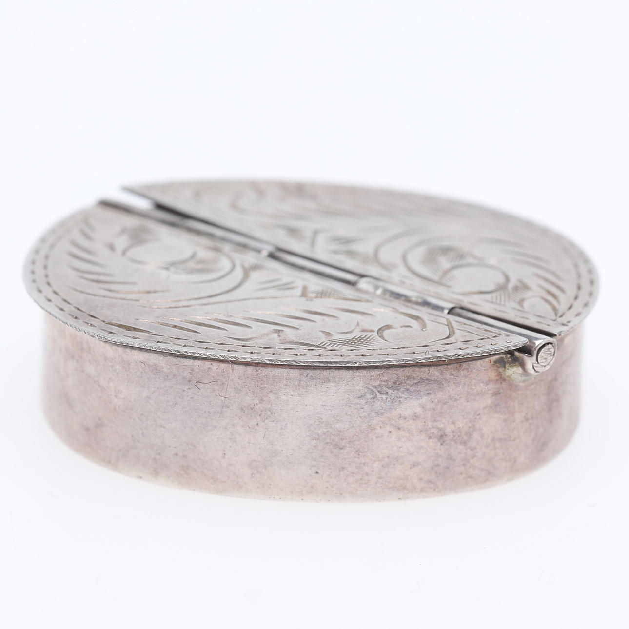 Double compartment with two-part cover, engraved decoration on cover Dimensions approx. 3.0x3.7x1.0 cm Weight 12 grams.