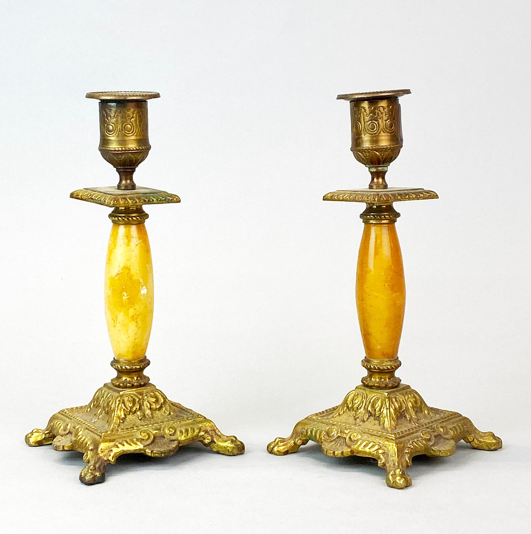 2759274. BRASS AND ALABASTER CANDLESTICKS.
