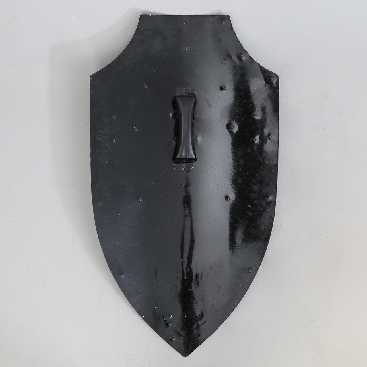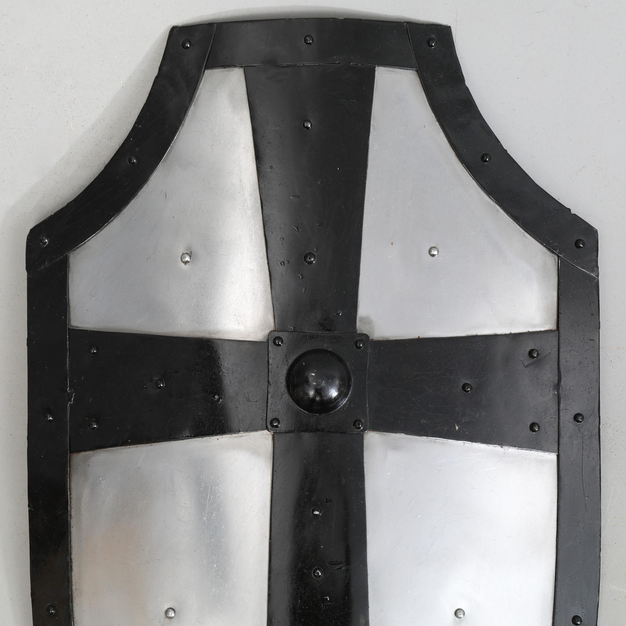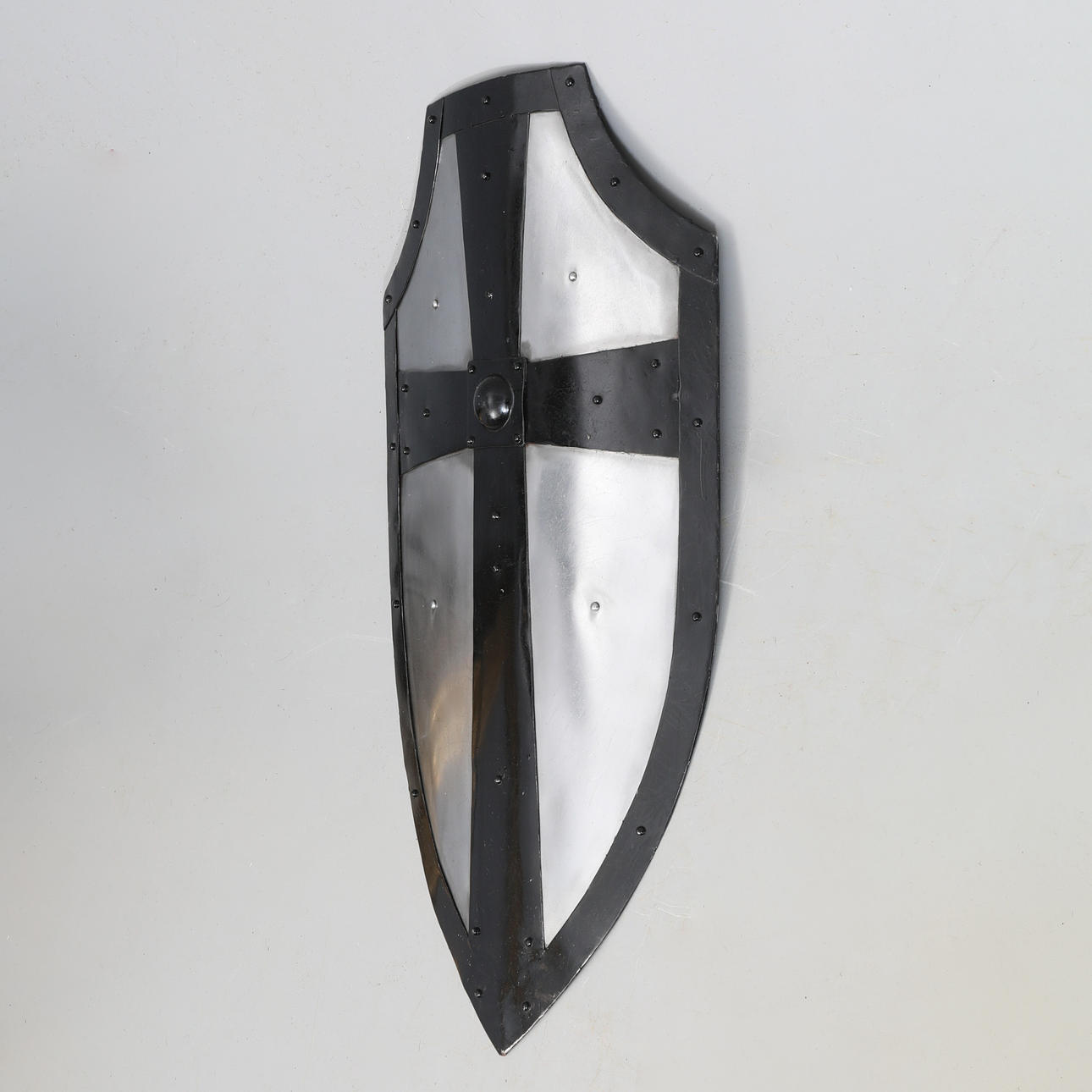 Handmade replica of a medieval gothic shield. Height approx. 81 cm, width approx. 44 cm.