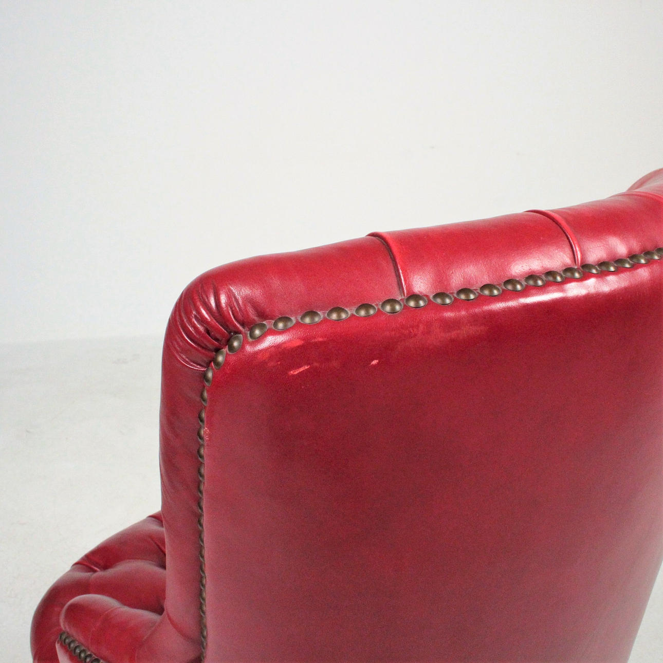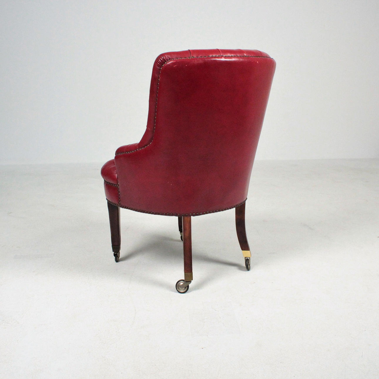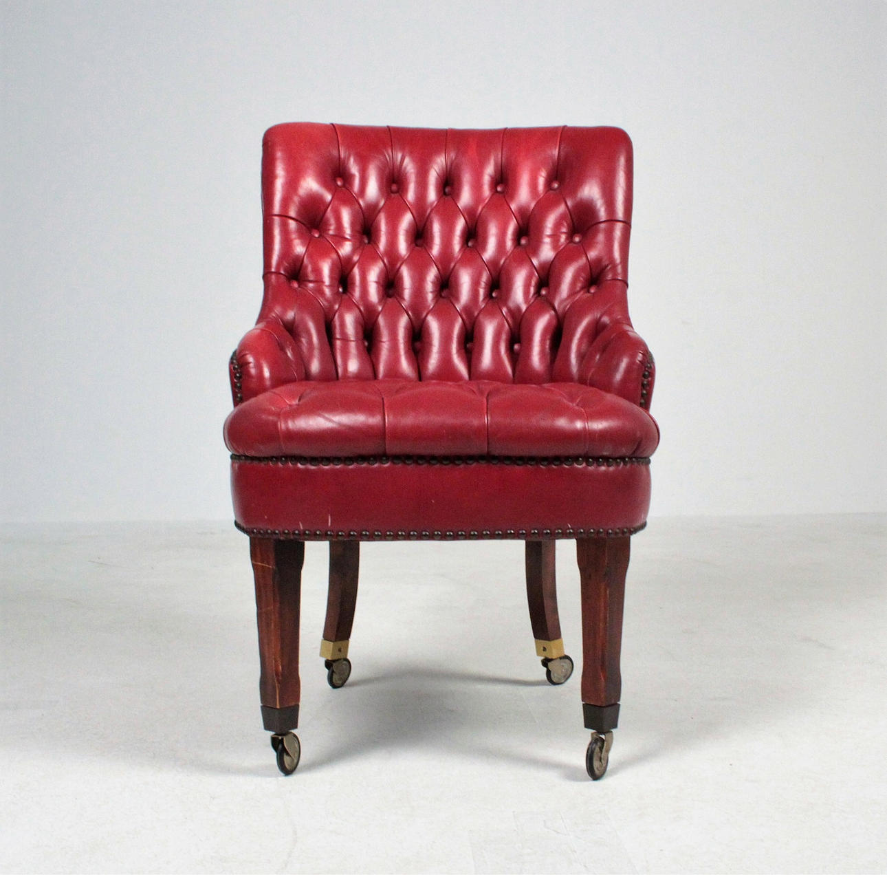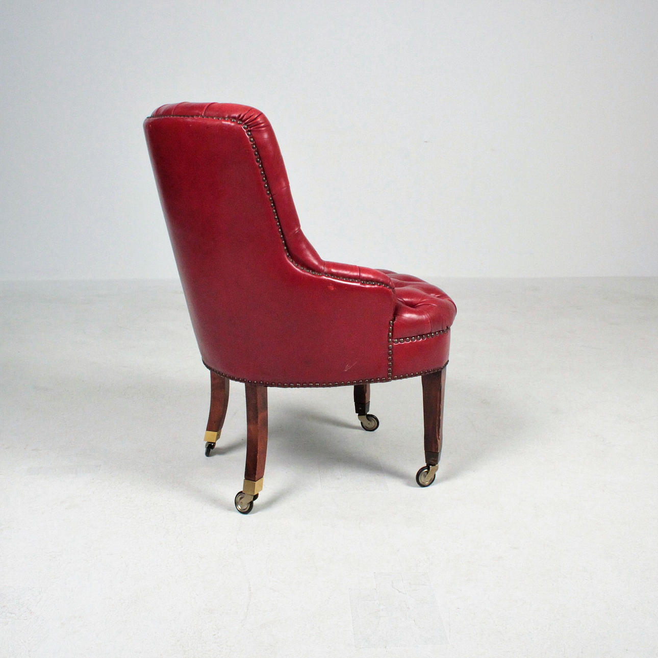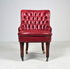 Wooden substructure upholstered with various upholstery materials, covered in red leather, buttoned with buttoning. Feet with castors made of brass Dimensions: H: 84 cm, W: 51 cm, D: 60 cm.