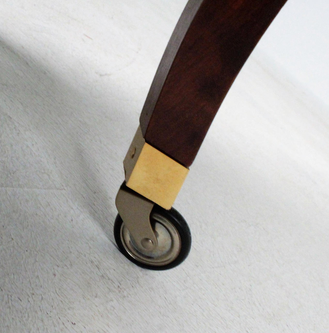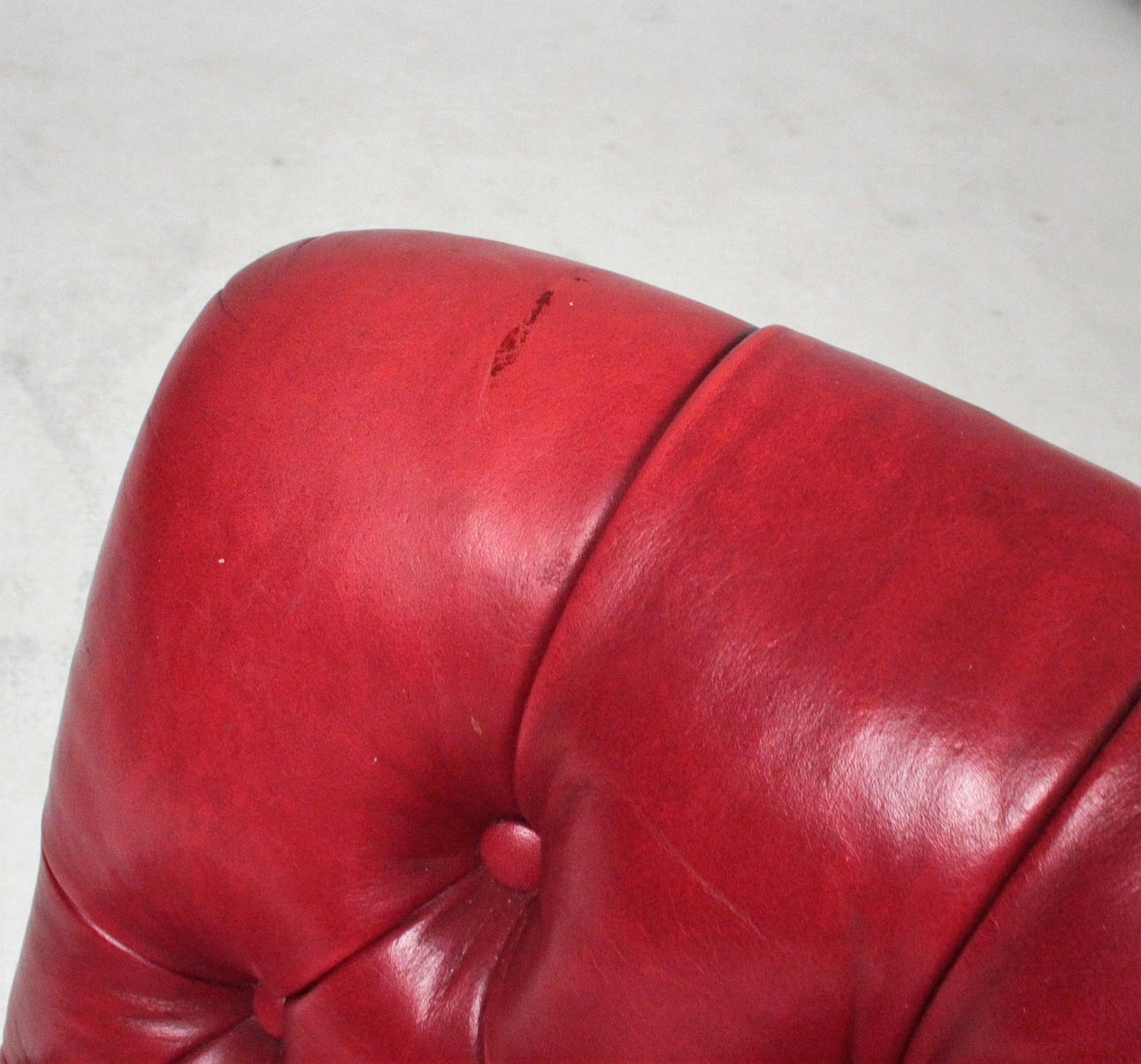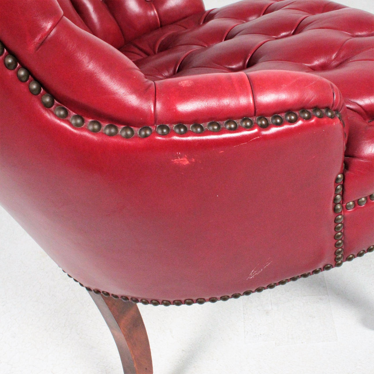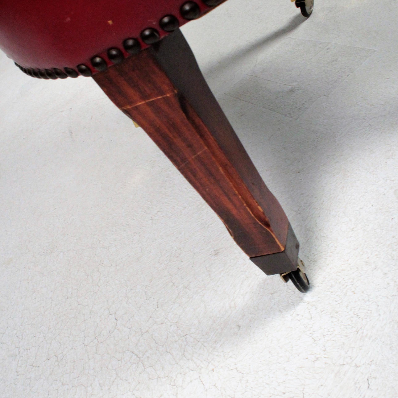Wooden substructure upholstered with various upholstery materials, covered in red leather, buttoned with buttoning. Feet with castors made of brass Dimensions: H: 84 cm, W: 51 cm, D: 60 cm.
