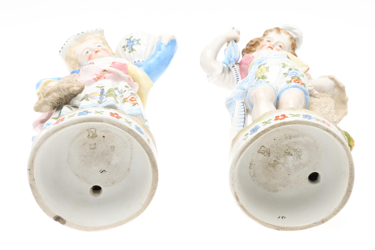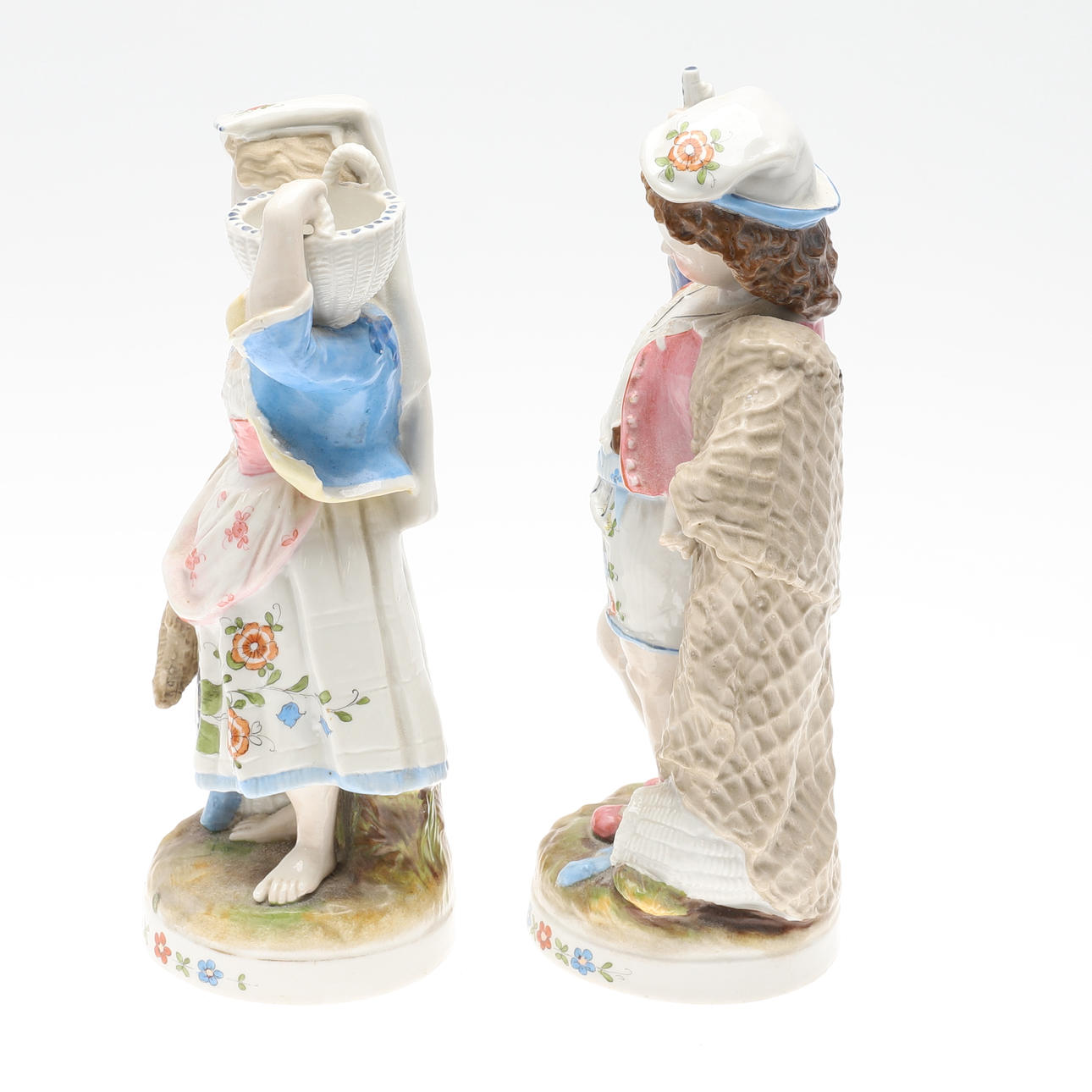 20th century, She modelled carrying a basket, 23cm high He with an oar, 24cm high. Impressed marks to undersides. (2).
