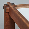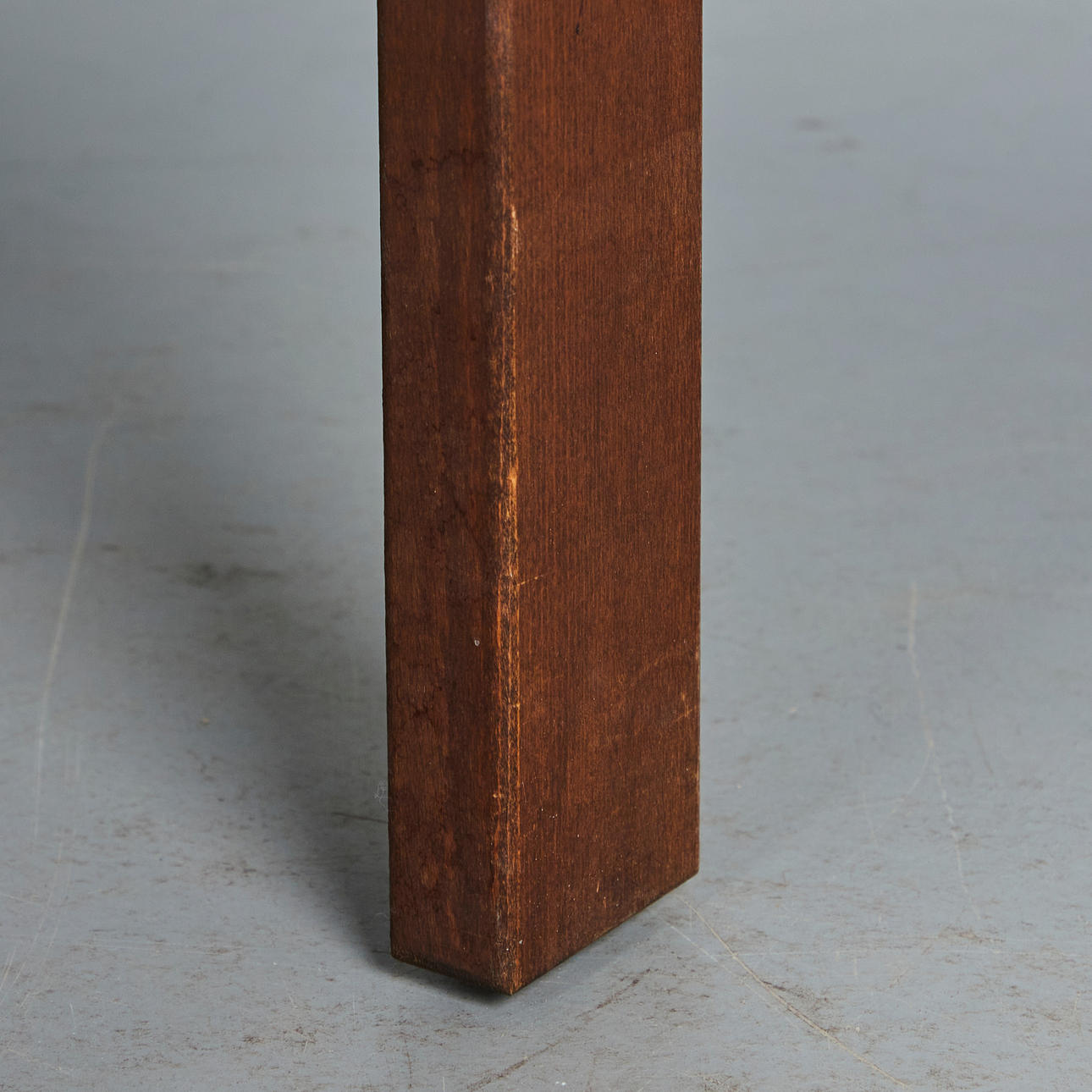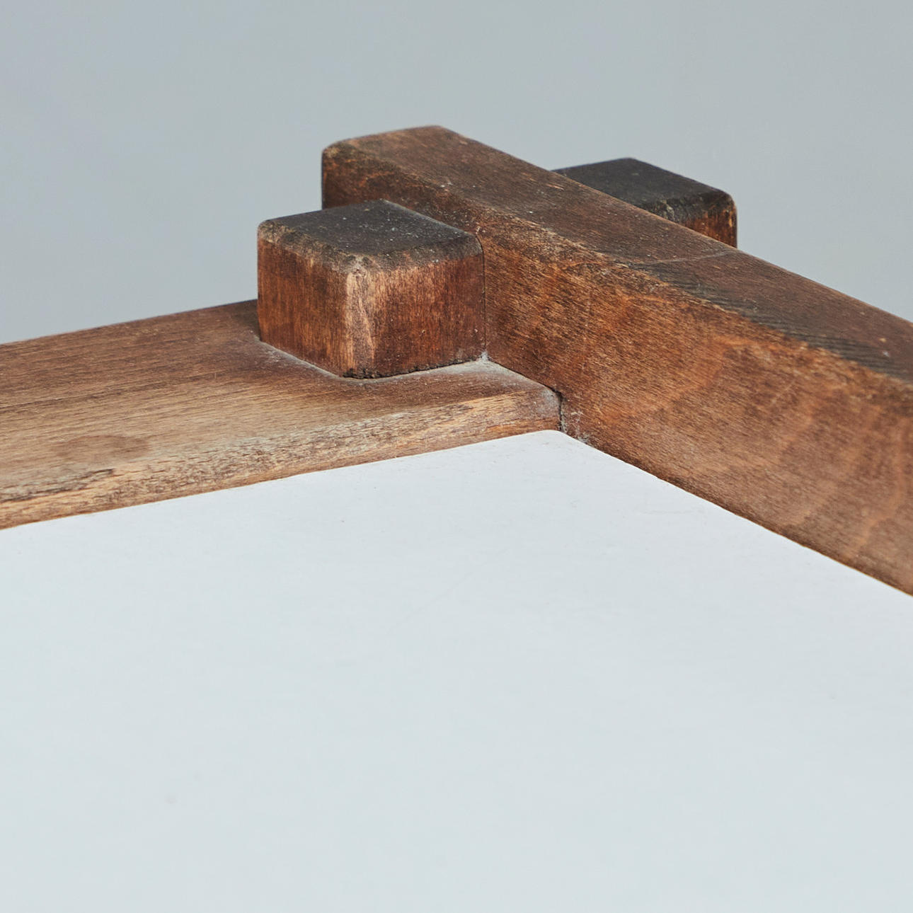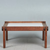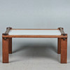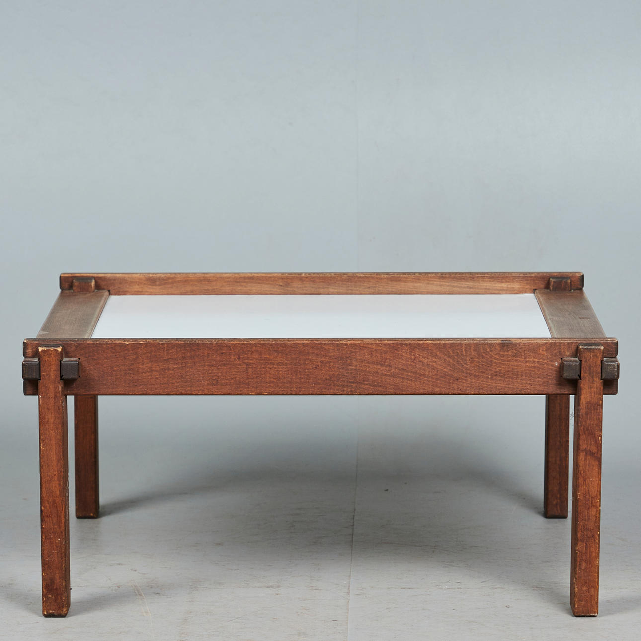 Brutalist side table, coffee table, wood, cork, 1960s. Brutalist side table, coffee table, wood, cork, 1960s. Structure made of dark glazed wood with strutted legs and a square cork table top, white coated on top, with struts made of brown, elastic plastic straps on the underside, H.31cm, L.67cm, W.67cm.