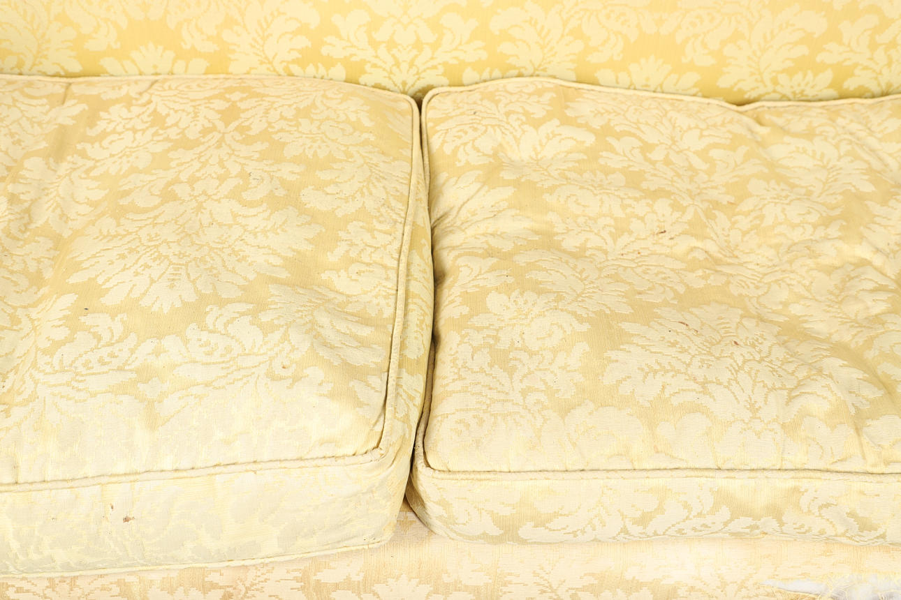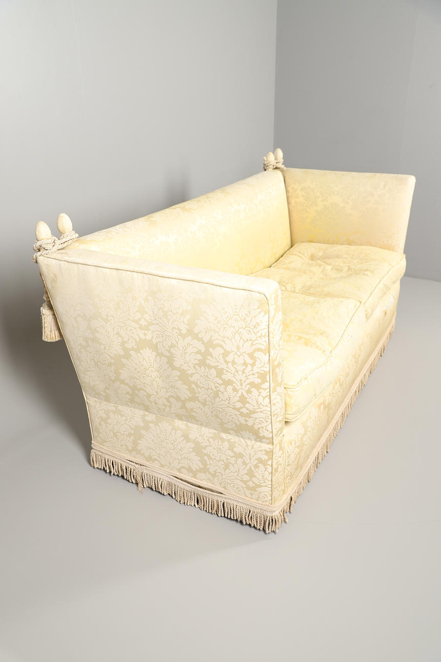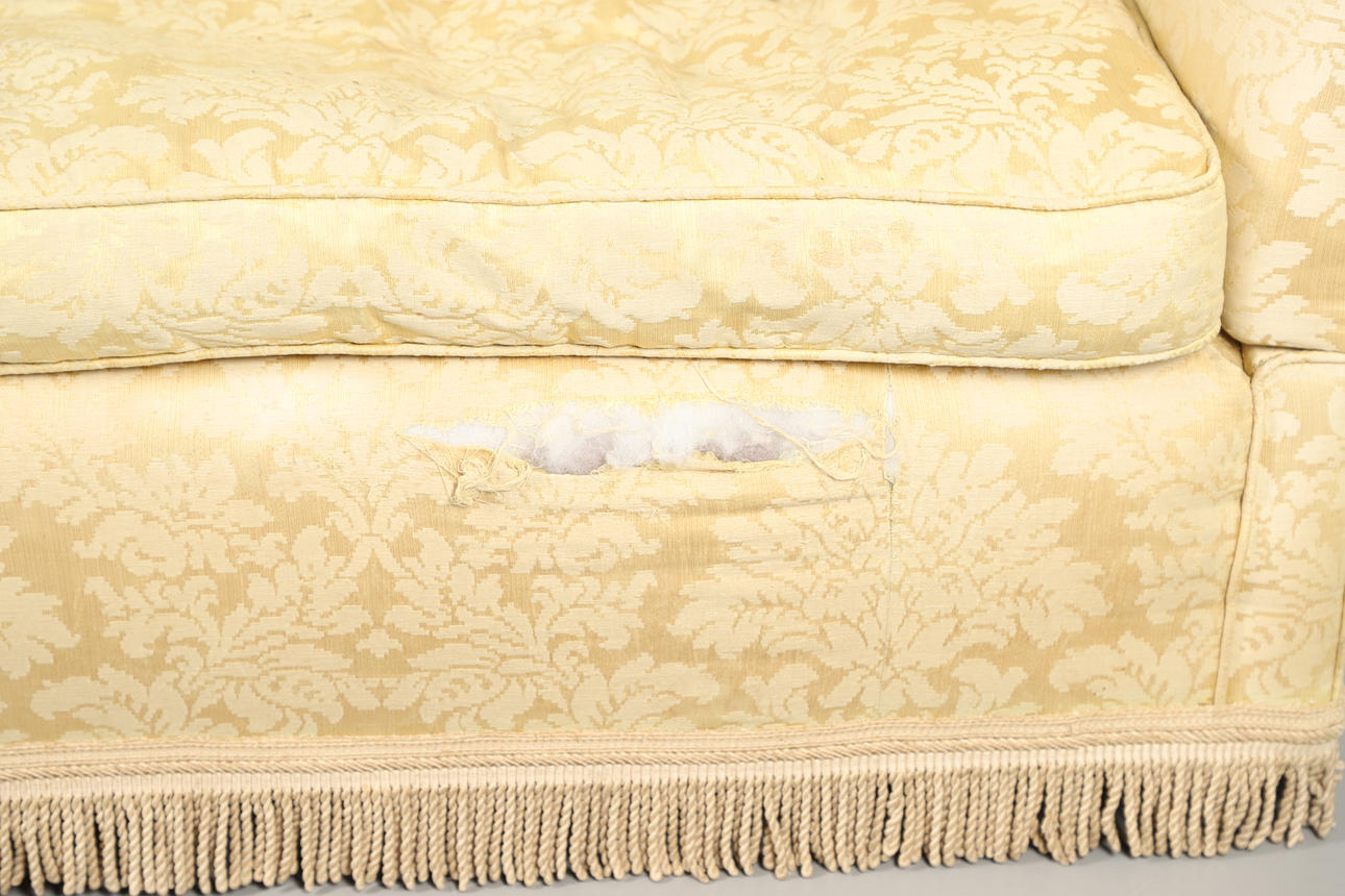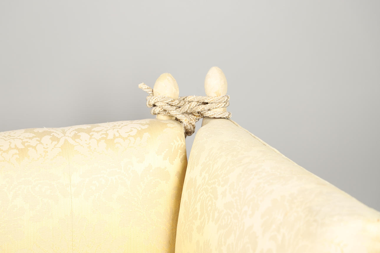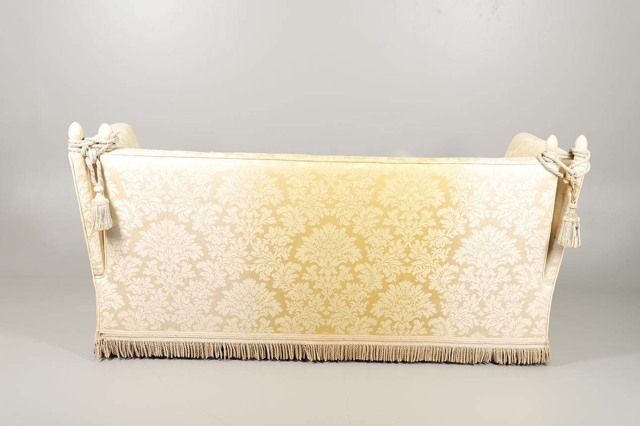 With Yellow silk Damask upholstery with a tasselled skirt. Height 101cm x Length 203cm x Depth 86cm.