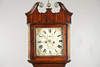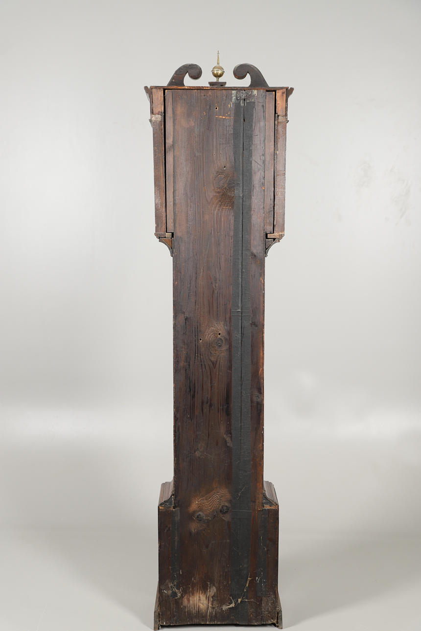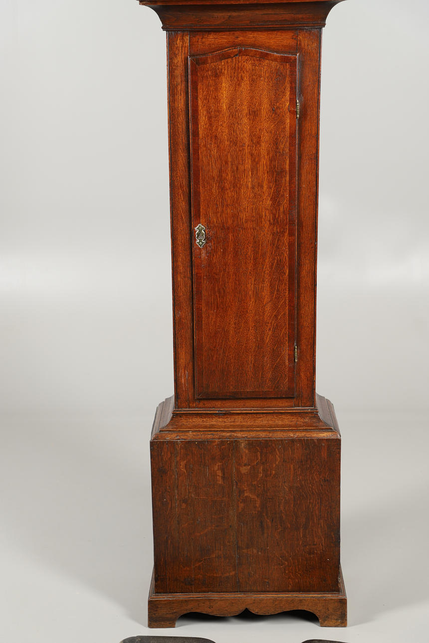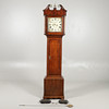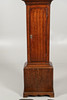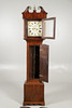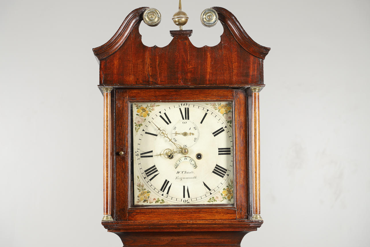 An oak longcase clock with two weights, pendulum, winder key and case key. Painted floral face bearing the name W.Chaste, Teignmouth with some brass fixings throughout. Height 210cm x Width 46cm x Depth 26cm.