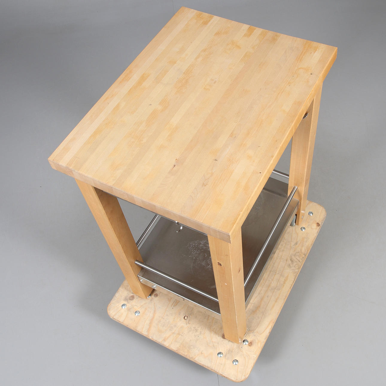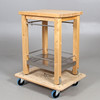 On wheels. Wooden frame with lower shelf made of sheet metal.