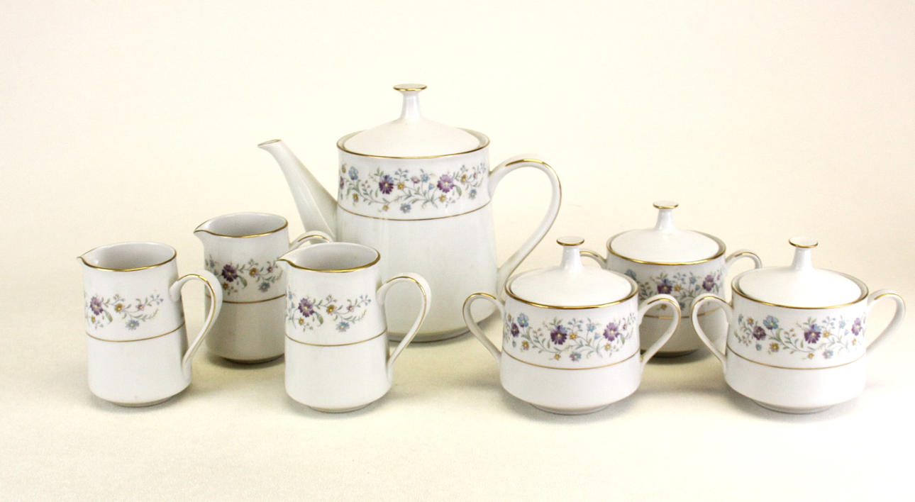 An extensive Noritake Longwood pattern tea set comprising of 6 cups, 6 saucers, 3 milk jugs, 3 sugar pots, 1 teapot and 20 side plates.