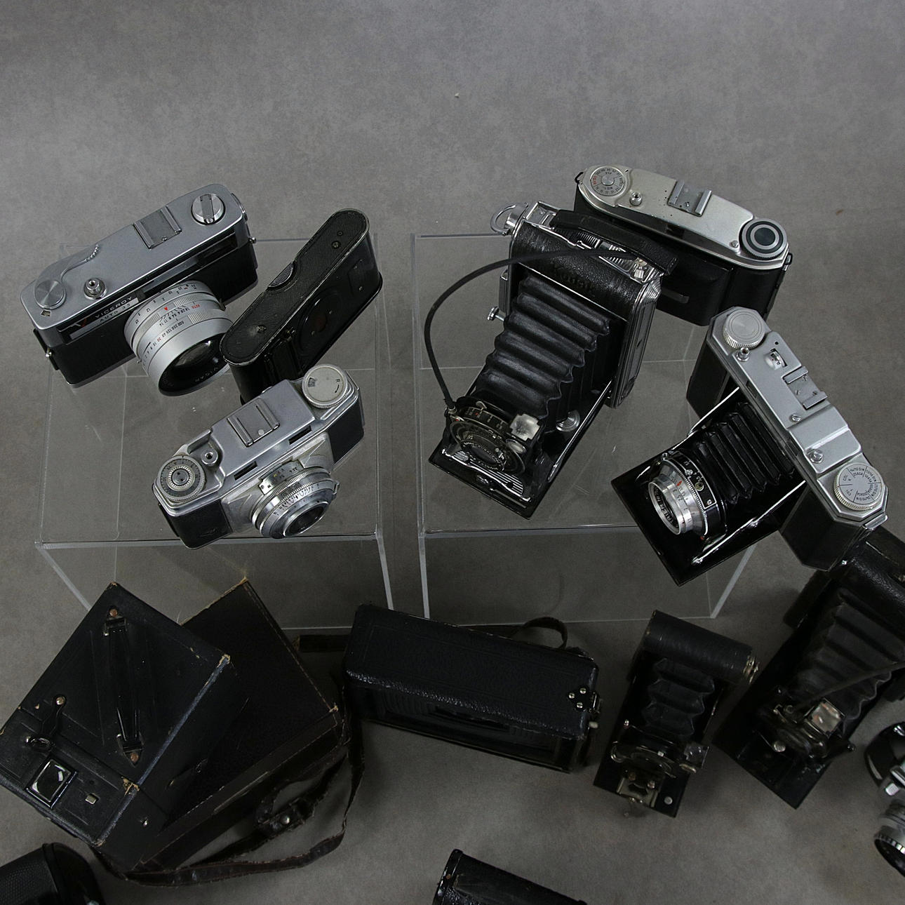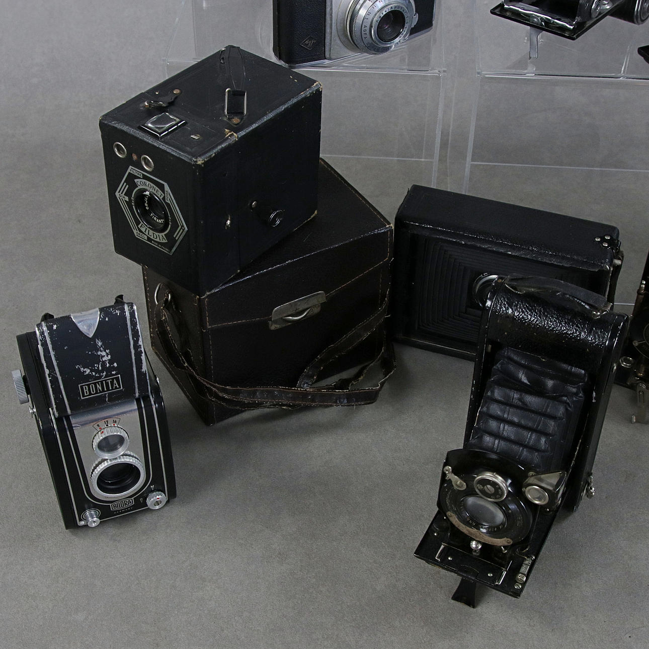 Klapp Camera Contessa-Nettel Onito, 9x12 cm, Doppel-anastigmat Citonar 6.3/13 cm Bellows camera Foitzik 6x6 cm, Foicar 3.5/75 mm, Prontor-S with bag Ernemann bellows camera 6x9 cm, Doppel-Lens, wire release, brand Stölten & Simmonsen, Copenhagen B Box camera Bilora Bonita 6x6 cm, bag Balda Baldi 29, 6x6 cm, Baldanar 2.9/80 mm, Pronto Bellow camera Foth, 6x9 cm, Doppel Anastigmat 4.5/105 mm, bag Bellow camera 6x9 cm, Kodak Junior 620, Kodak-Anastigmat 6.3/10.5 cm, wire trigger Small image camera Baldamatic II, Color-Isconar 2.8/45, Pronto-LK, bag Bellows camera ICA Halloh 505, 9x12, Extra-Rapid-Aplanat Helios 8/13 cm, 10. Box camera Coronet Fildia, Objectif Meniscope Tiranty, 6x9 cm, bag Thumbnail camera Viceroy Auto 35, Vicar 1.8/45 mm Kodak Vest Pocket Autographic Camera, with pen, bellows, no lens, no cover=metal housing Thumbnail camera Agfa Super Silette, Apotar 3 ,5/45, Prontor-SVS, bag.