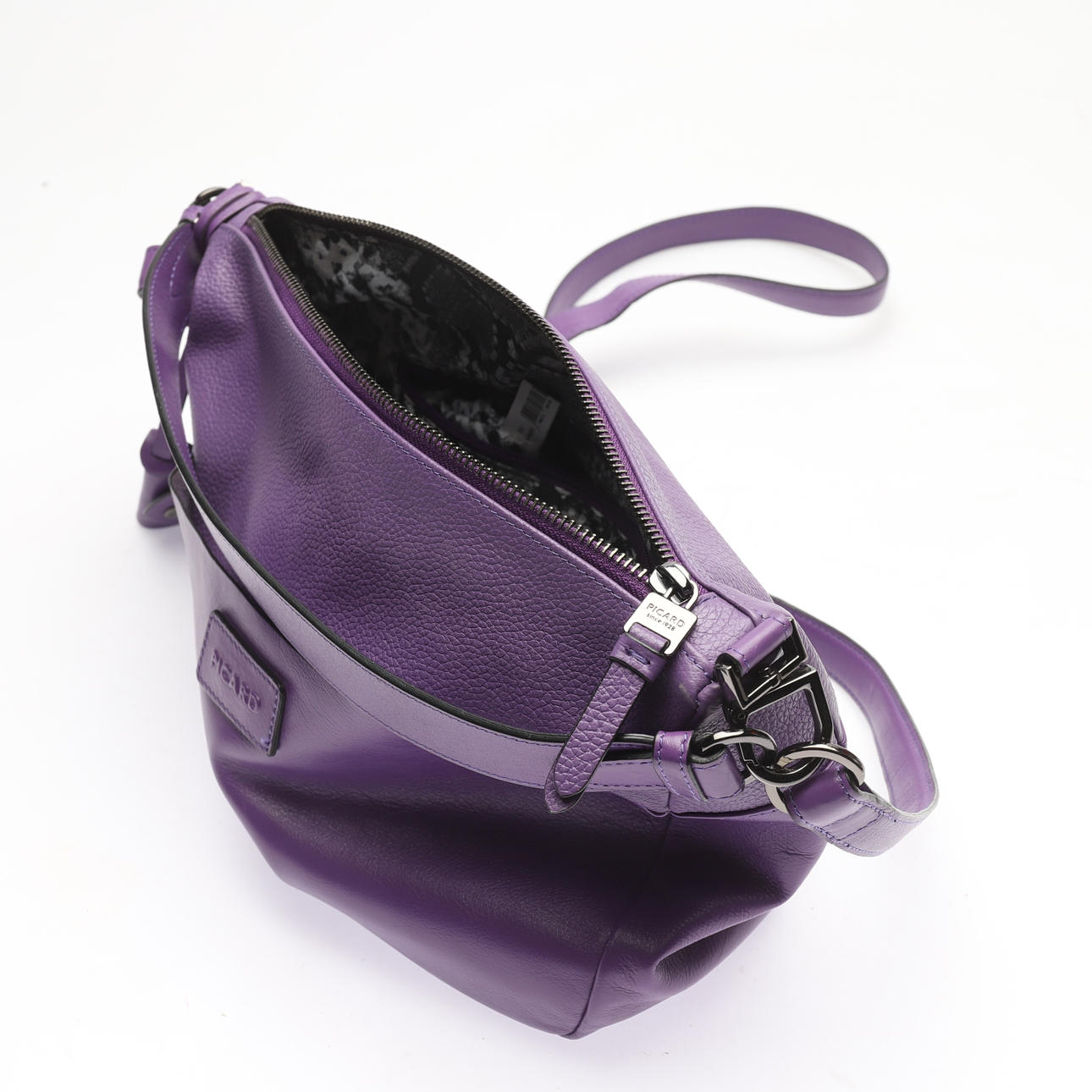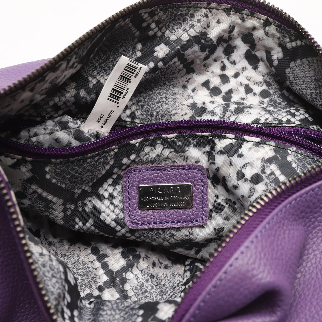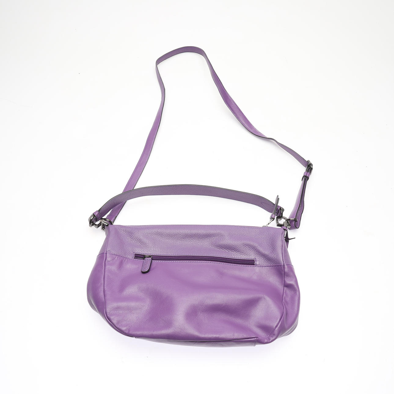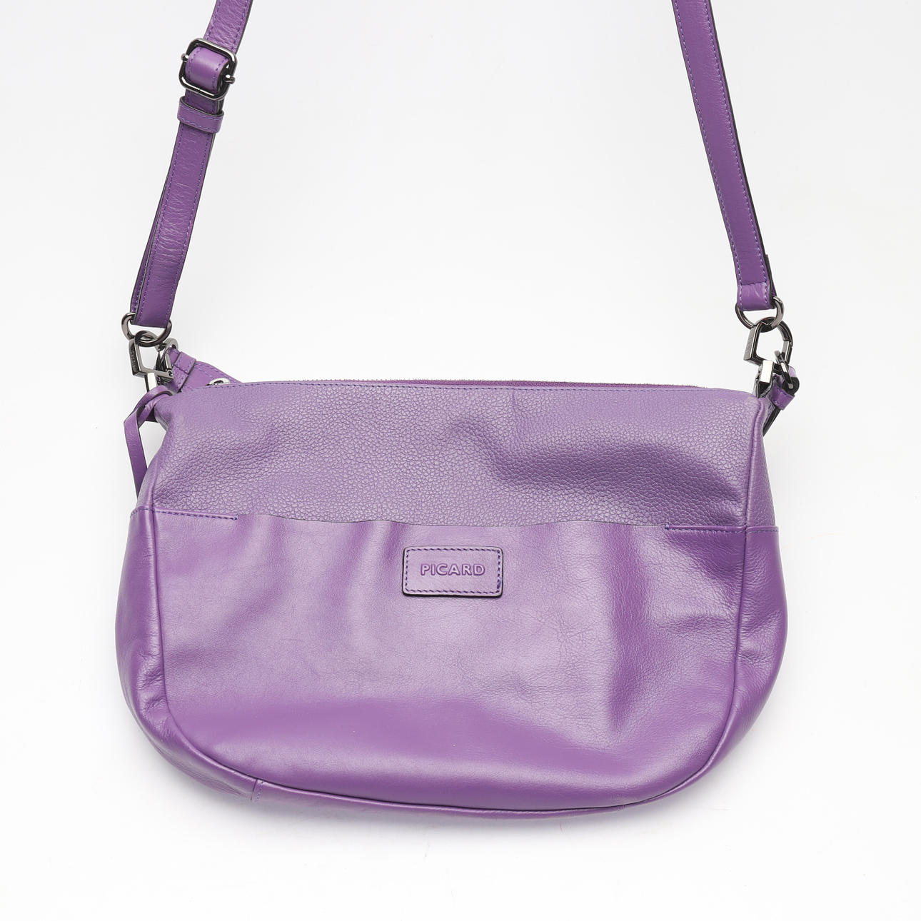 With handle and adjustable shoulder strap. Purple colored. Model 9543. Length approx. 34cm, width approx. 8cm, height excluding handle approx. 24cm.