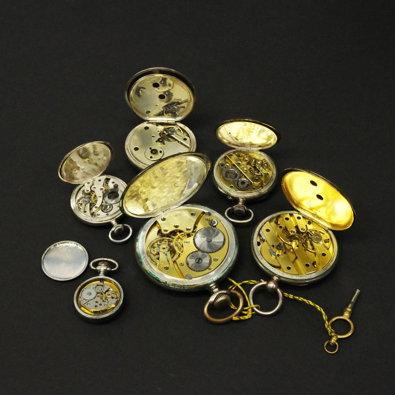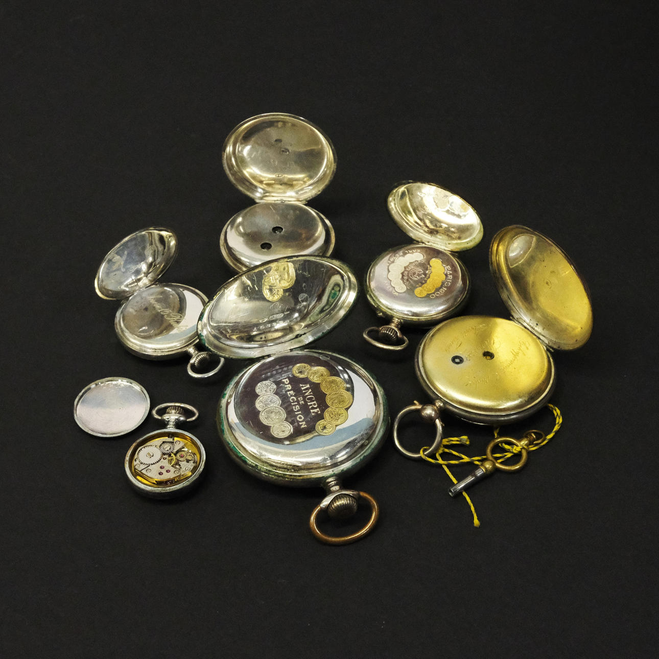 Four pocket watches were working at the time of cataloguing. No functional guarantee is provided. Three dials with cracks, one dial with dots. Two rear housings with engraving.