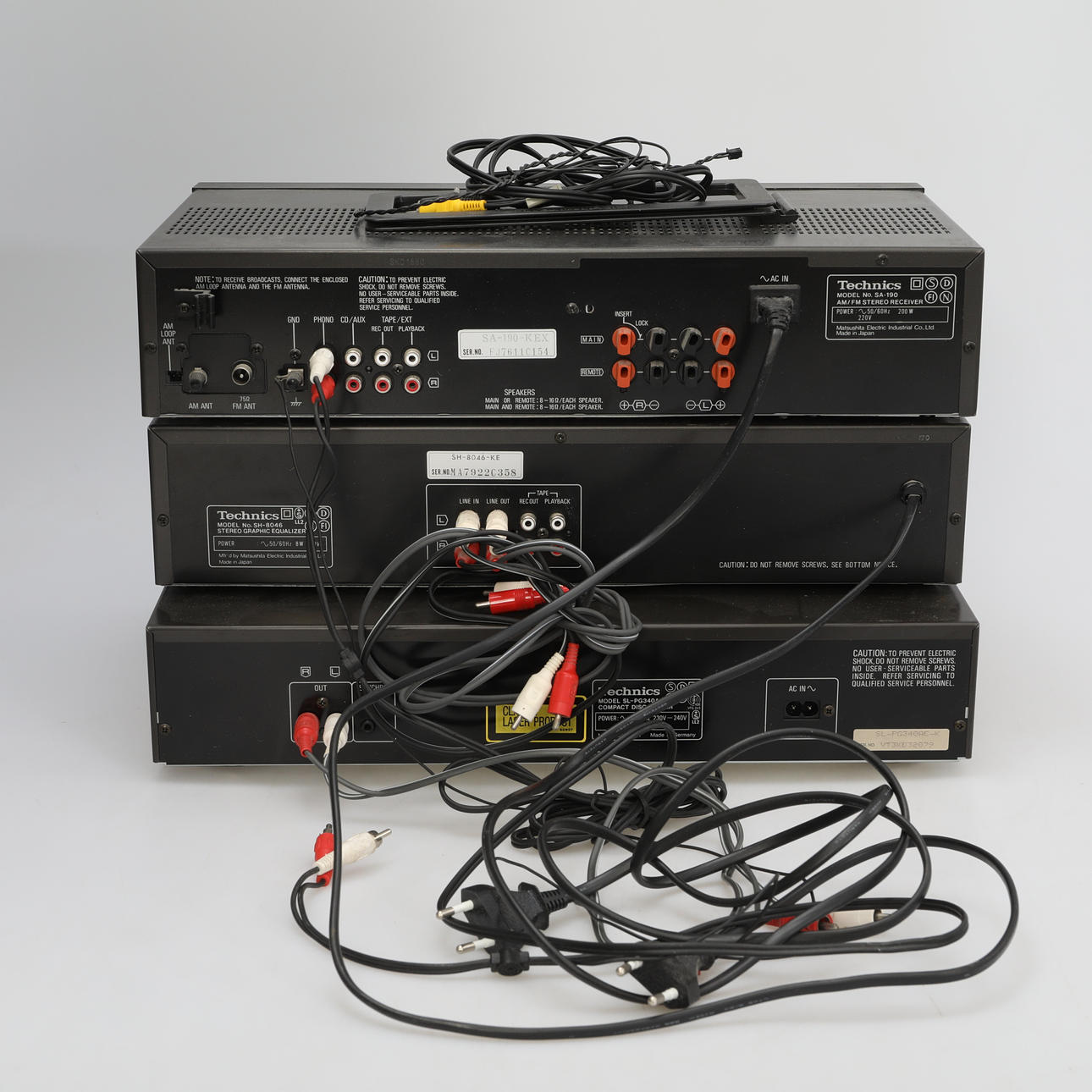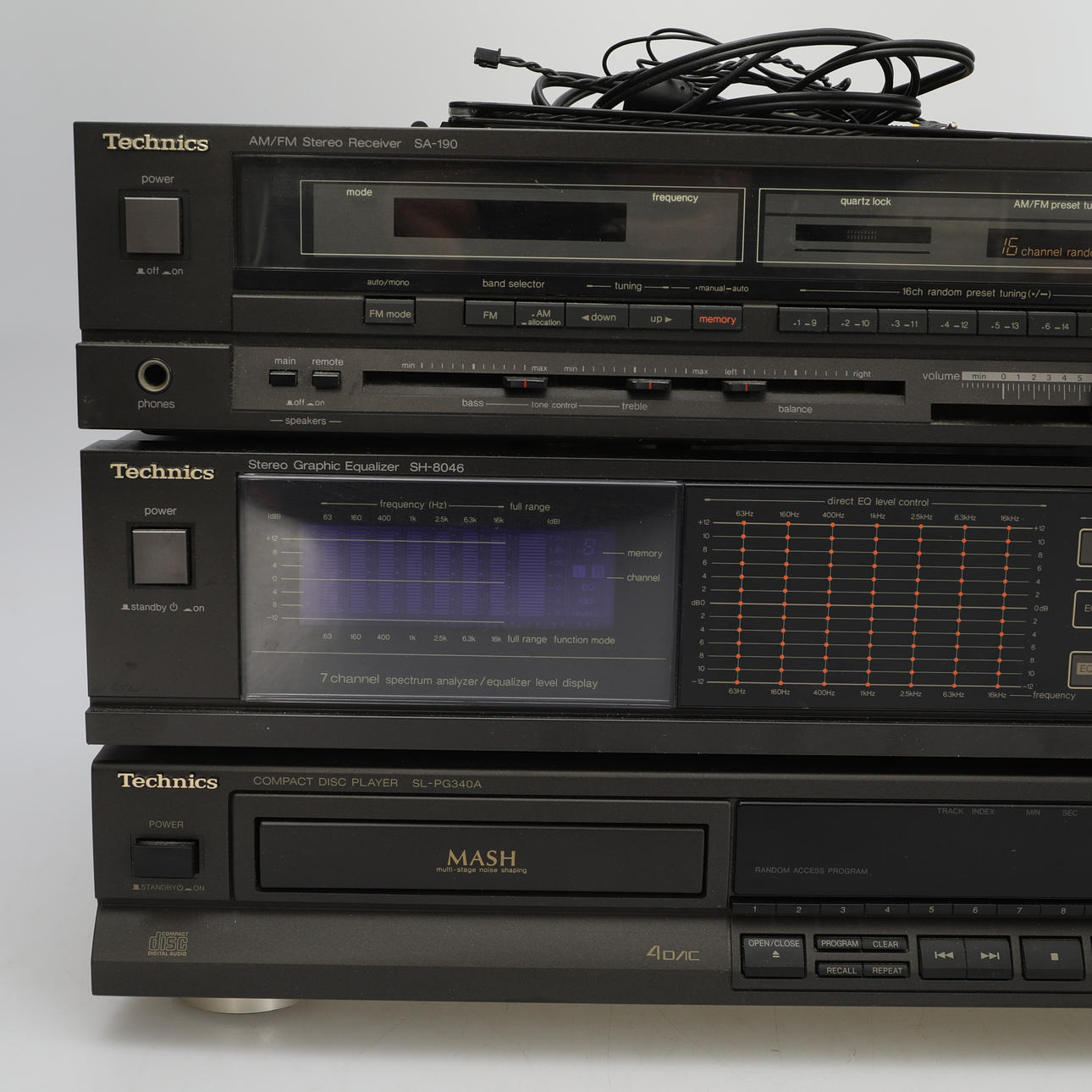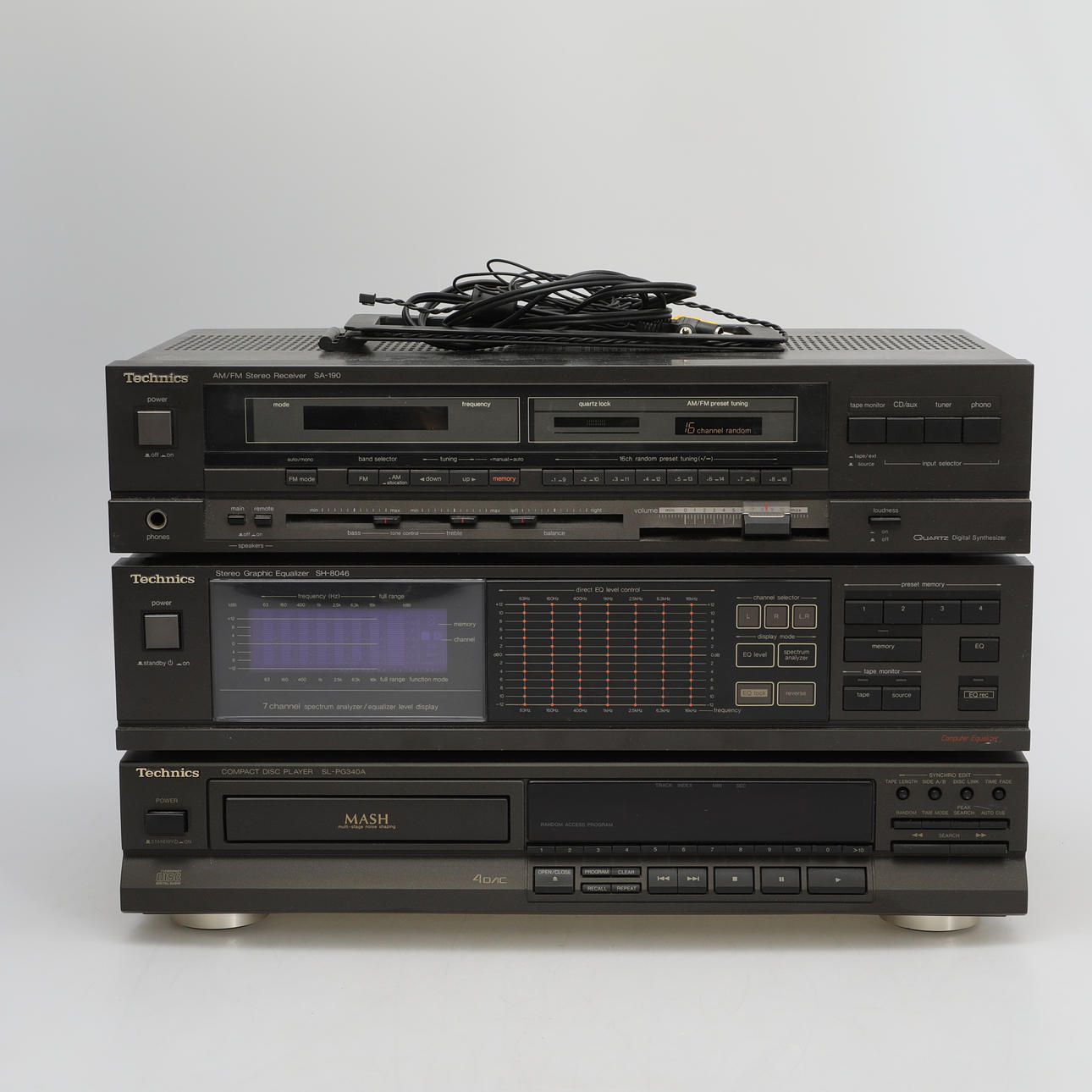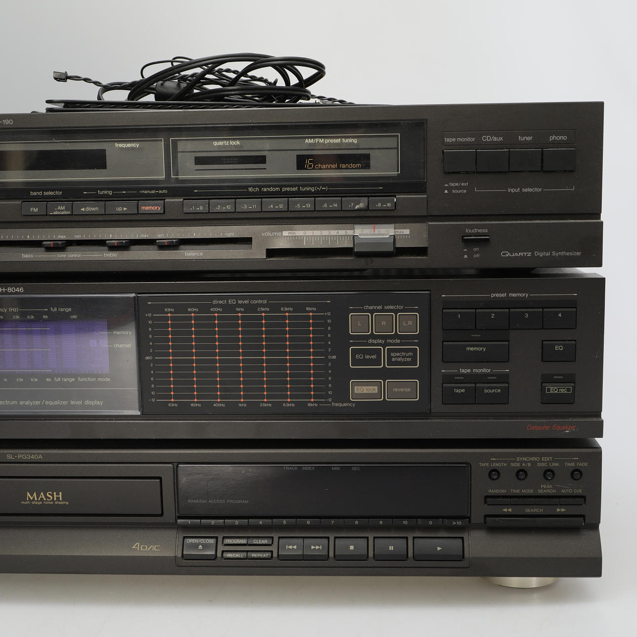 Equalizer SH-8046 AM/FM Stereo Receiver SA-190 Compact Disc Player SL-PG340A Standing on top of each other, they measure: Height 28 cm Width 43 cm Depth 28 cm.