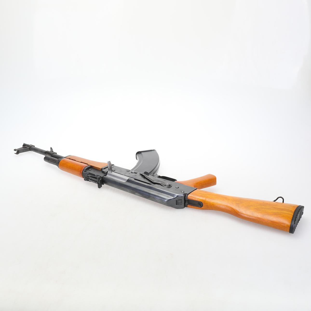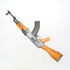 A replica of an AKM (Automatkarbin Modified) it is based on the classic AK-47 Kalashnikov but has a straighter butt to prevent recoil when shooting automatic fire with the weapon.