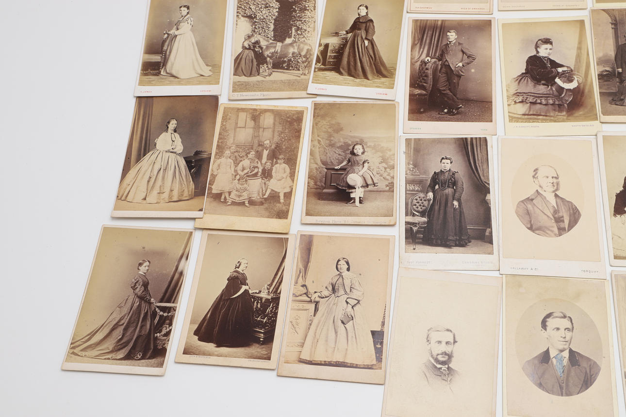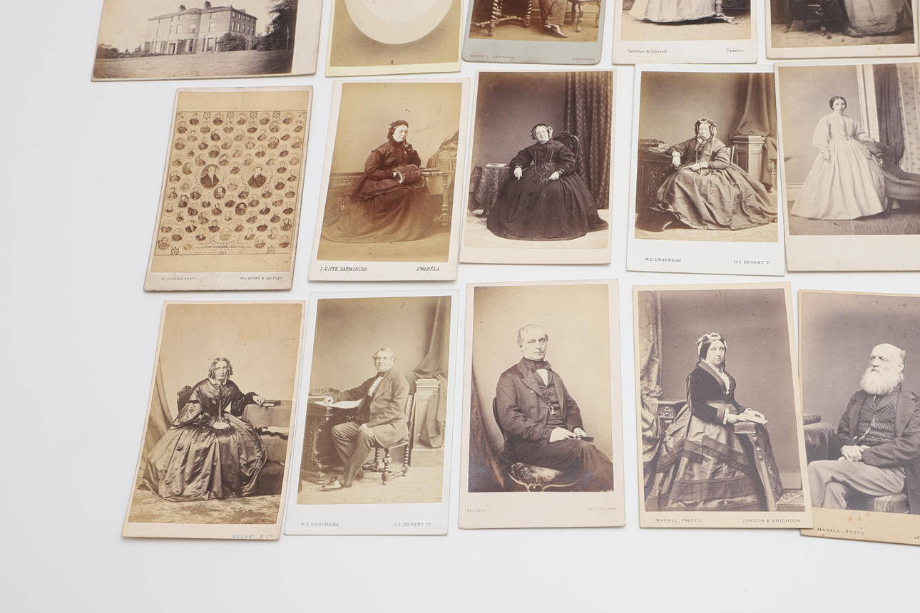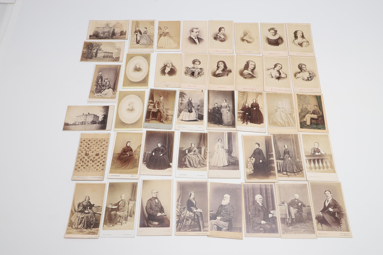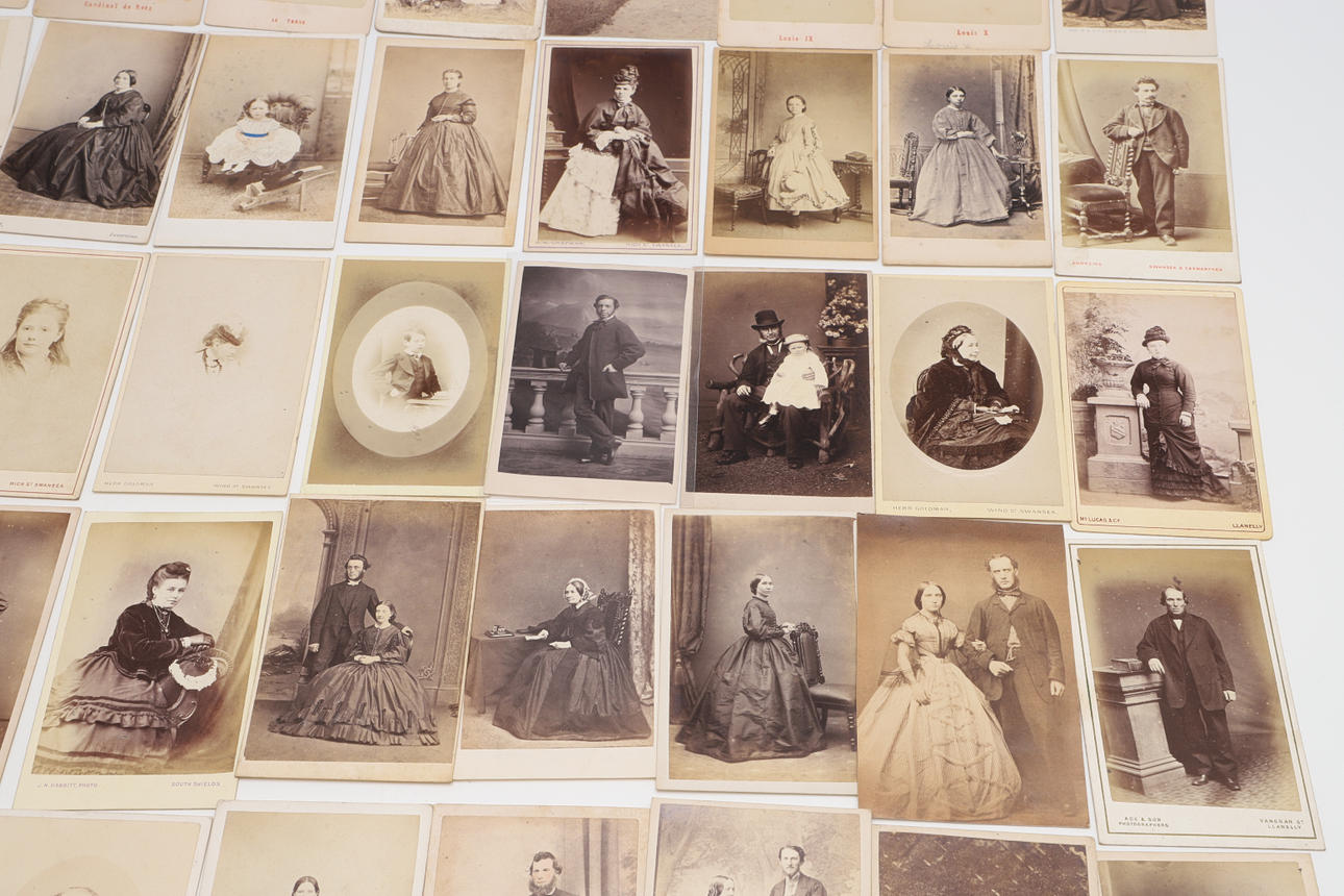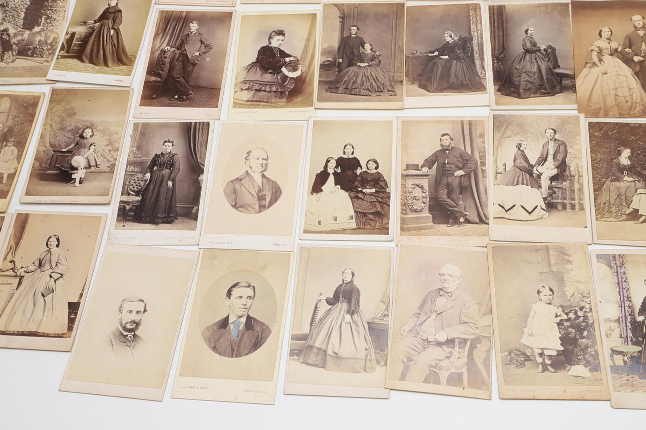 A collection of approx 95 carte de visite photograph cards, circa 1860-1870 including single figures and family groups, Royalty and other examples. Each marked with the photography studio to the reverse.