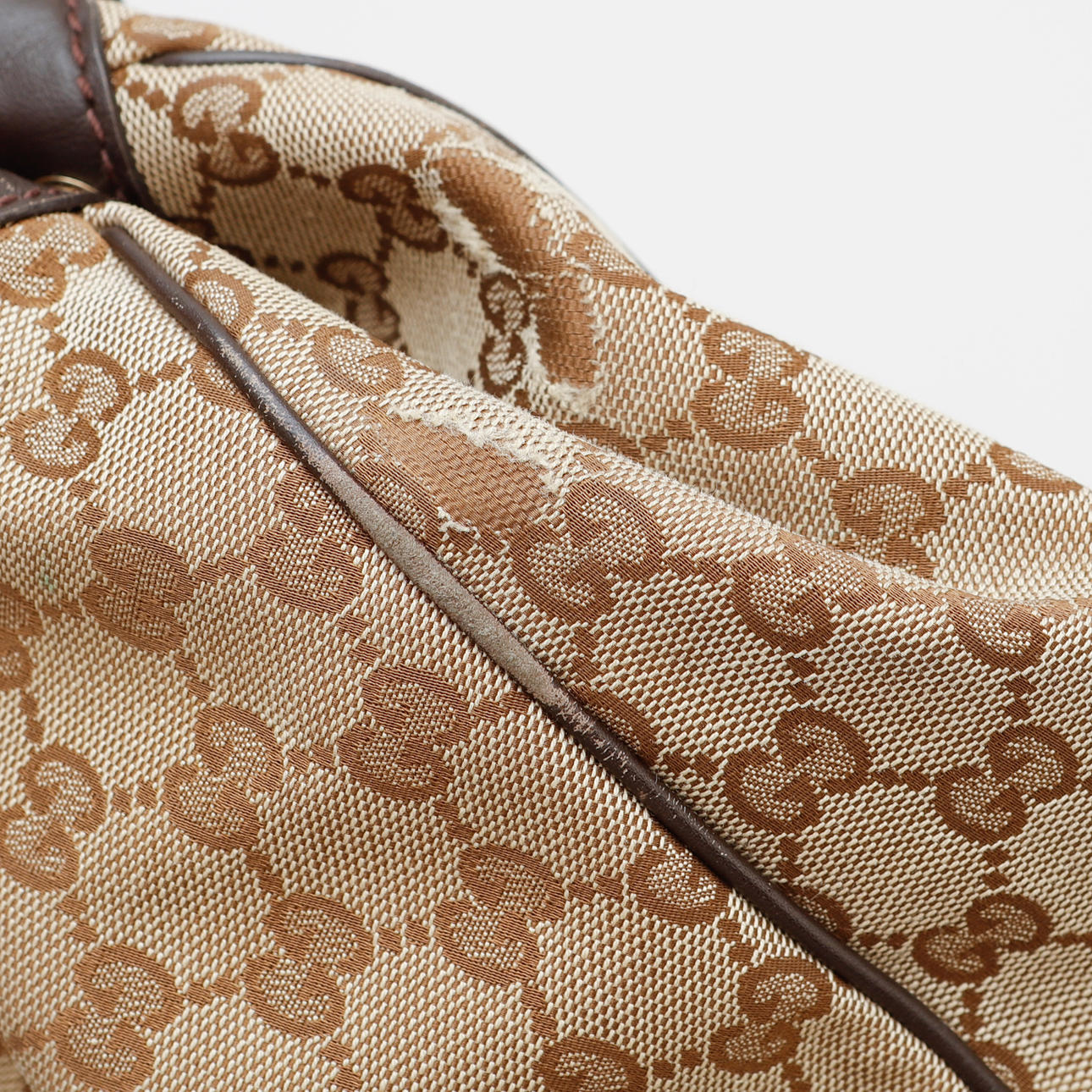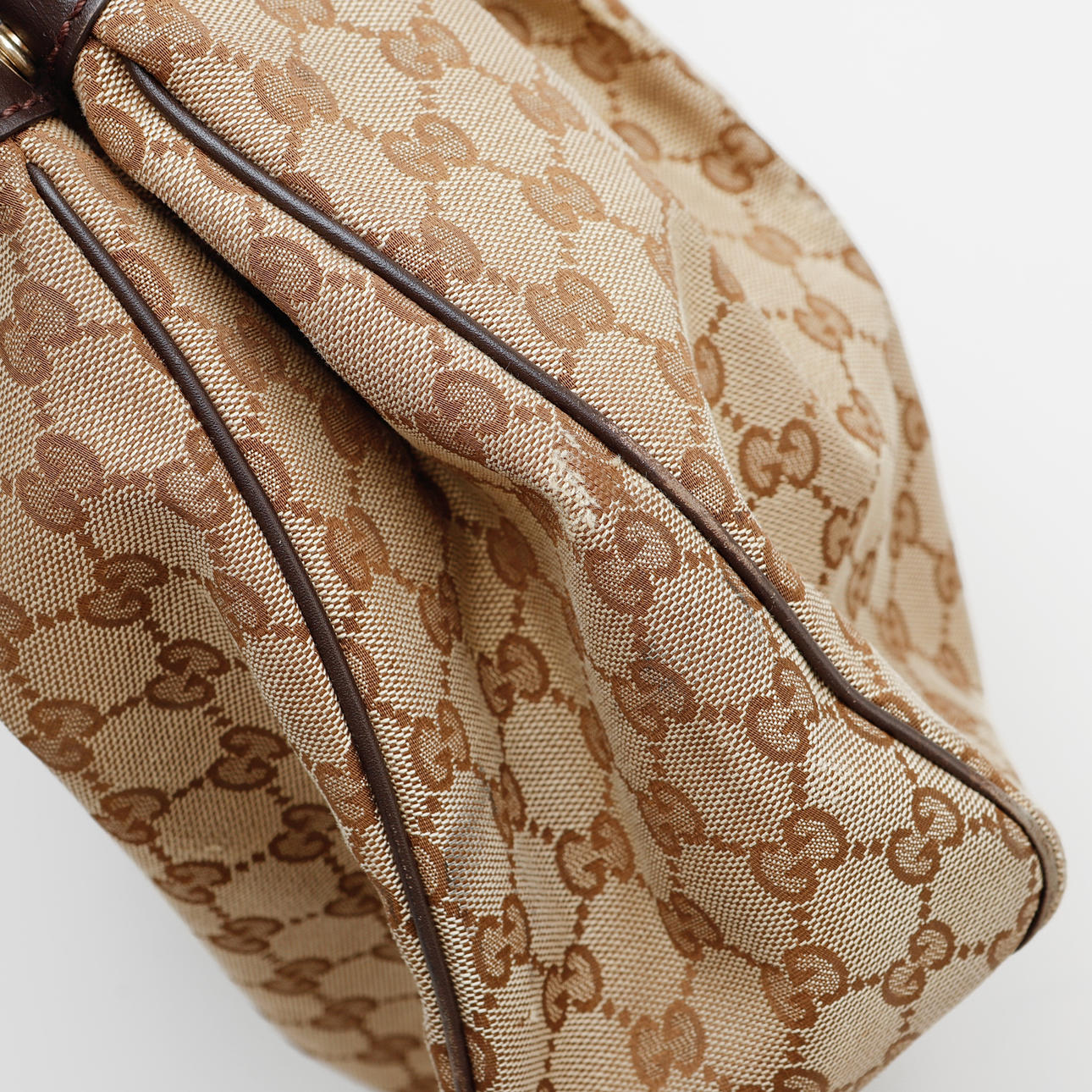 Bag in monogram patterned canvas. Details in dark brown leather. 1 inner compartment with zipper. Marked Gucci made in Italy. About 35 x 30 x 10 cm.