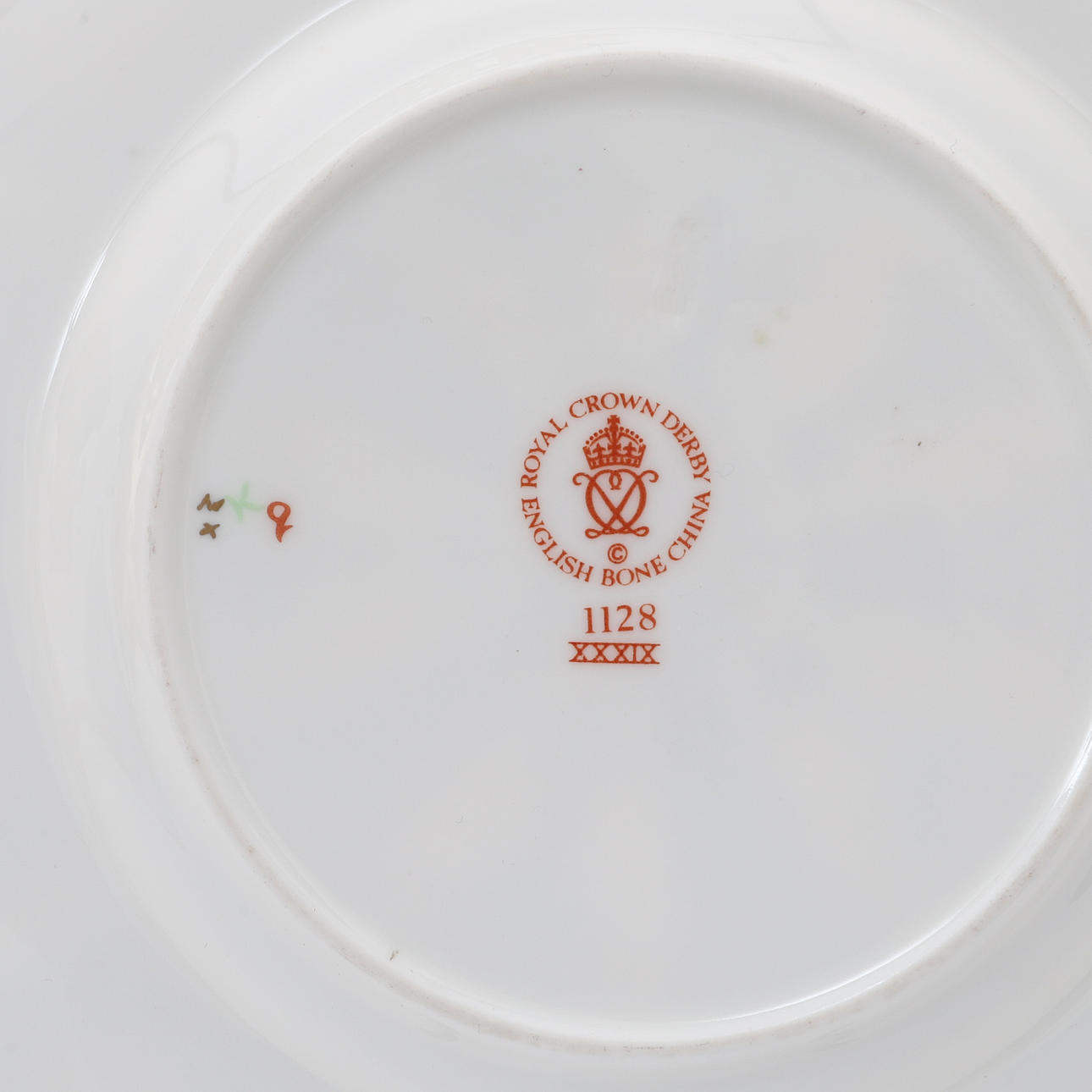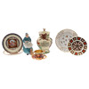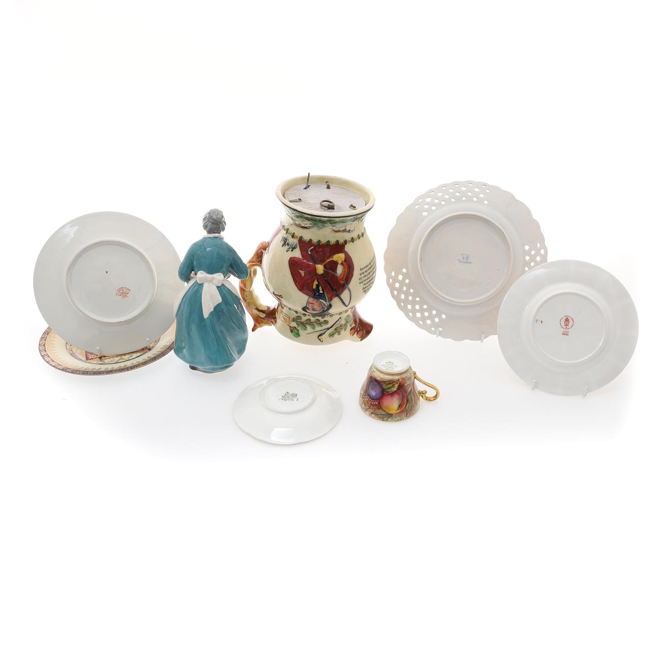 A well-painted example, decorated in relief with a fox hunting scene, 19.5cm high, accompanied by a Royal Doulton figure, 'The Favourite' 19cm high, a Dresden decorated Meissen impressed reticulated plate, painted with flower-heads, 21cm diameter, a Royal Crown Derby 'Old Imari' plate, 15.8cm diameter, an Aynsley 'Orchard fruit gold' pattern tea cup and saucer and two vintage RKG plates, Czechoslovakia, 17.5cm diameter (7).