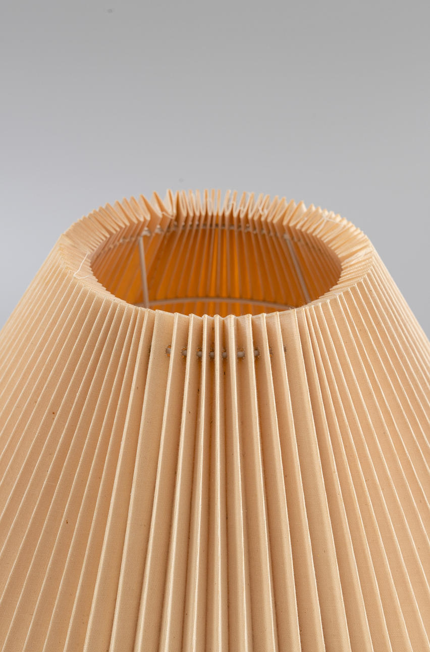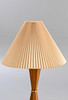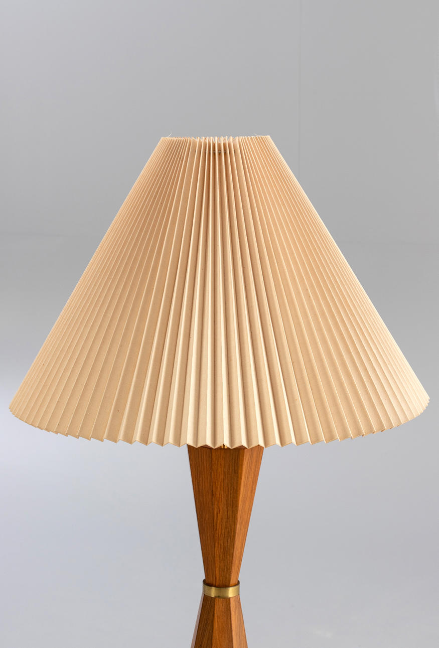 Large teak table lamp. Mid-century design. Lamp base with teak veneer and brass ring. Pleated lampshade covered in fabric. 1 burner, E27 socket.