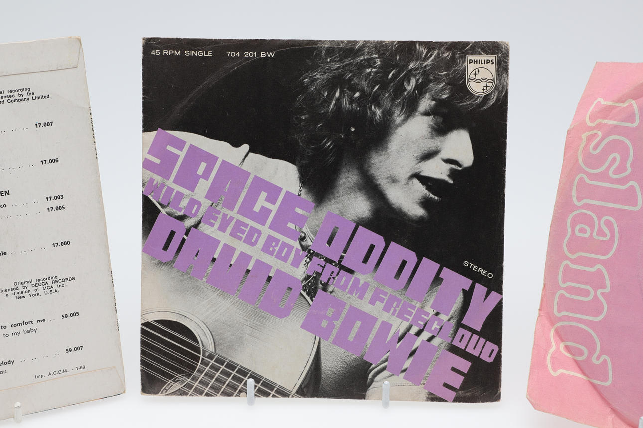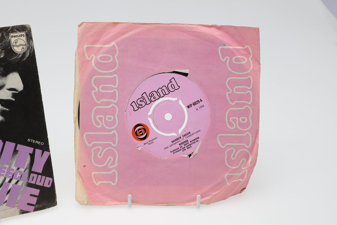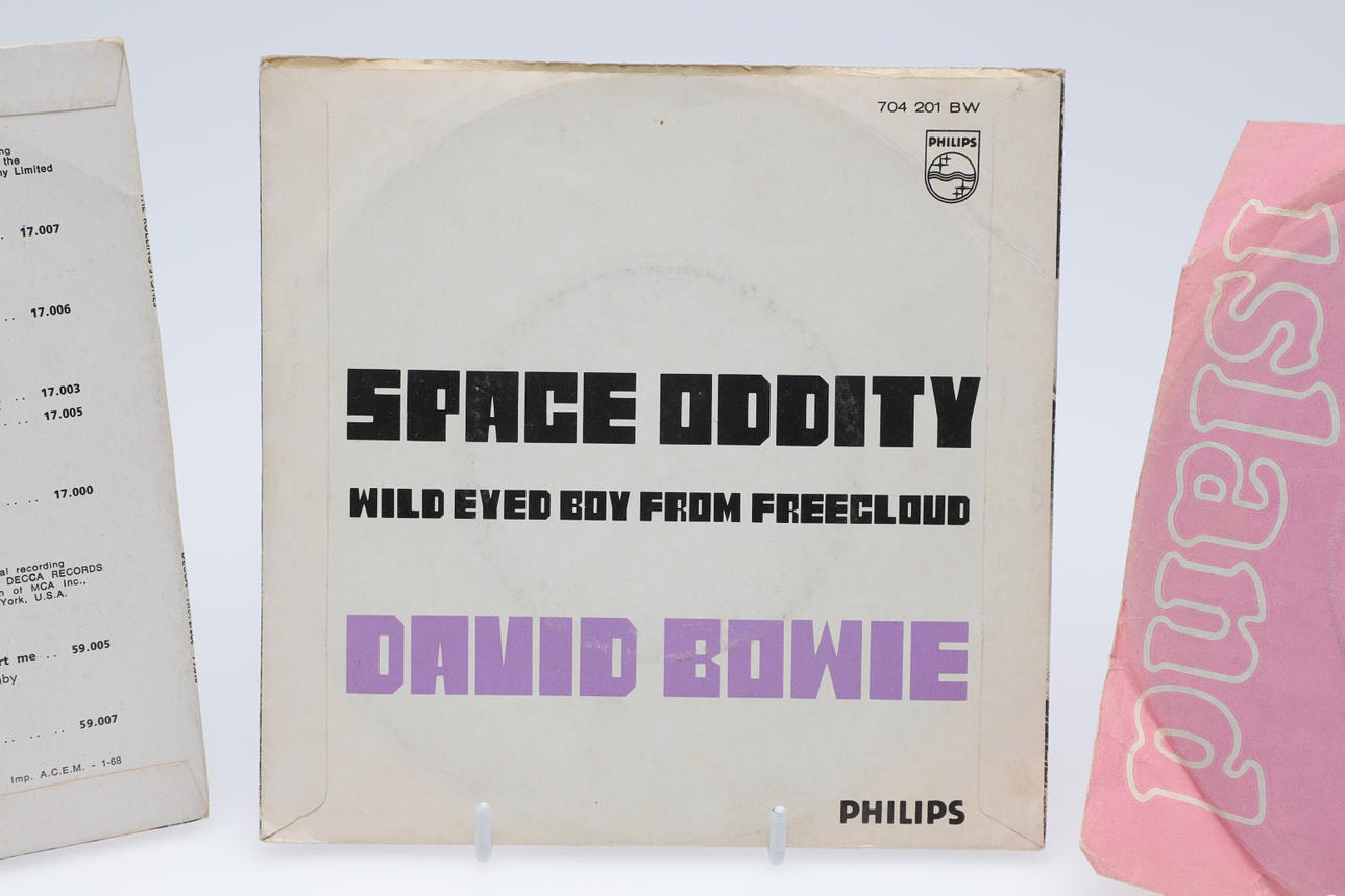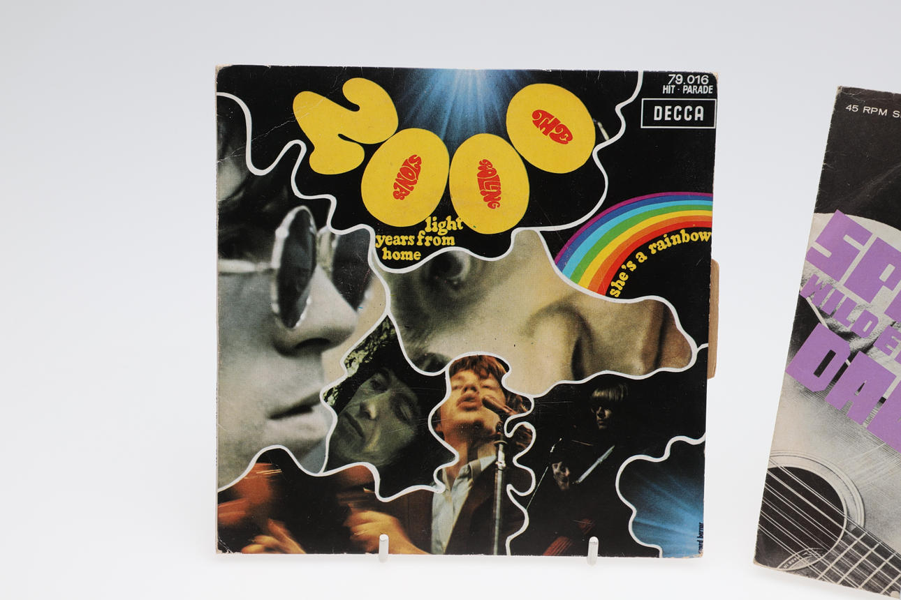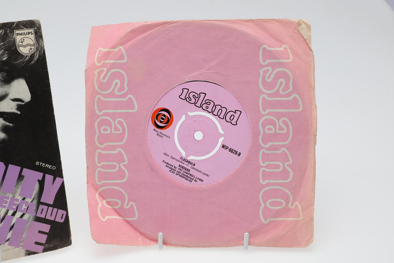 Three single records including David Bowie Dutch single Space Oddity/Wild Eyed Boy, The Rolling Stones (She's a Rainbow/2000 Light Years, and Nirvana Flashbulb/Rainbow Chaser.