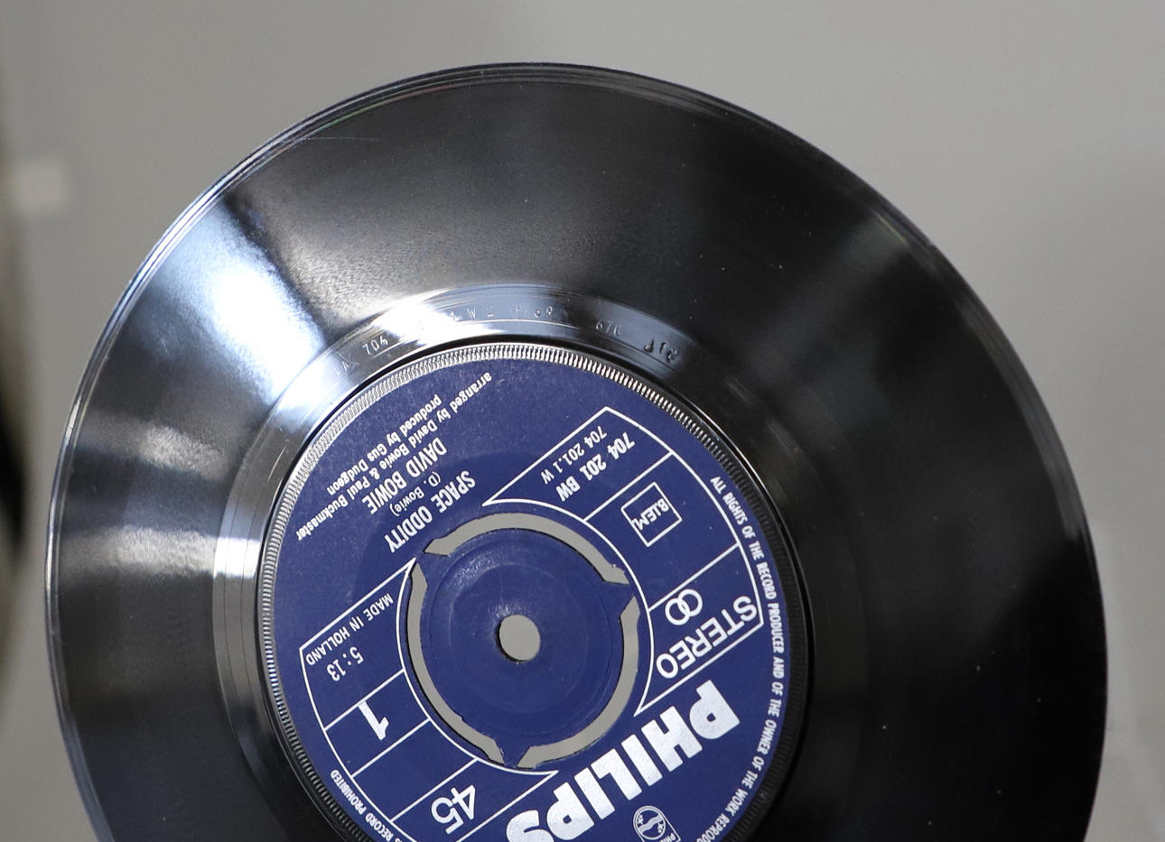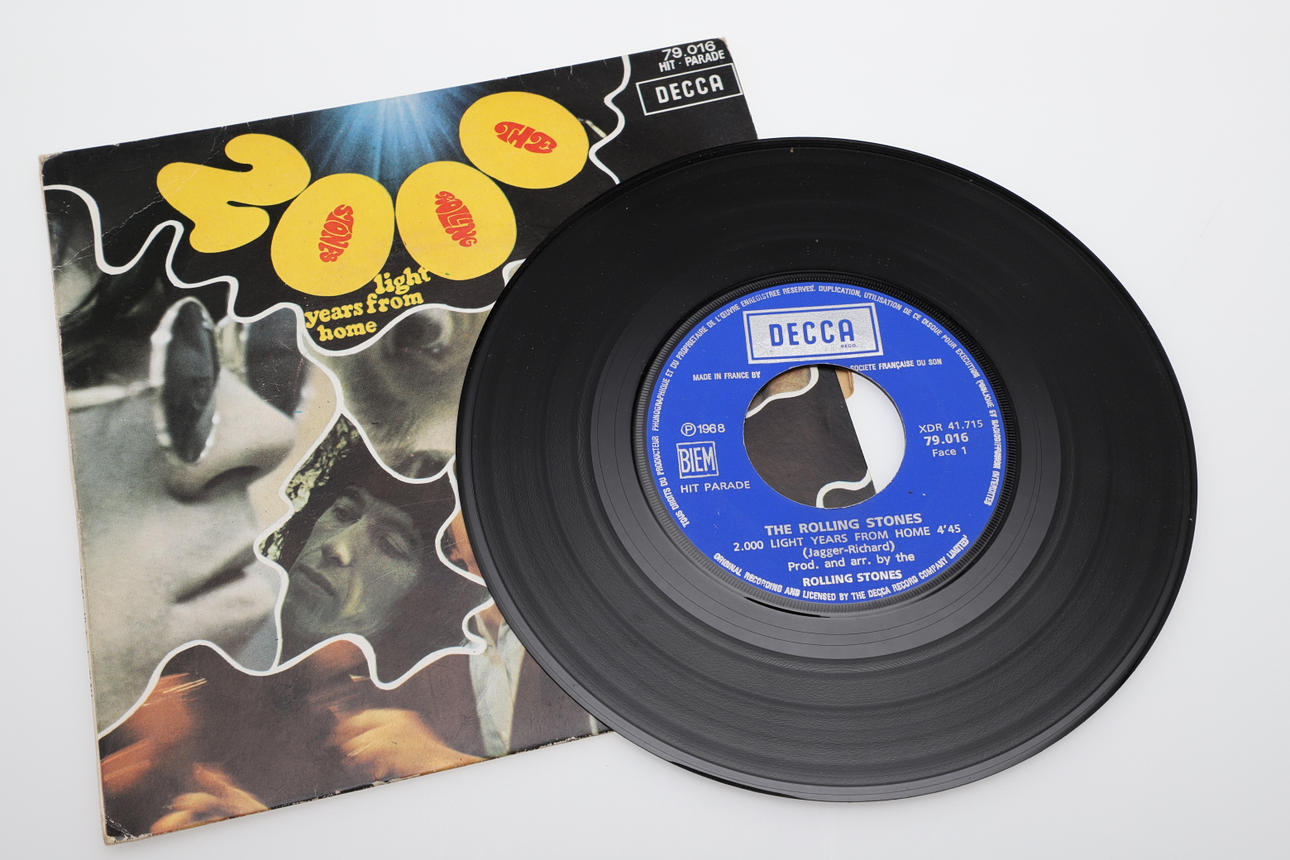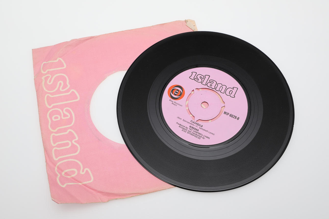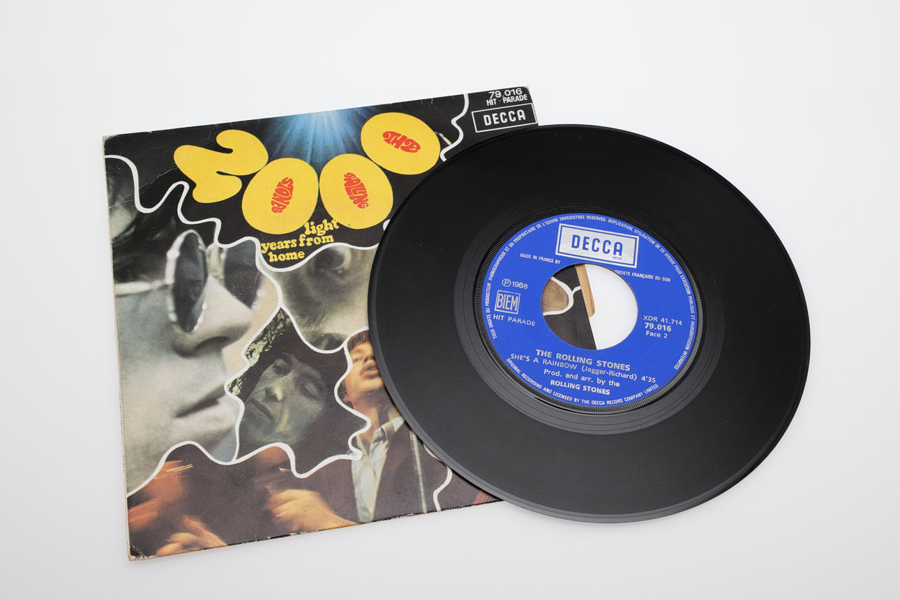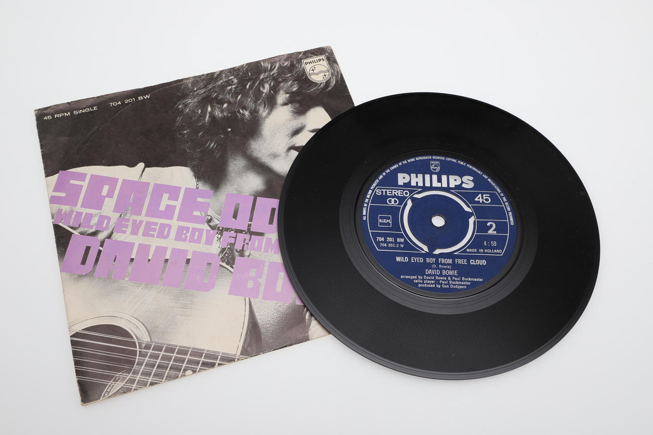 Three single records including David Bowie Dutch single Space Oddity/Wild Eyed Boy, The Rolling Stones (She's a Rainbow/2000 Light Years, and Nirvana Flashbulb/Rainbow Chaser.