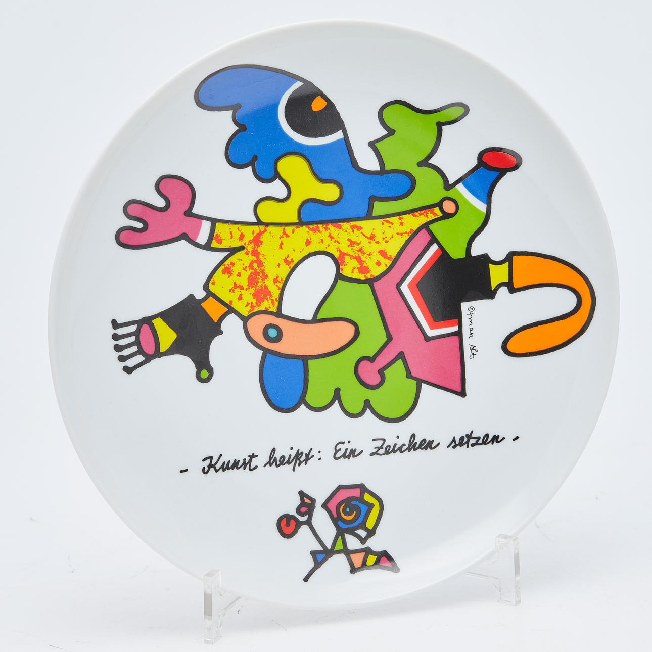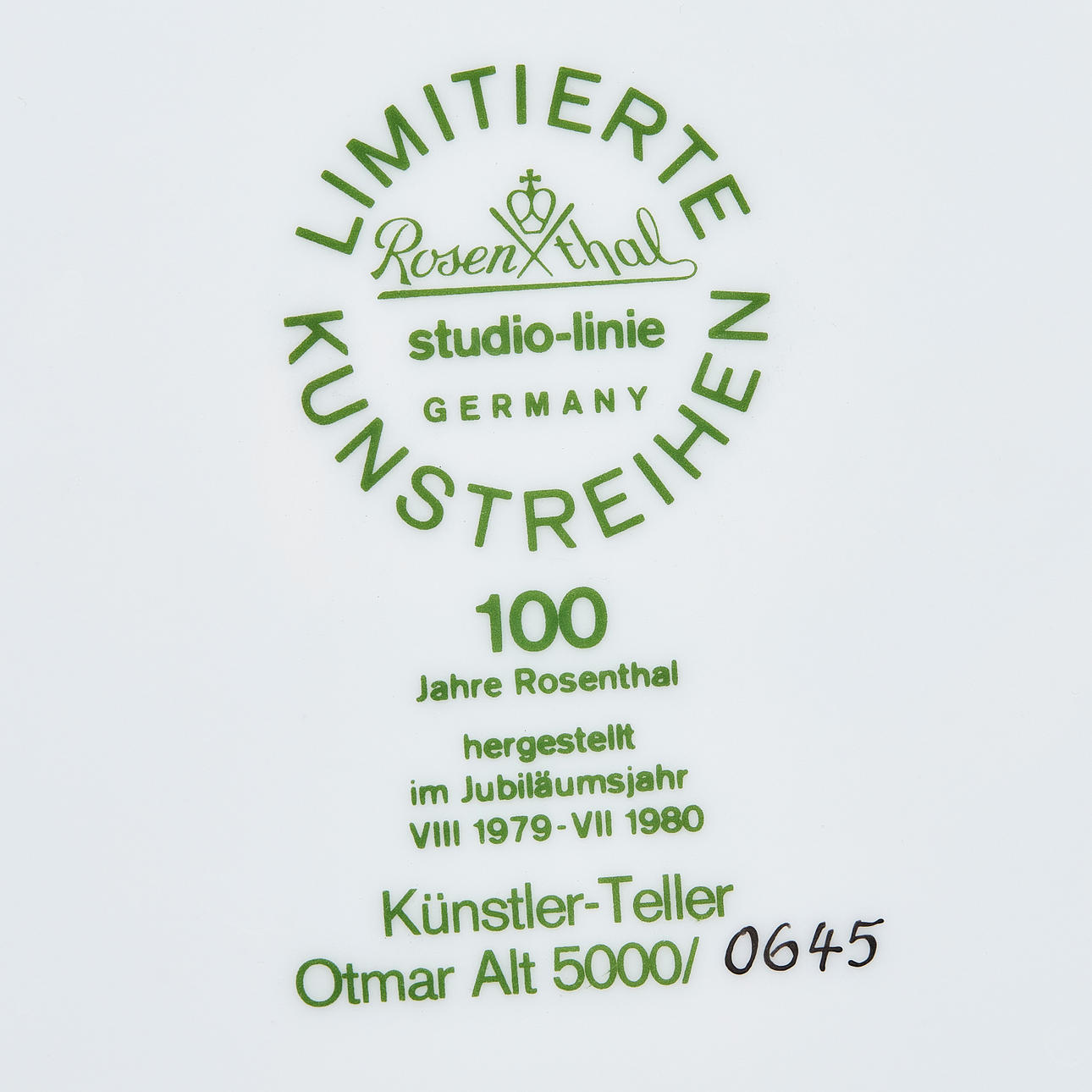 Otmar Alt (b. 1940), wall plate and book 'Puzzles', ca. 1980 Mixed lot consisting of: Rosenthal Studioline, artist plate No. 16 'Otmar Alt', made of porcelain and painted with an artist's motif in overglaze, with the inscription 'Art means: setting a sign', signed on the front, with manufacturer's designation on the back and with '5000/ 0645' edited, D.26cm Otmar Alt, book, 'Puzzles' from around 1980, with colored illustrations, photos and texts in German, attached with a colored decorative box with the artist's name, H.6cm, L.32cm, W. 25cm. (2).