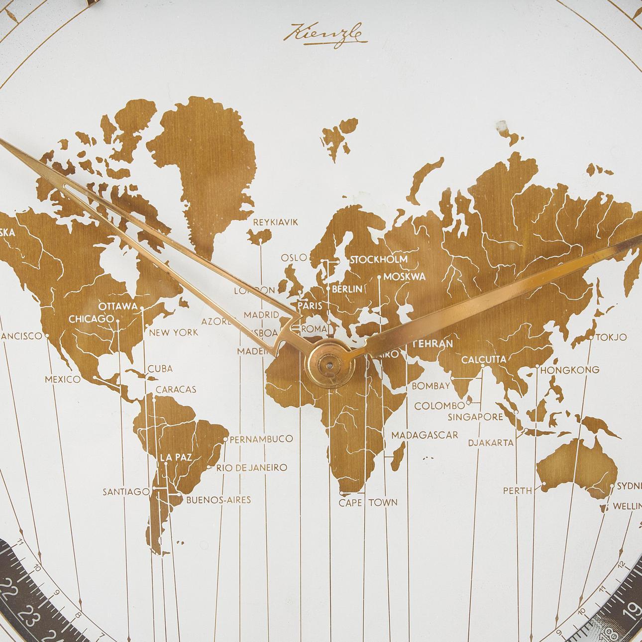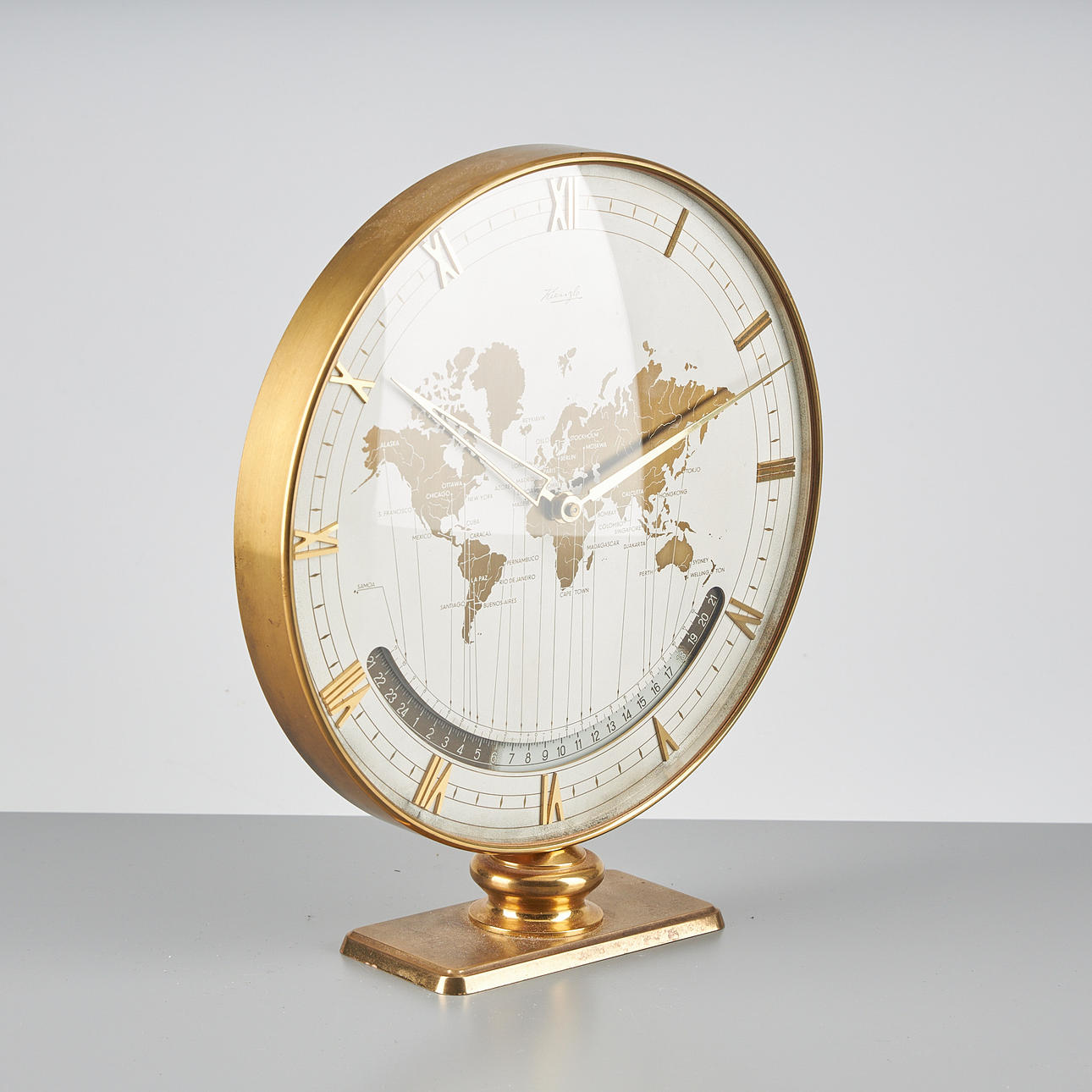 Round dial with world map. Brass foot. Height 29 cm, diameter 25 cm. Design Heinrich Möller 1938.