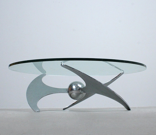 'Adjustable Table E1027' designed by Eileen Gray, manufactured by Classicon. Draft: 1927. Chromed metal frame, crystal glass top. Glass plate marked with manufacturer's label and stamped 'DA19611' on the frame.