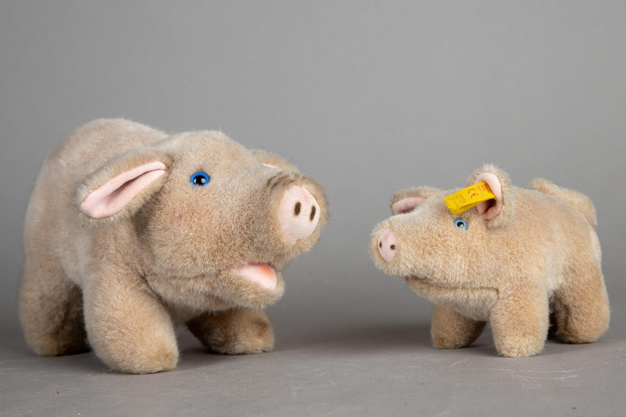 Teddy bear, cat and two pigs (4), Steiff, bear with a two-part brass button and embossed lettering, cat and pigs with a lens button and embossed lettering, size in the same order approx.: 28cm, 16cm, 15 and 9cm.
