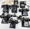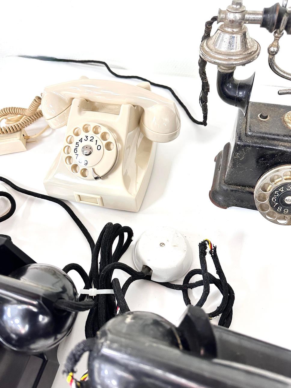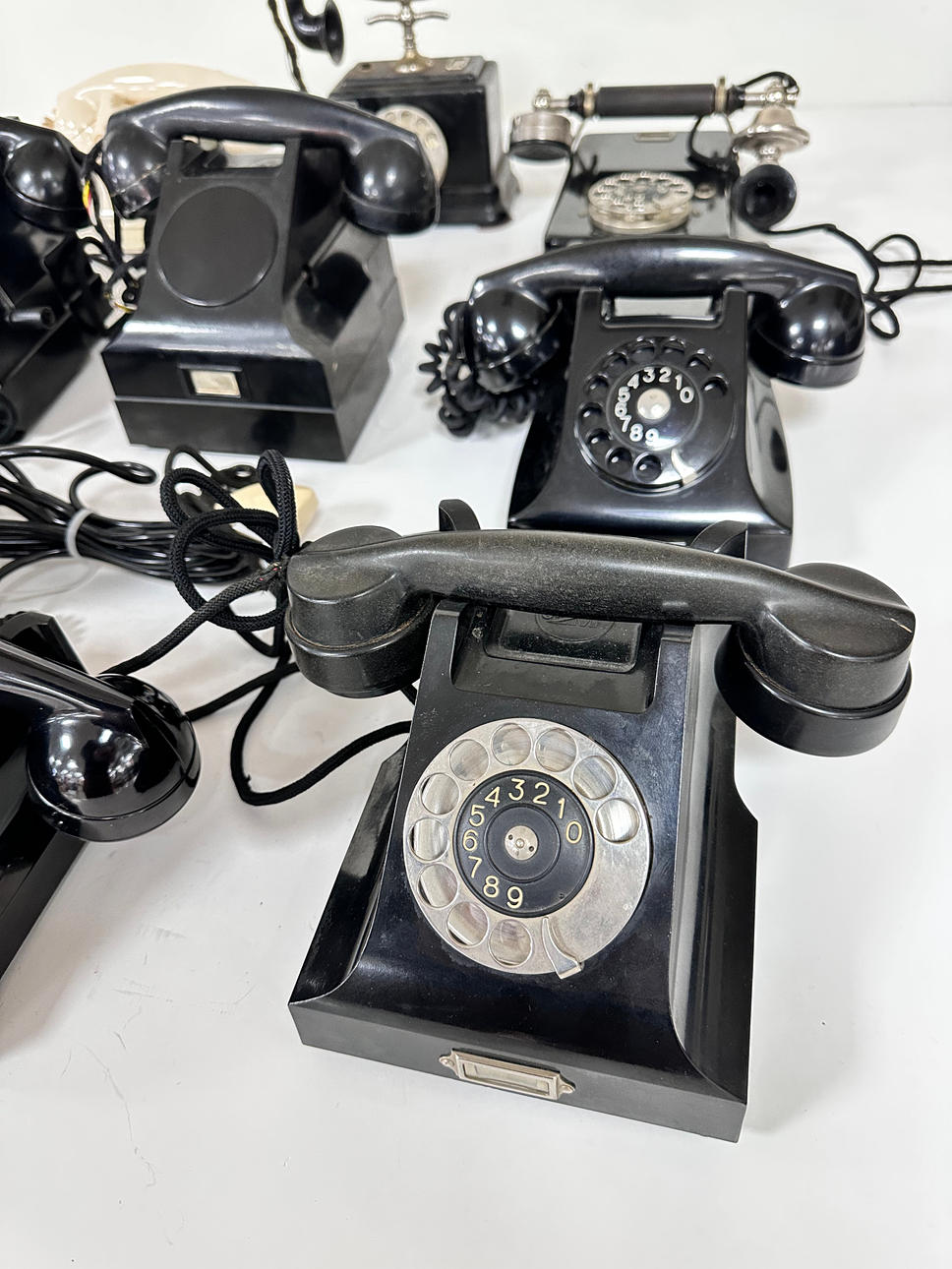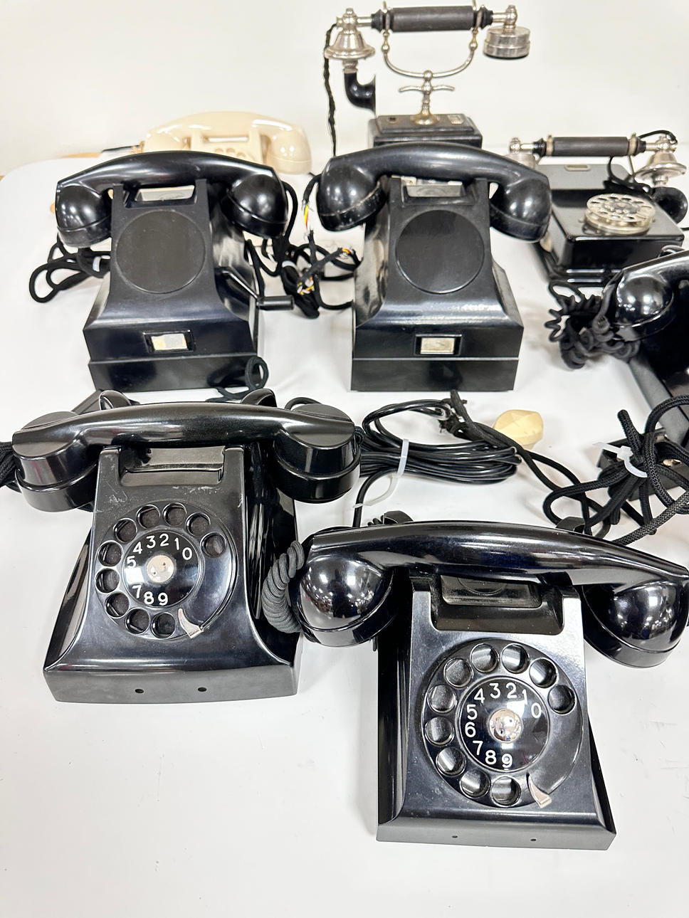 Bakelite. 8 table phones and 1 wall phone. Height between 13-22 cm.