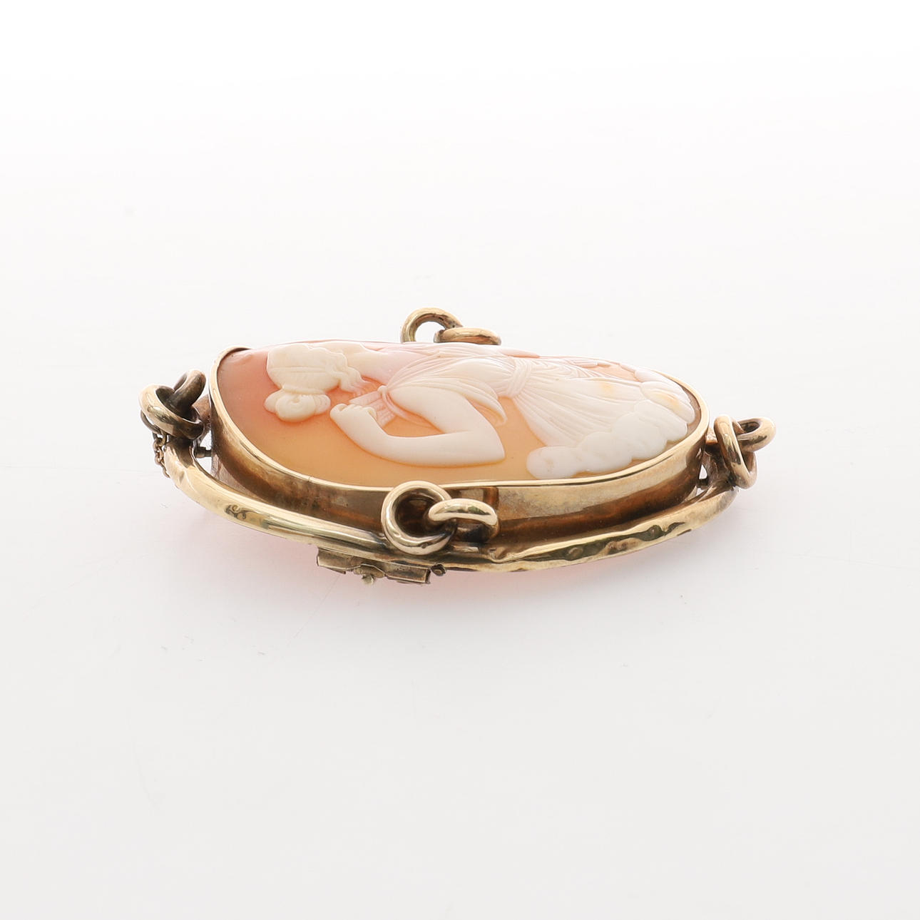 unmarked, carved with a figure of Artemis, with bow and arrows, the frame applied with two entwined rings 7cm high x 5.5cm wide, 24.5g gross, with safety chain.