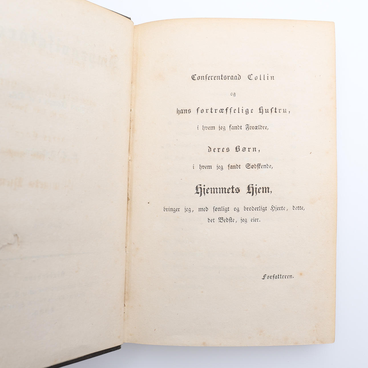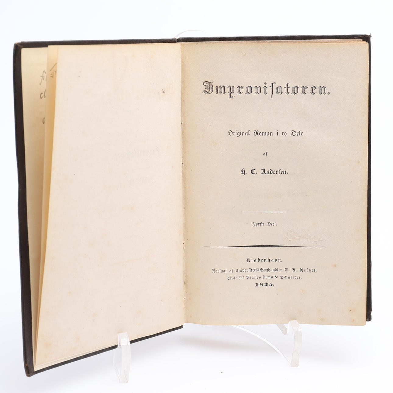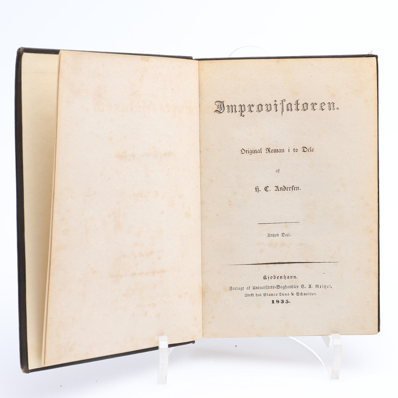 Andersen, H. C., Danish writer, (1805-1875). The Improviser I-II. Original Roman in two Dele. C. A. Reizel Kiøbenhavn, , 1835. HRS. C. Andersen's novel debut. Two 8vo volumes in contemporary ball binding with gilt spine text, gilt spine decoration and blind decorated covers. (VIII), 228 p. + (VI), 266 p. , (II) last blank.