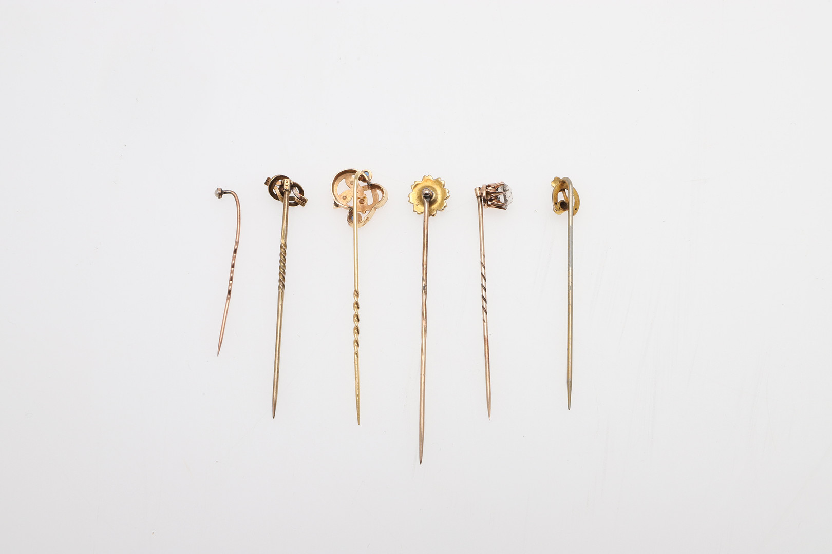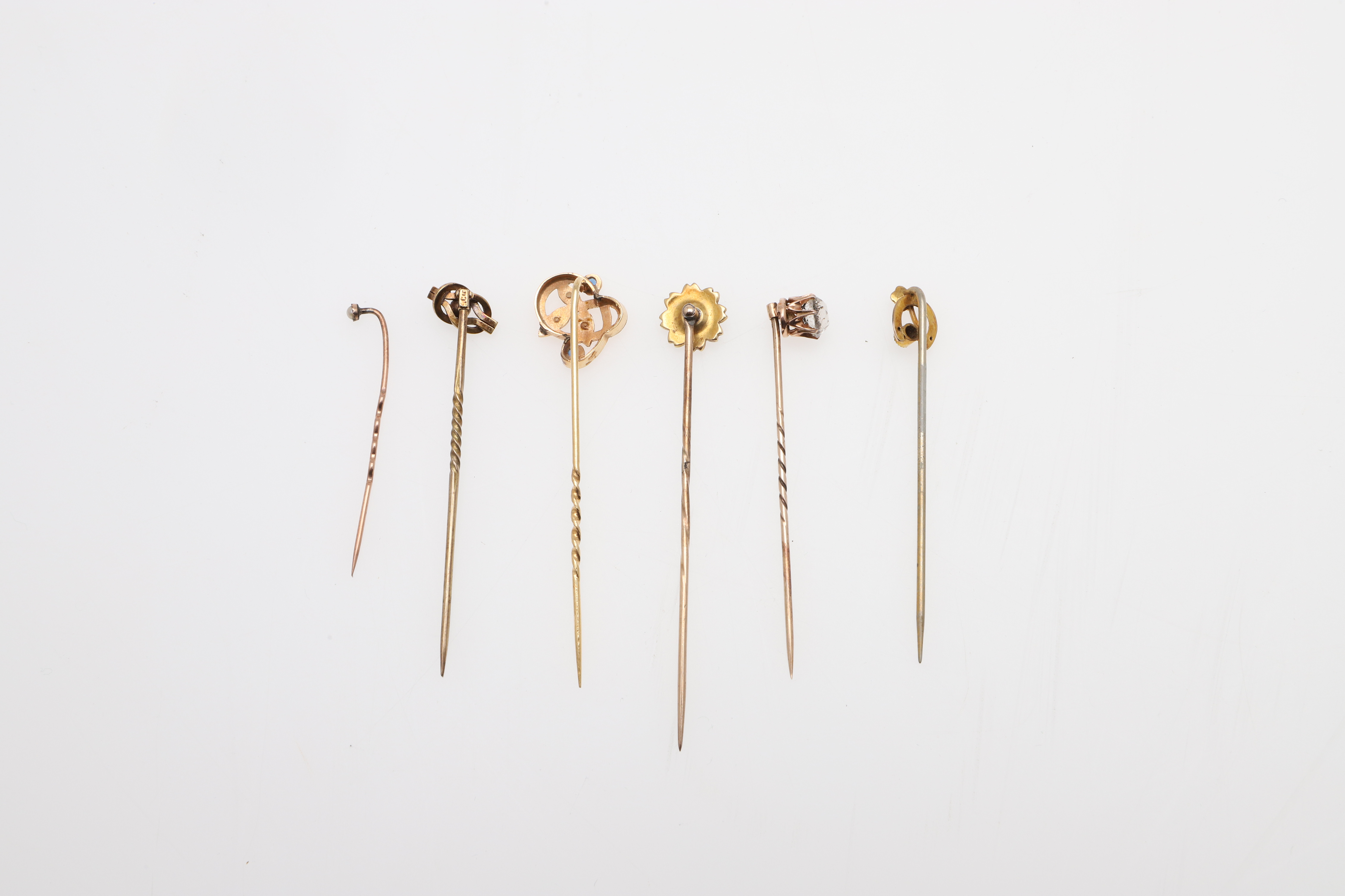 2829248. A DIAMOND AND GOLD STUD/STICK PIN.