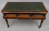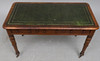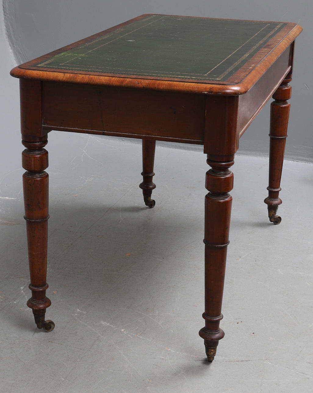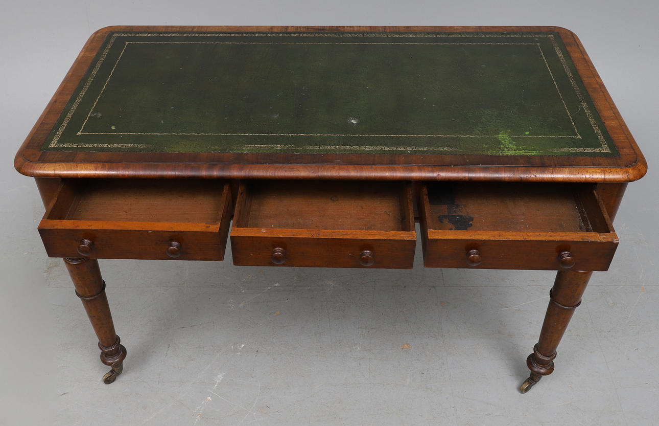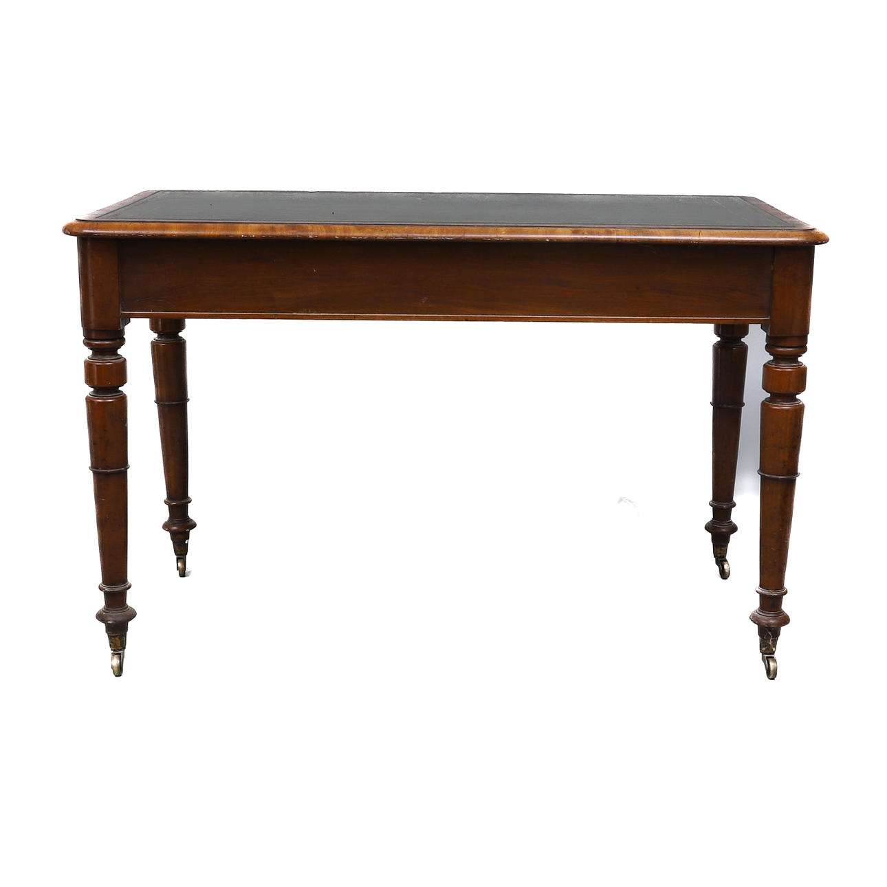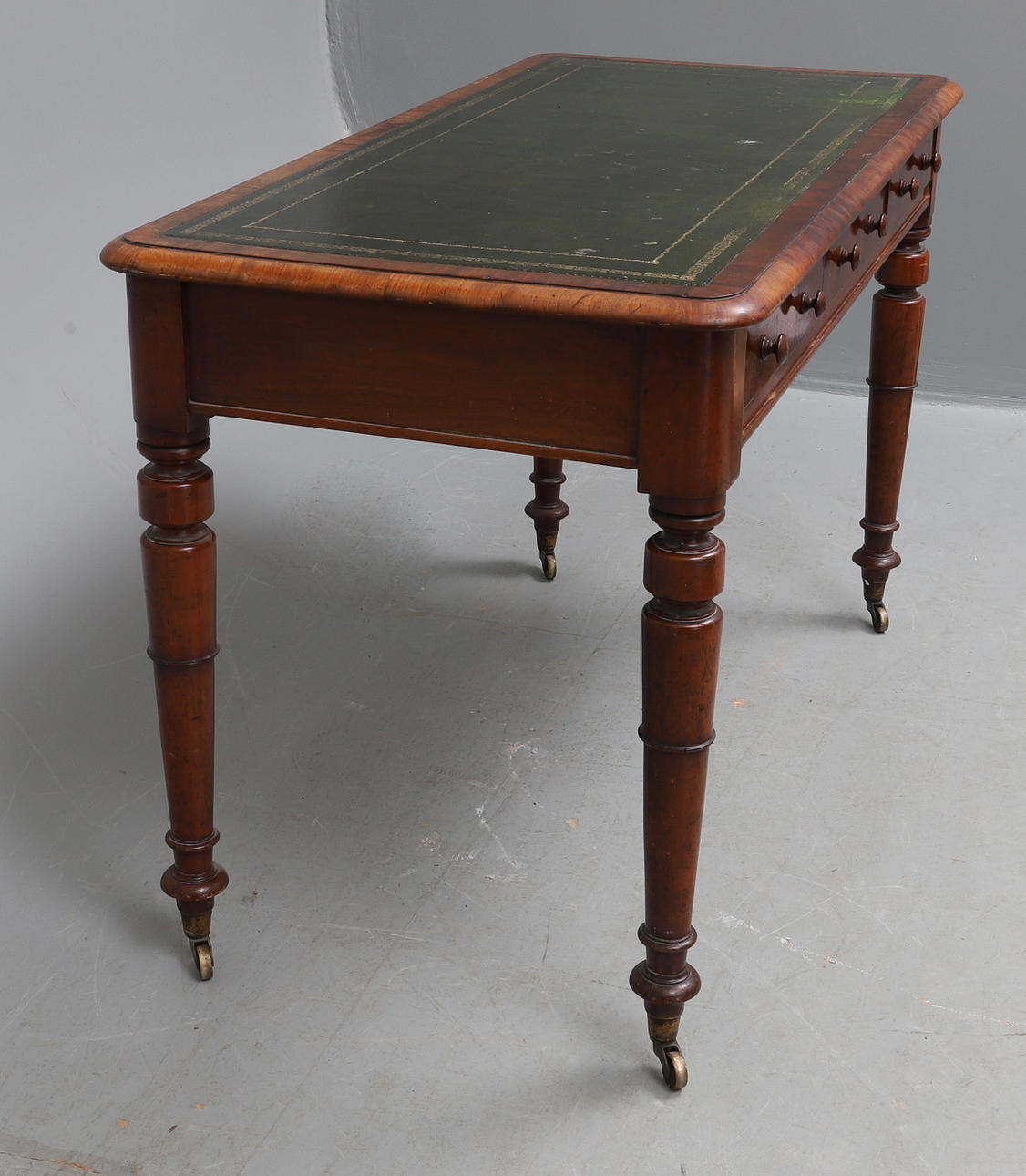 the moulded rectangular top inset with gilt tooled green leather, having three frieze drawers, on turned legs and castors, 122cm wide x 61cm deep x 78cm high.