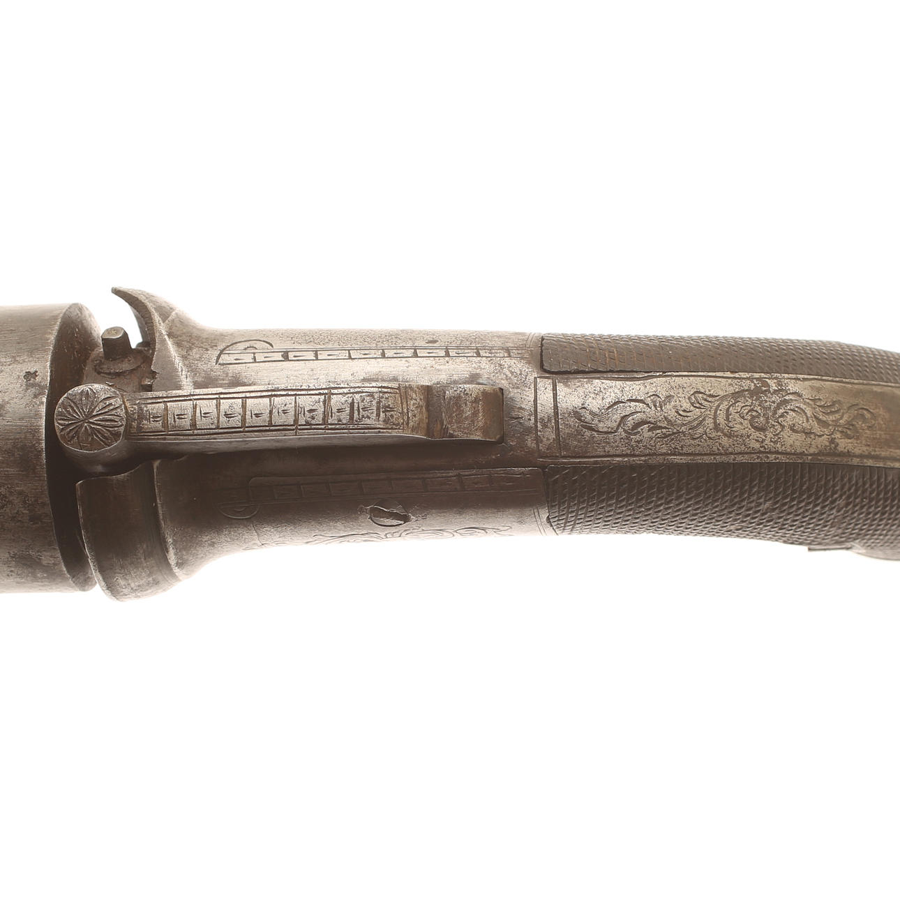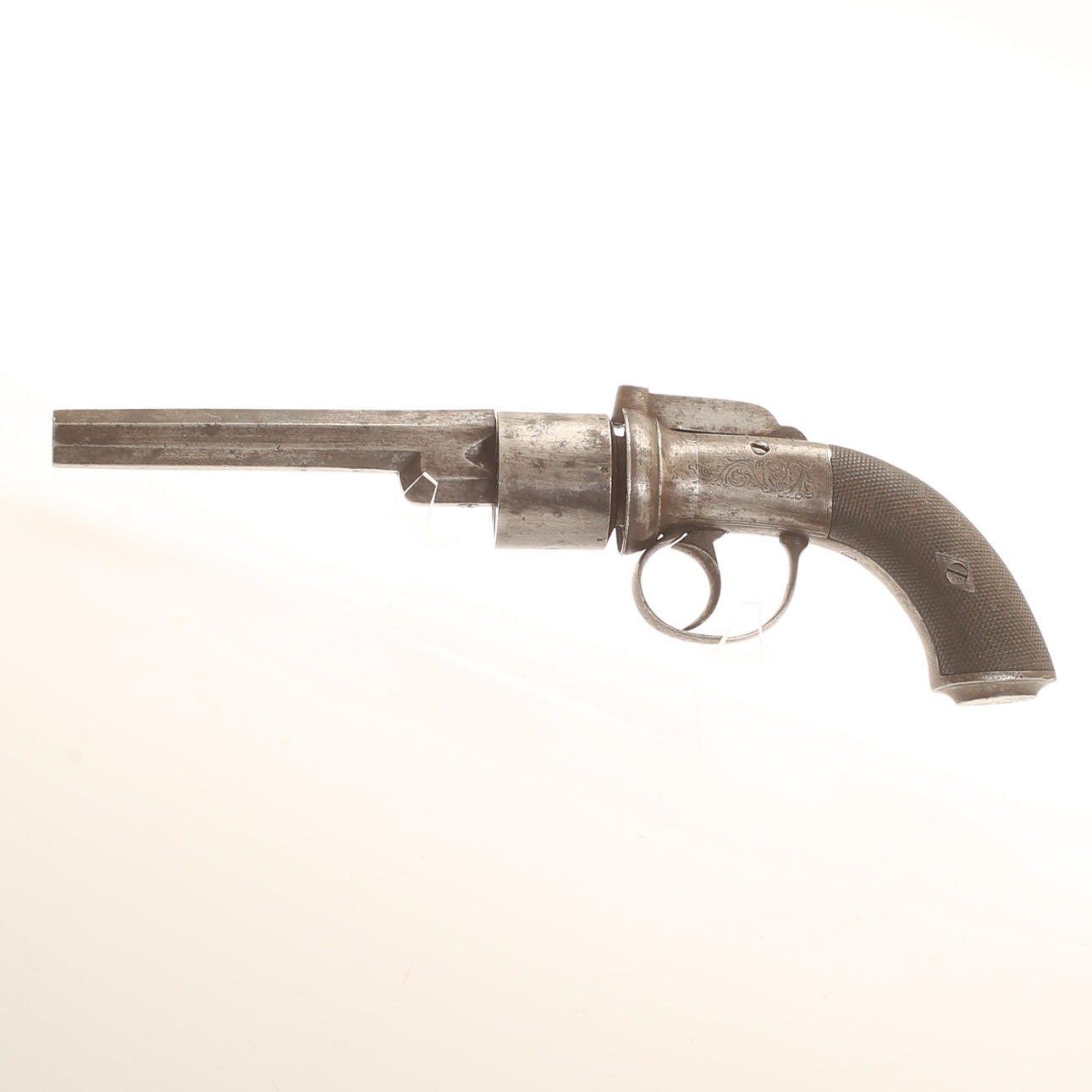 English percussion revolver of the transitional model, manufactured in the middle of the 19th century. Transition model between pepperbox pistols and real revolver. Double action. Netted piston, engraved body.