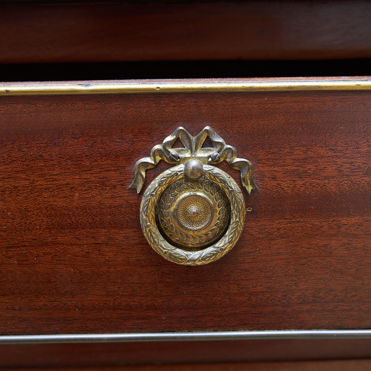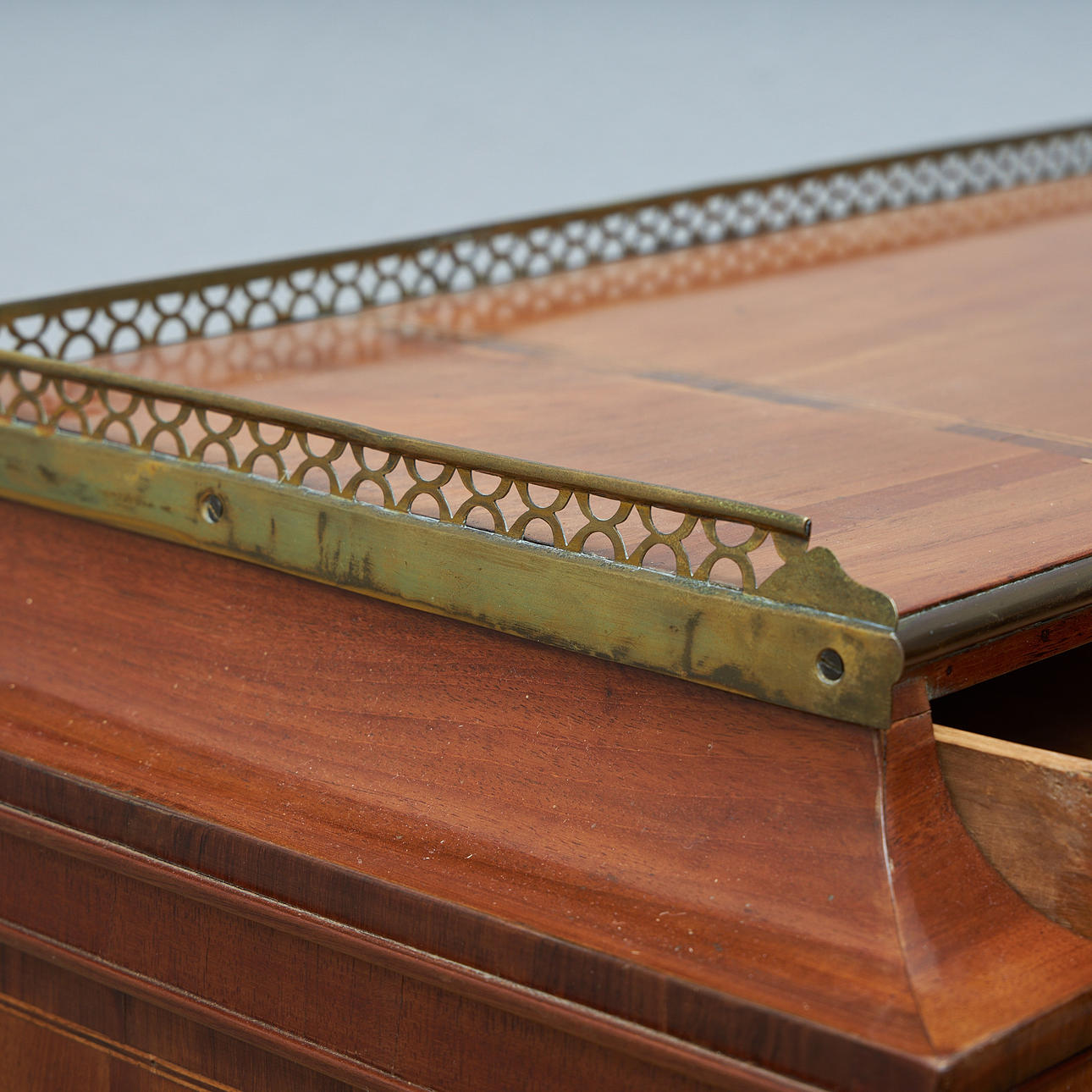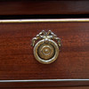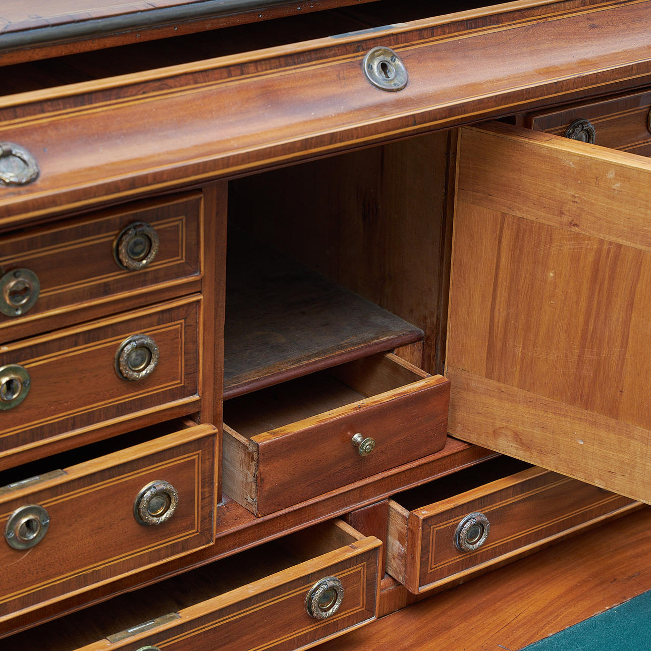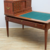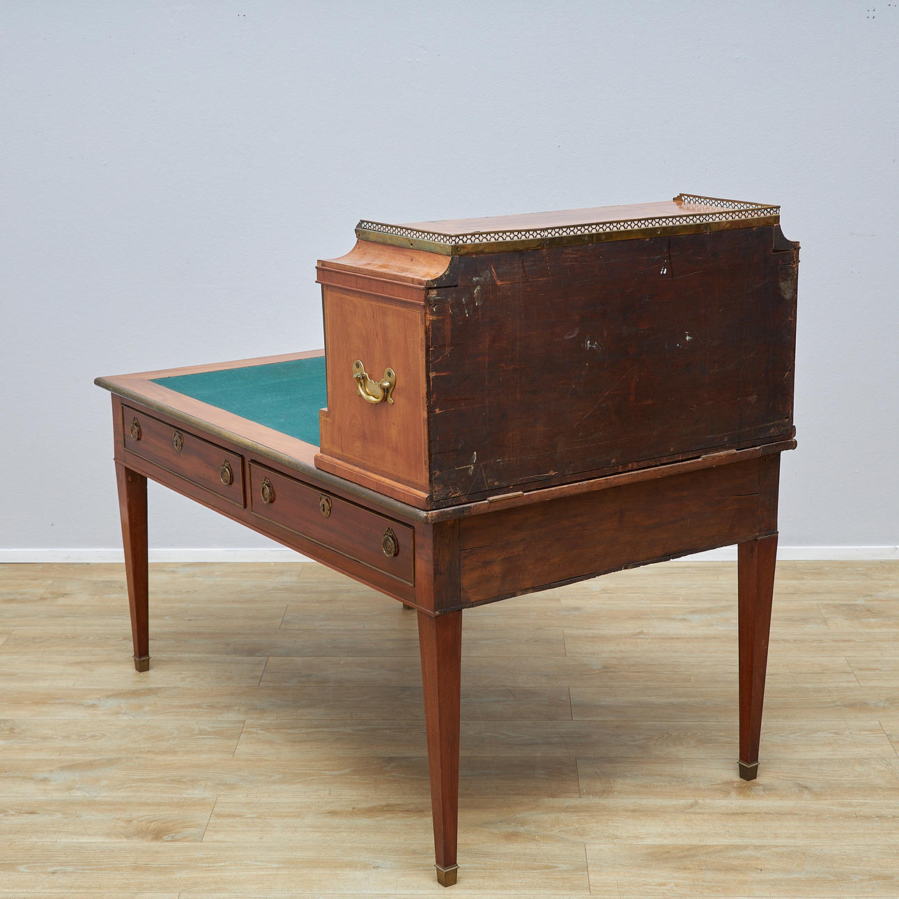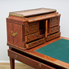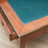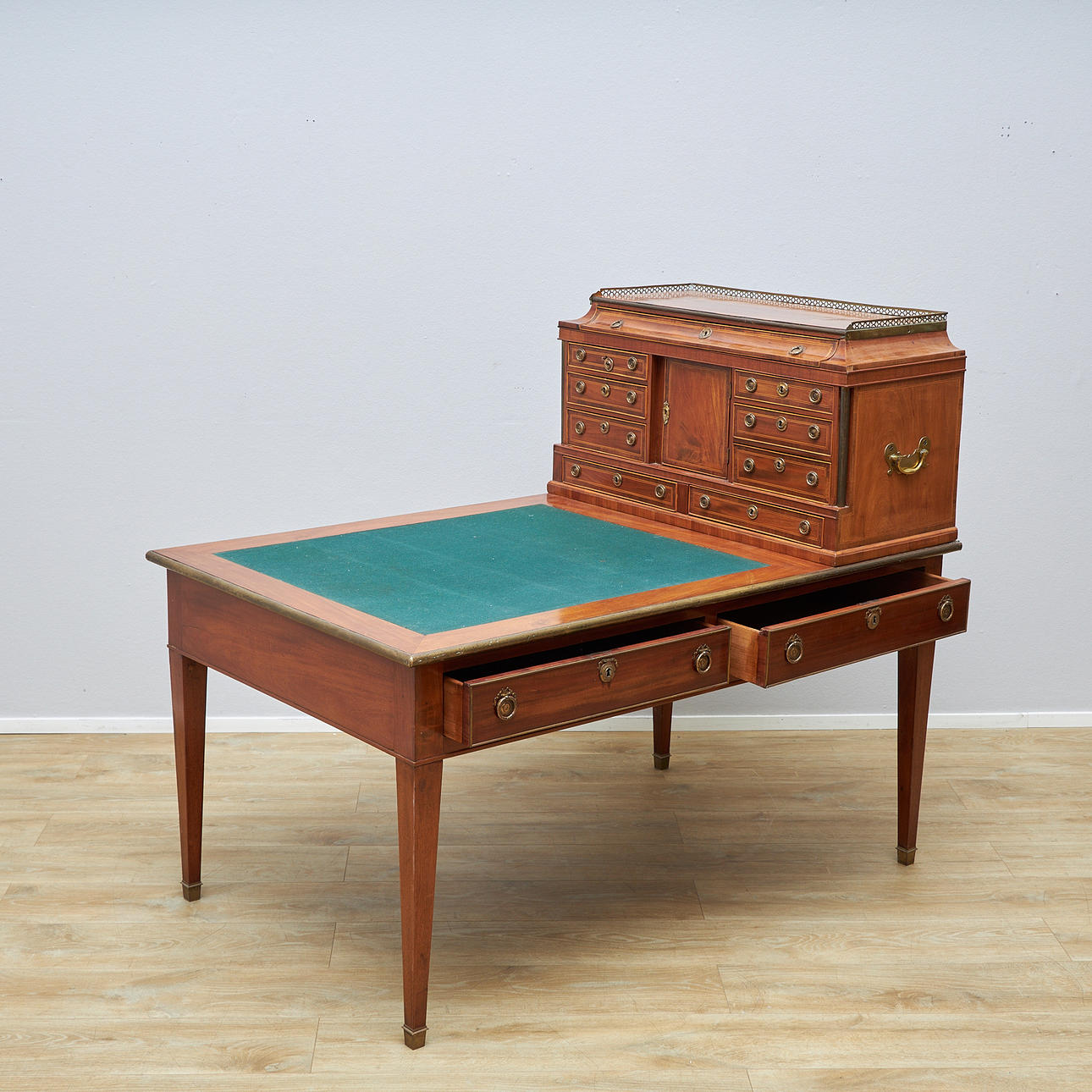 Mahogany and maple veneered, five drawers in three directions. Detachable unit with drawers and compartments. Fittings of brass. Table top covered with green baize. Length 147, width 95, height 77, total height 126.5 cm.